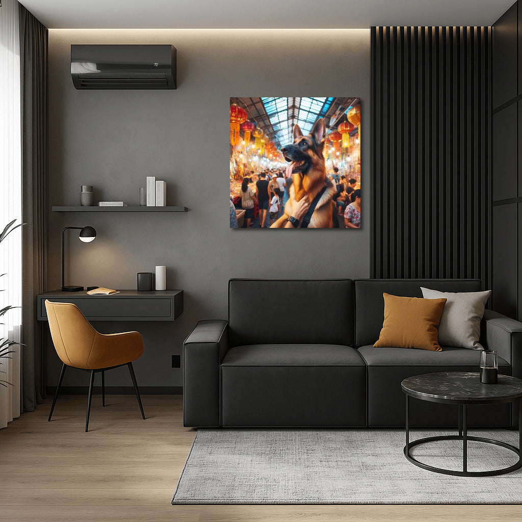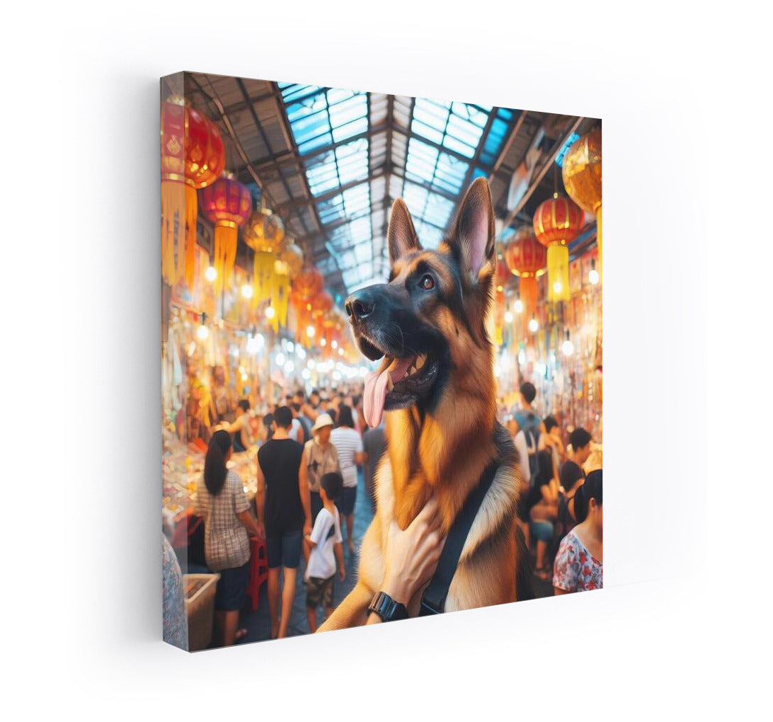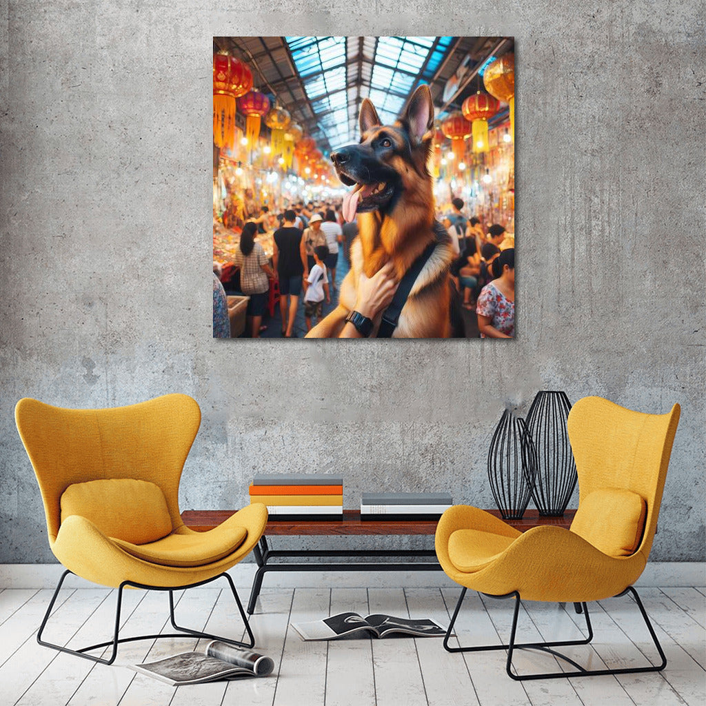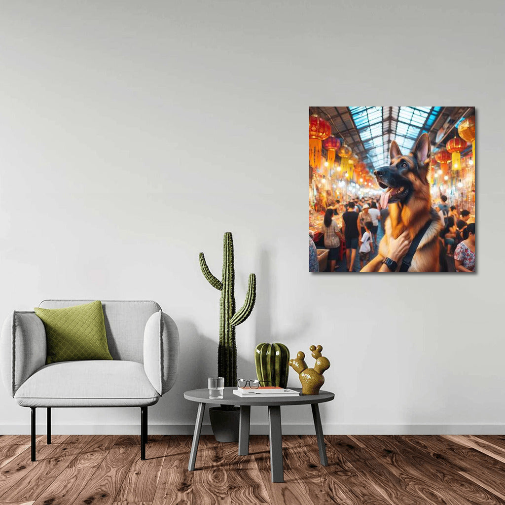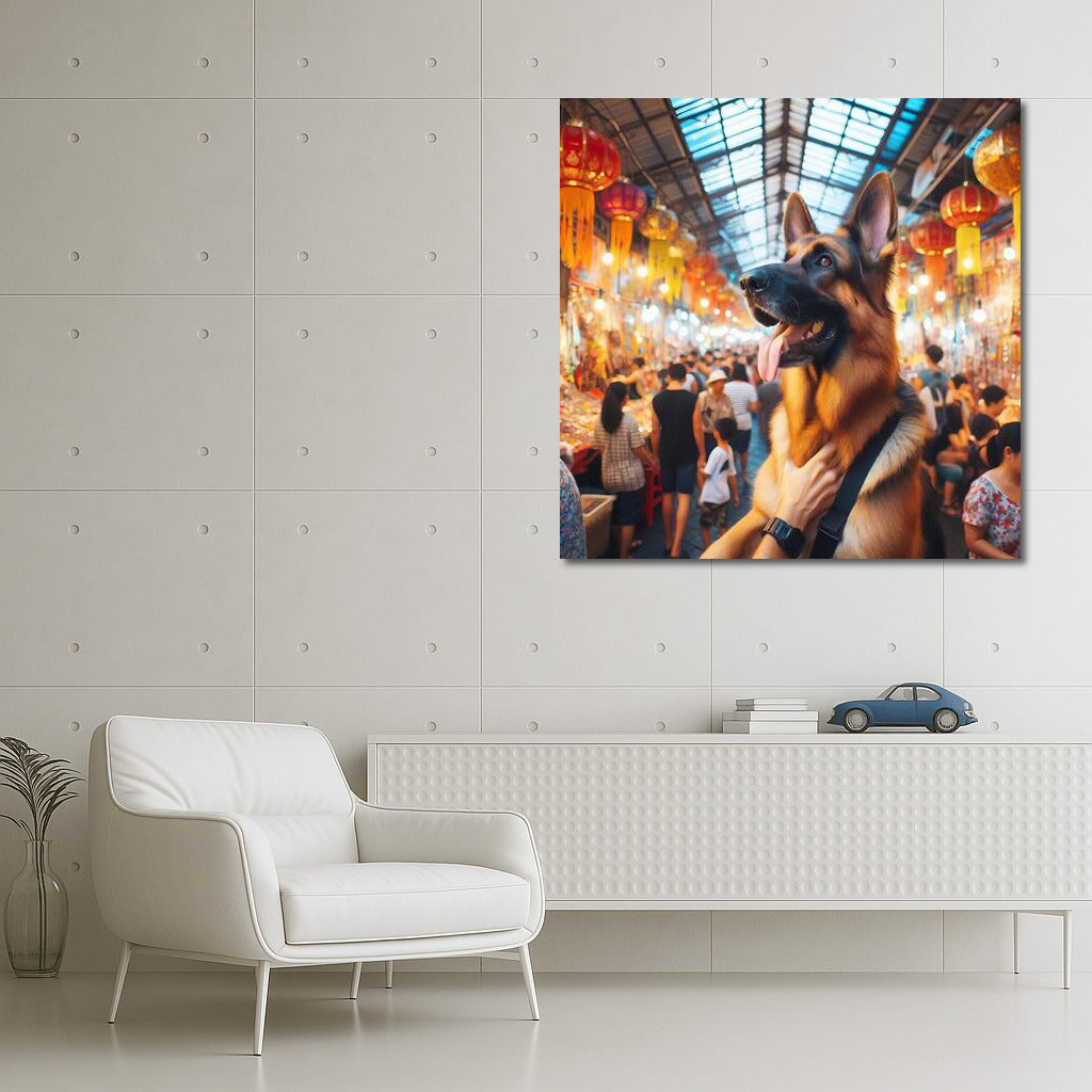 German Shepherd at a colorful Bangkok market Wall Art