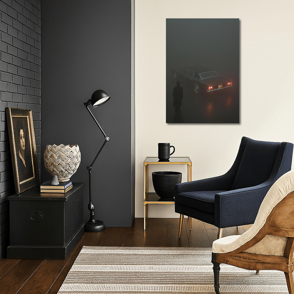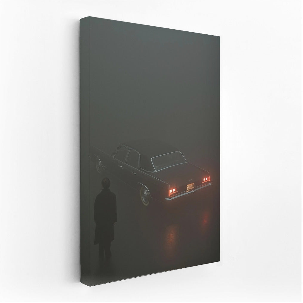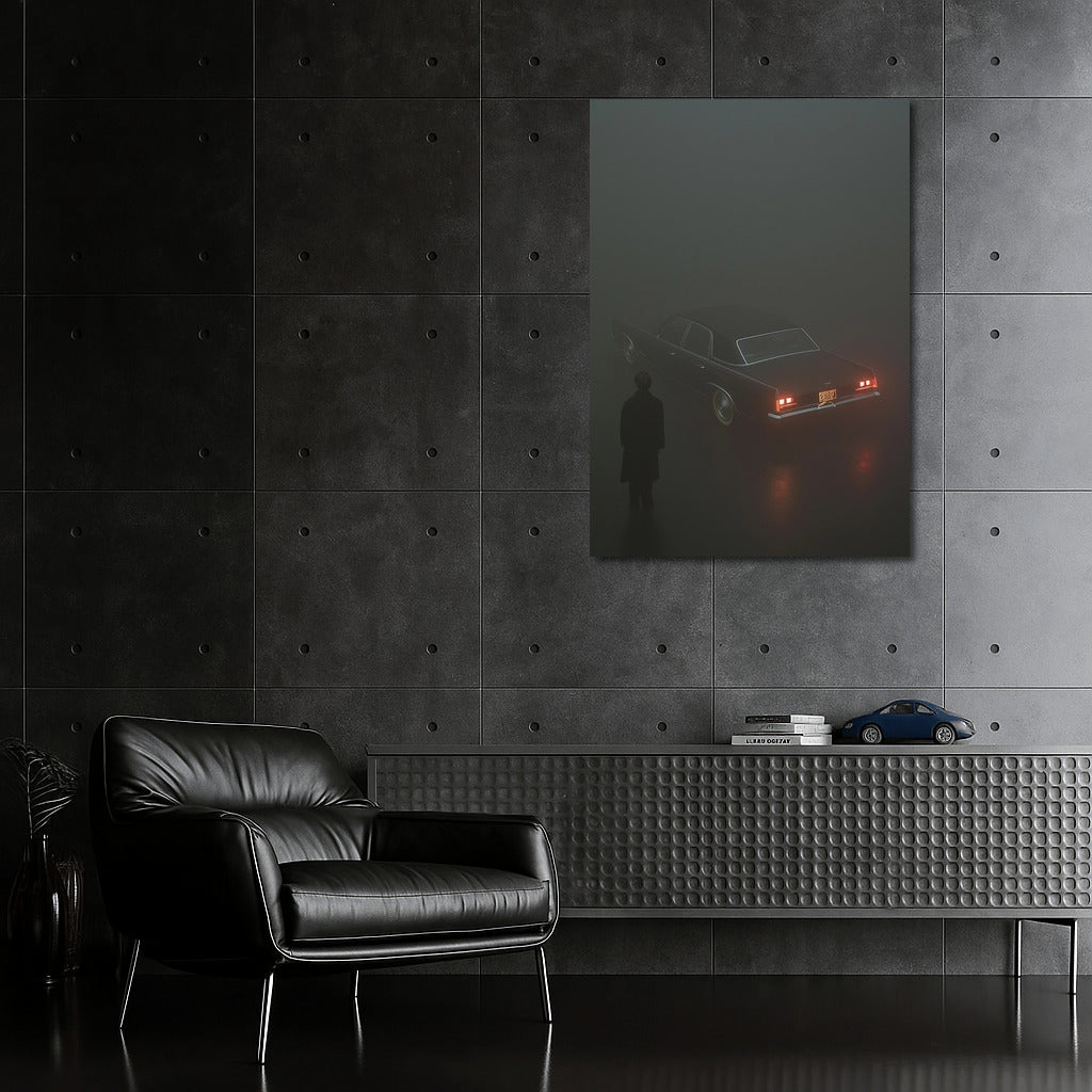 Misty Inspiration: Atmospheric painting with mysterious figure and retro car creates enigmatic wall art. See more from the collection: Mixed Wall Art