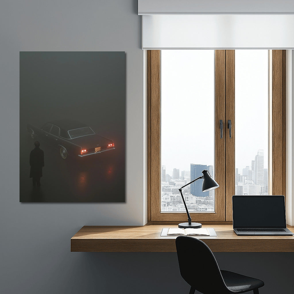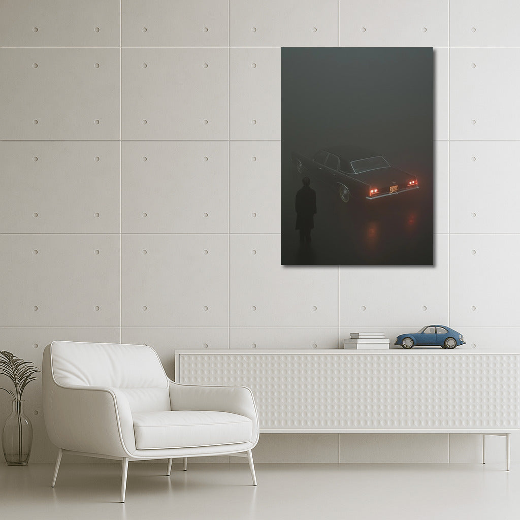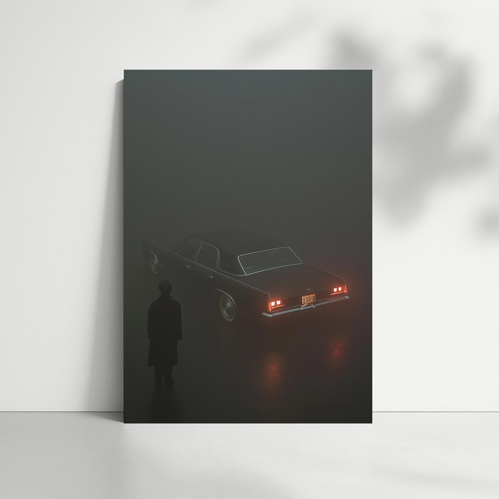 Misty Inspiration: Atmospheric painting with mysterious figure and retro car creates enigmatic wall art. See more from the collection: Mixed Wall Art