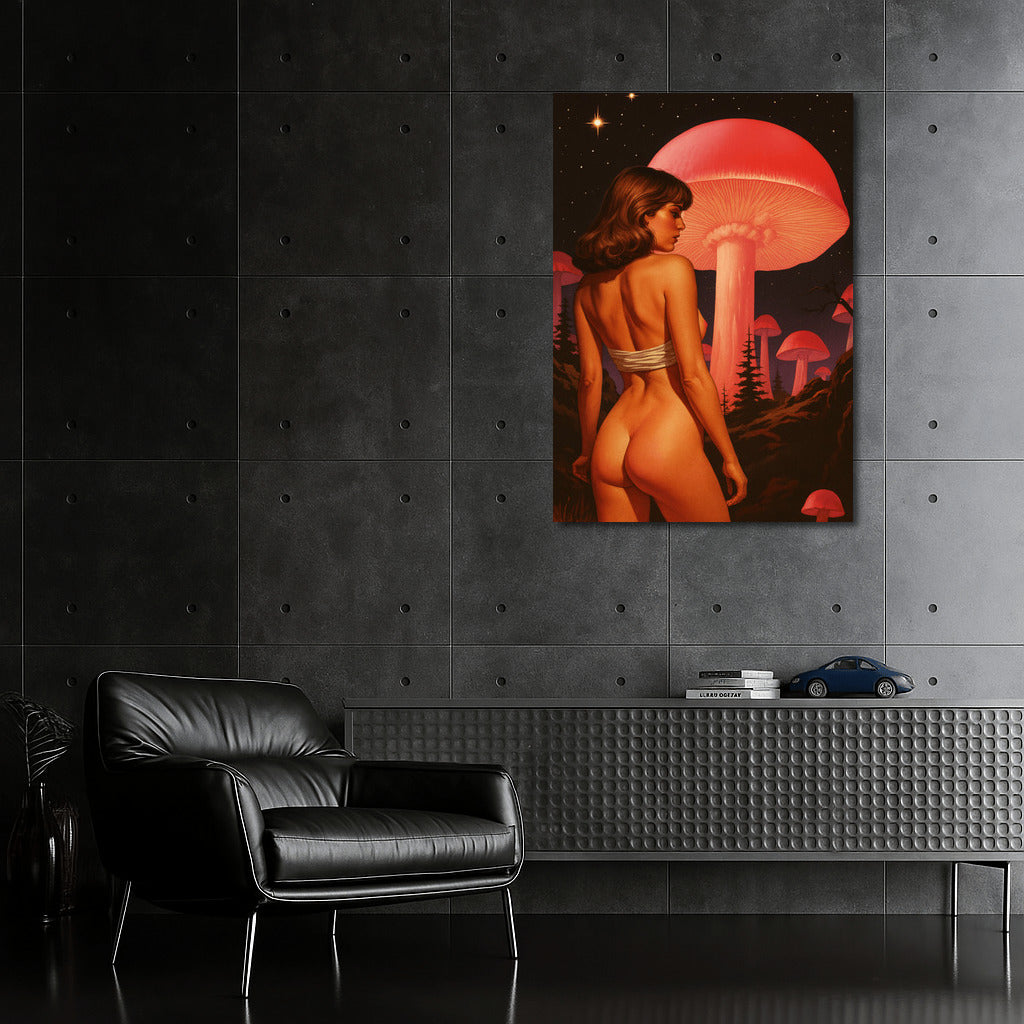 The poster takes you to a fantasy world with giant mushrooms and a starry sky. Trippy wall art for bold interiors. See more from the collection: Trippy & Psychedelic Art