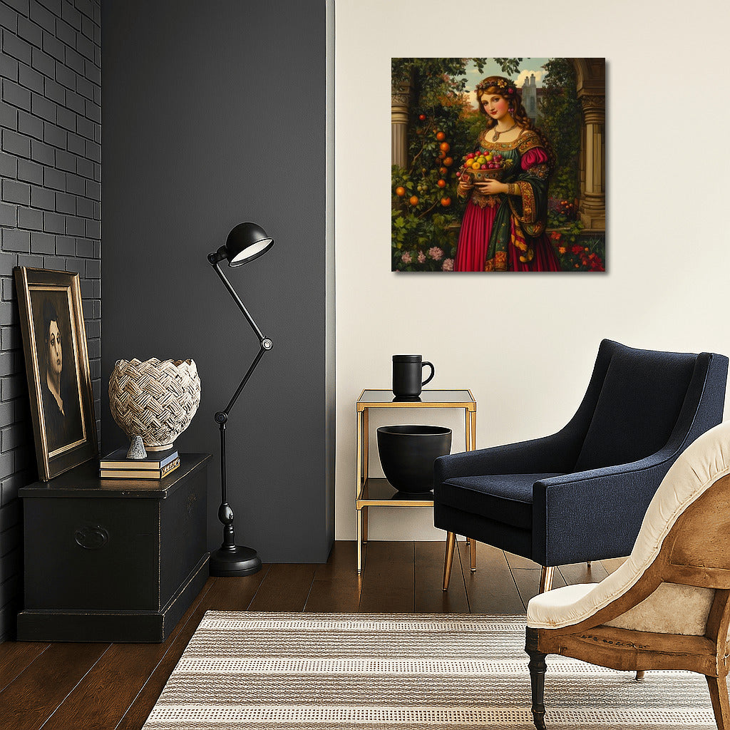 Old-time charm: poster with a mysterious figure in a garden bearing fruit. Wall art for lovers of classics. ?? See more from the collection: Mixed Wall Art