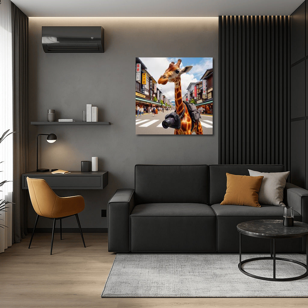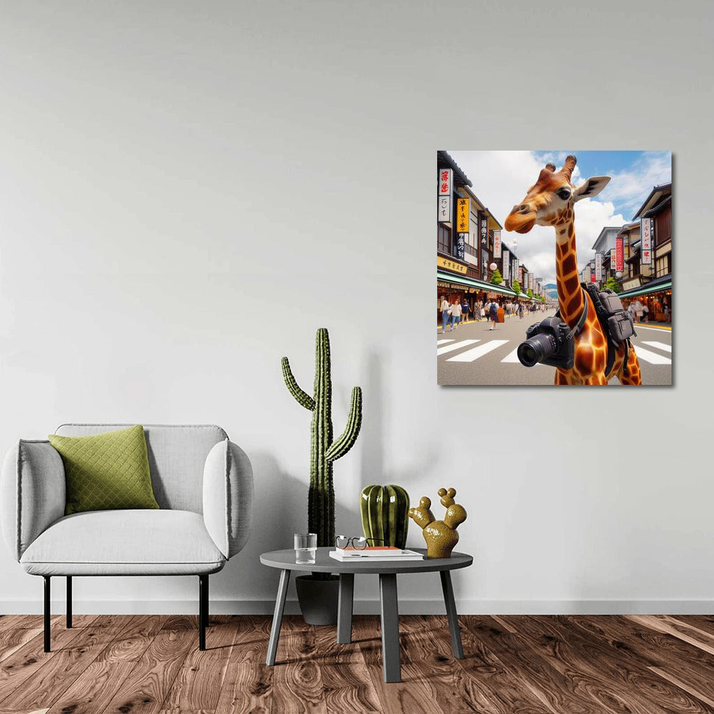 A traveling giraffe with a camera explores the streets of Japan. Unusual wall art that will inspire and bring a smile. See more from the collection: Animals Art