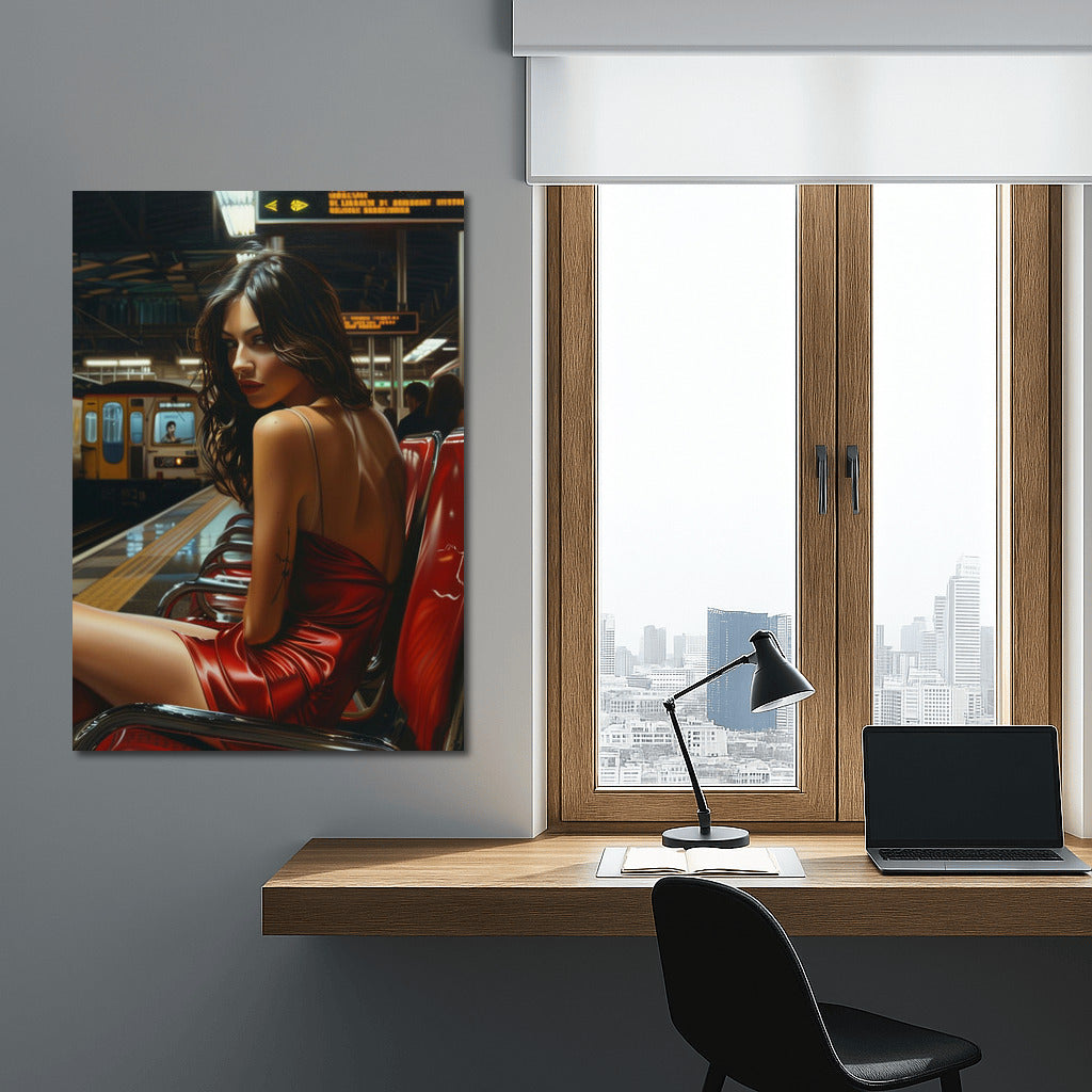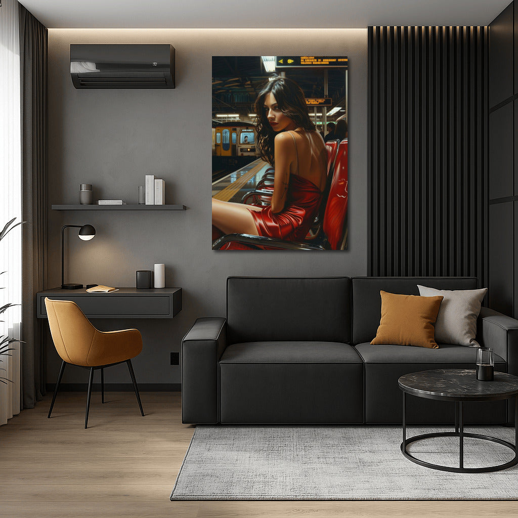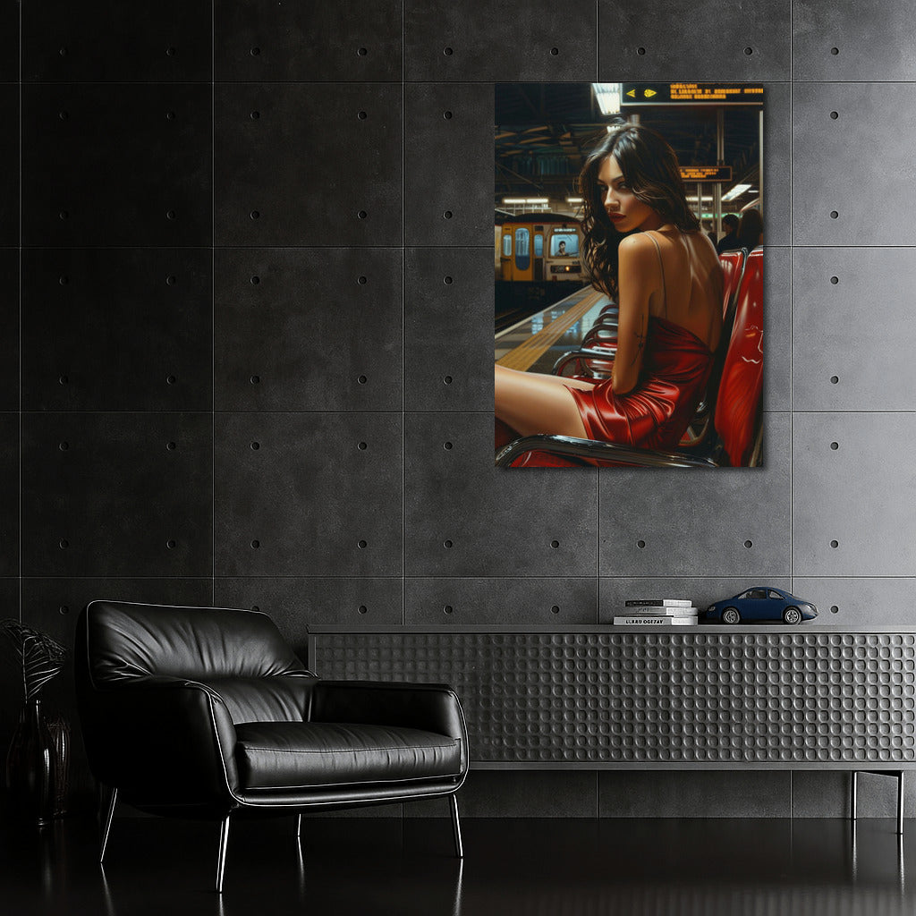 A vibrant painting of a girl in a red dress at a subway station. Wall art that captivates and attracts attention. See more from the collection: Wall Art with Women