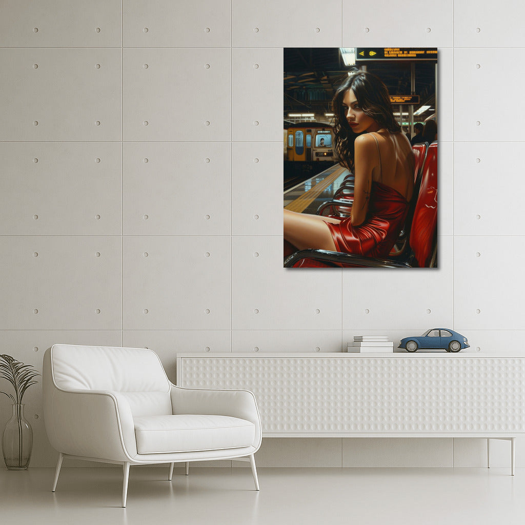 Girl in Red Dress at Metro Station: Vivid Portrait Wall Art