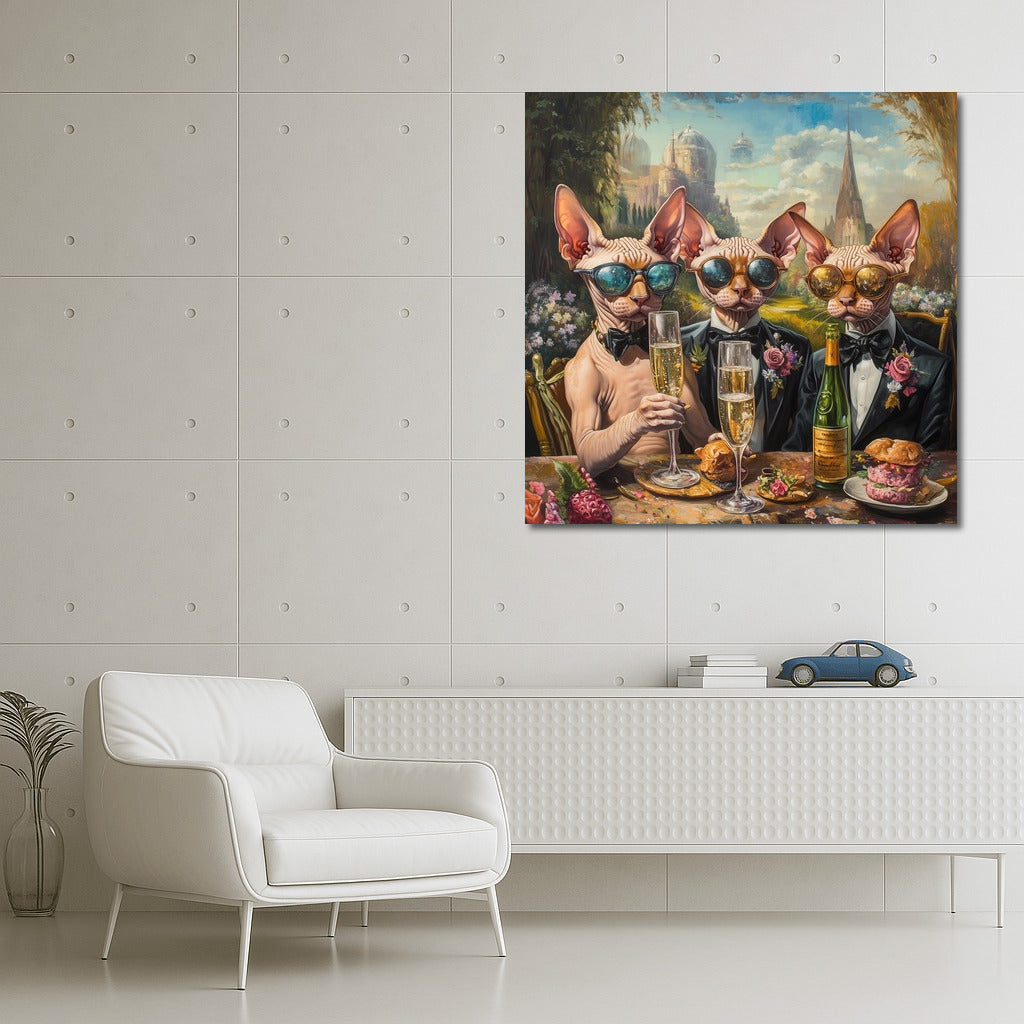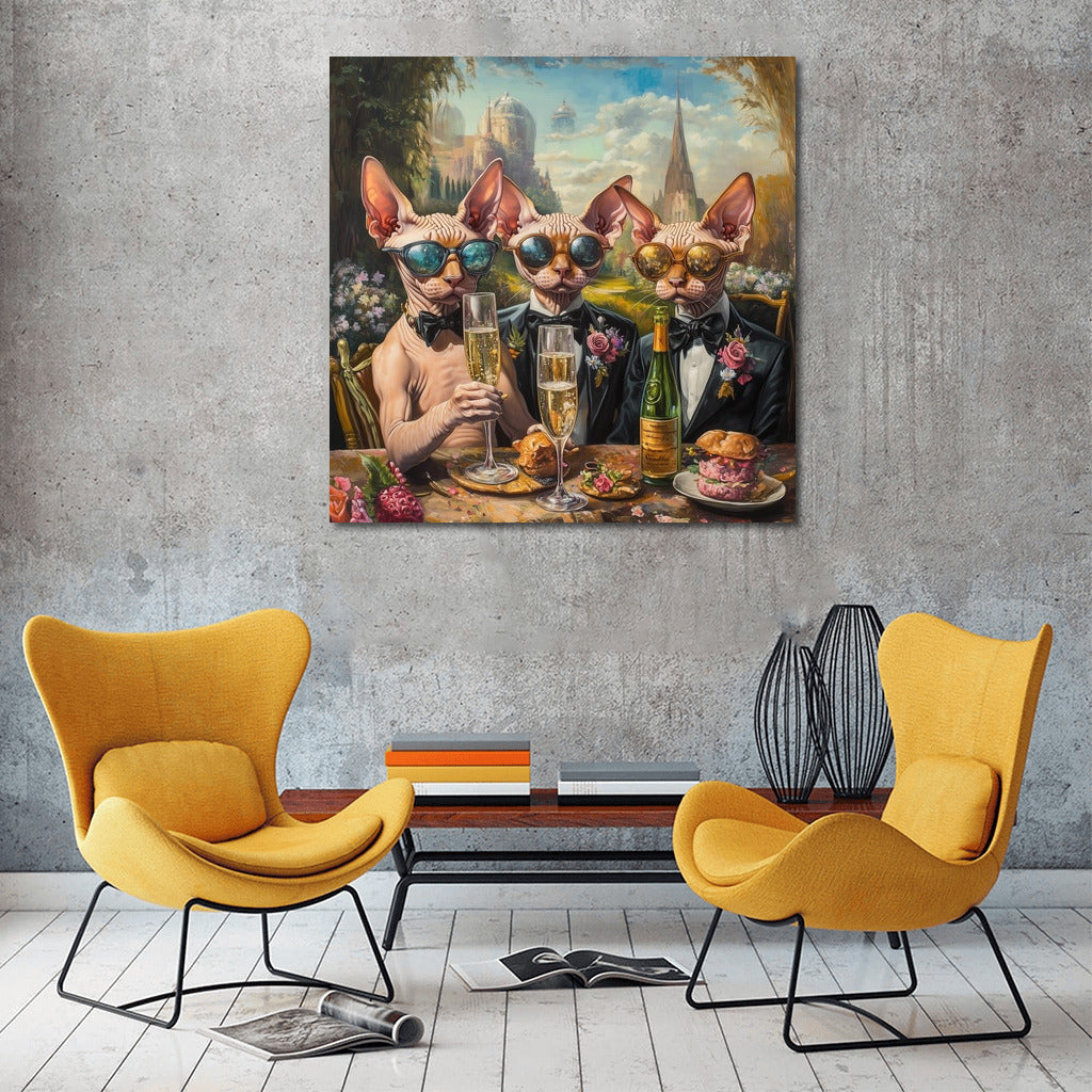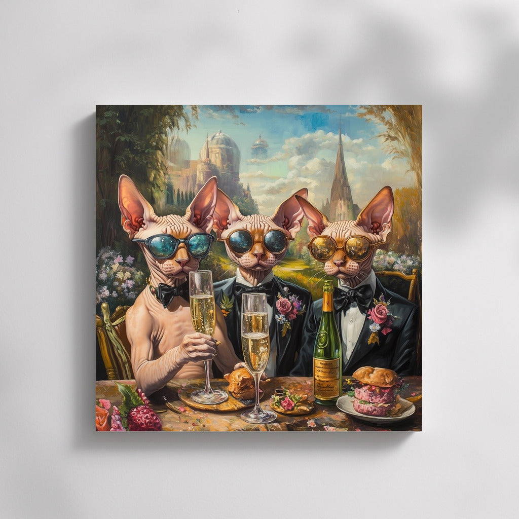 Modern wall art: stylish cats in glasses and tuxedos on a picnic with champagne. The perfect poster for a bright interior! See more from the collection: Animals Art