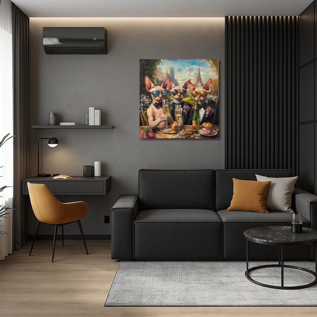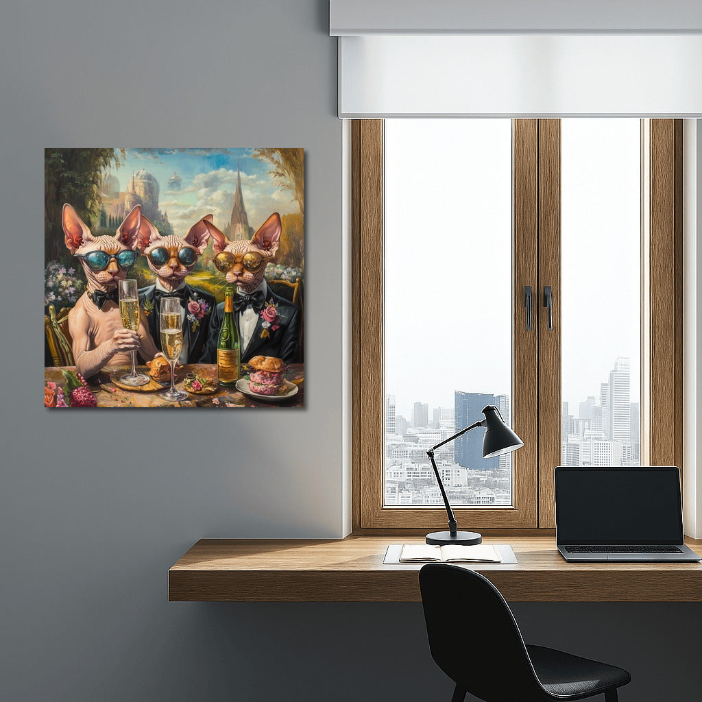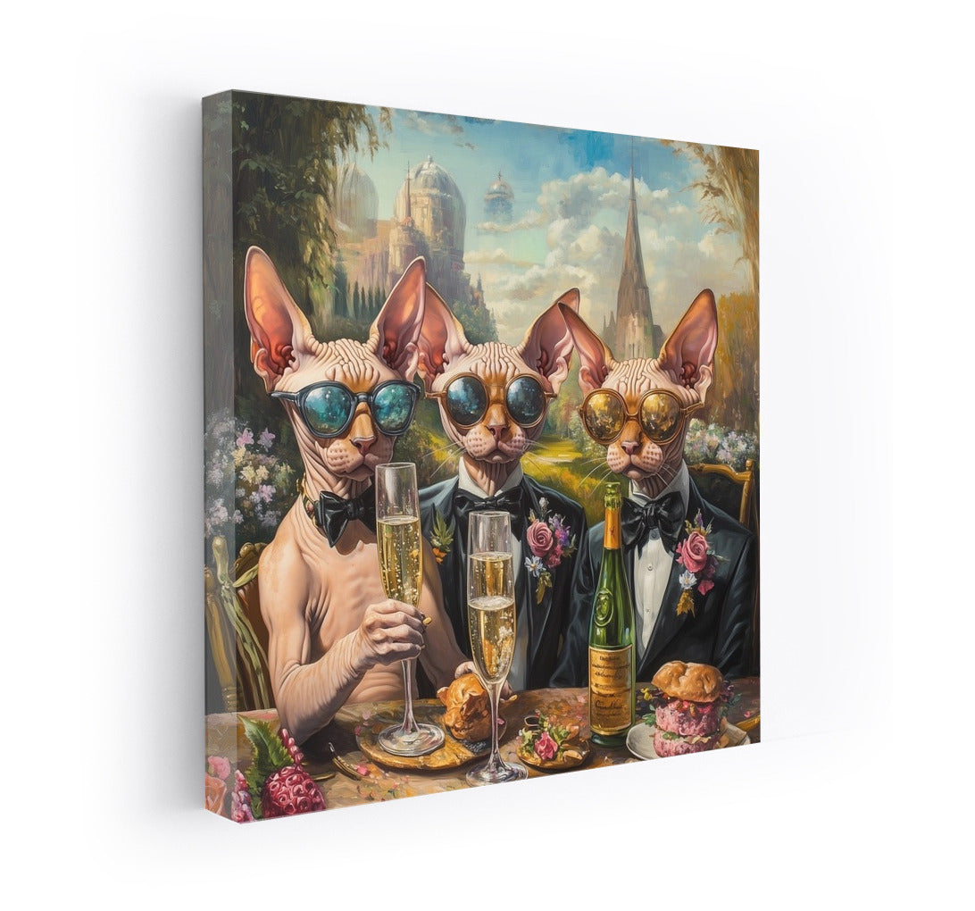 Modern wall art: stylish cats in glasses and tuxedos on a picnic with champagne. The perfect poster for a bright interior! See more from the collection: Animals Art