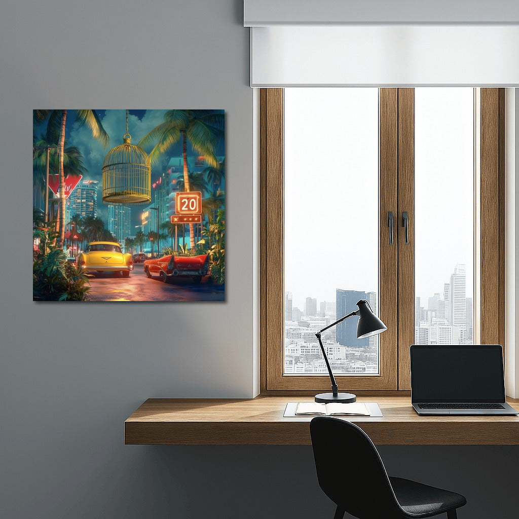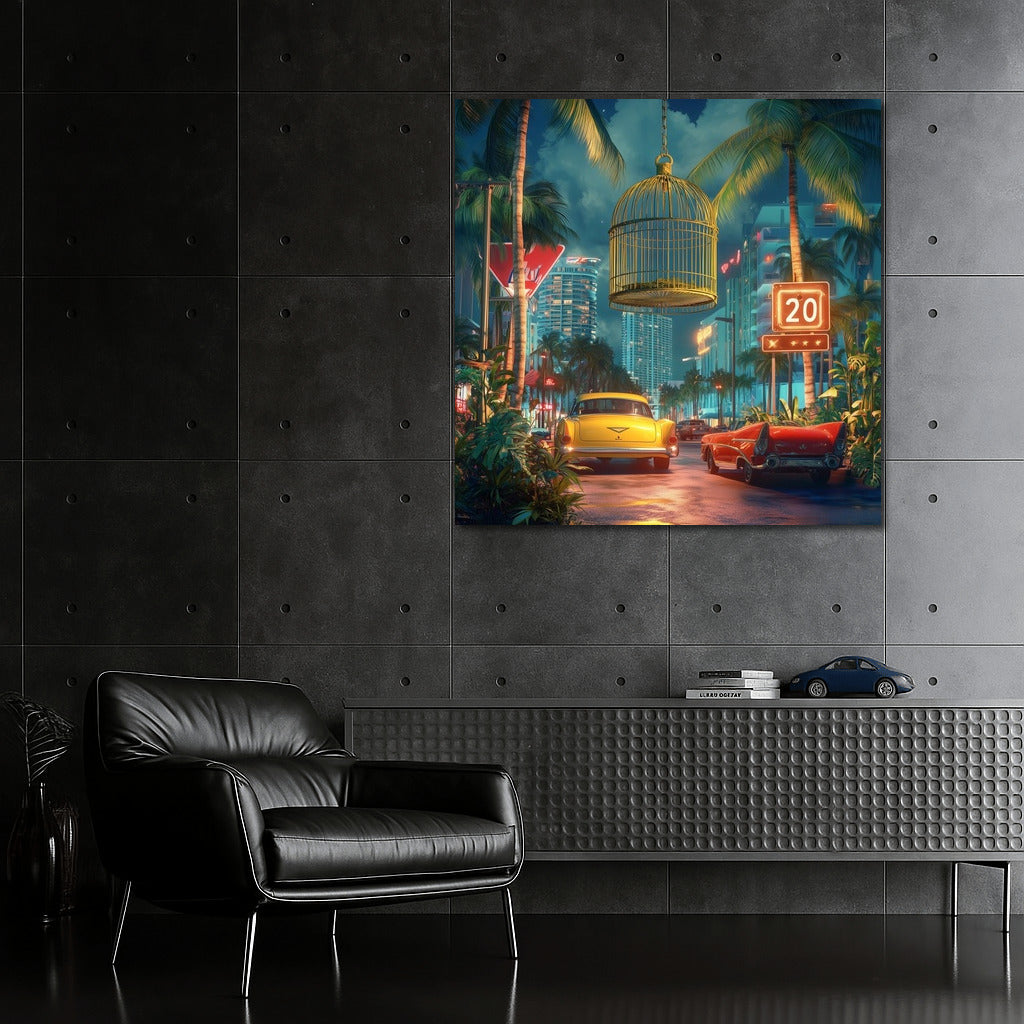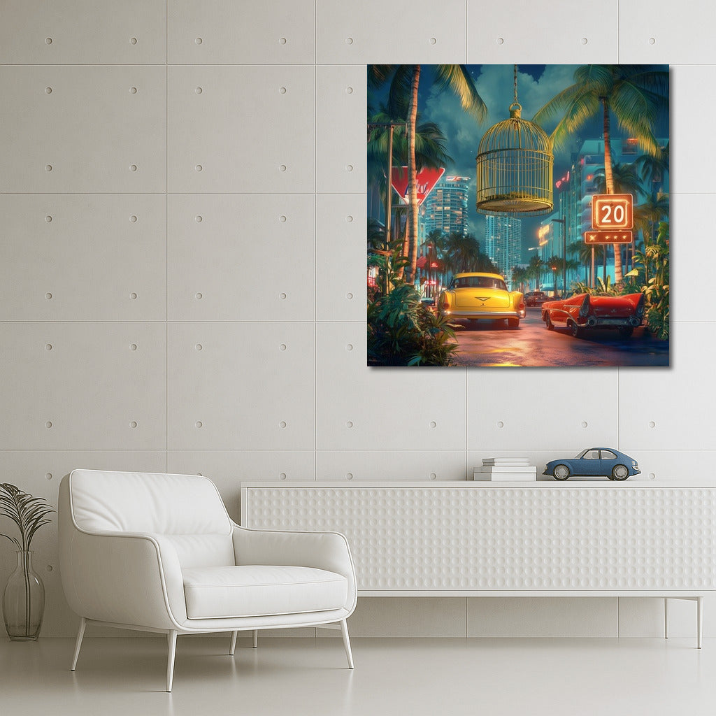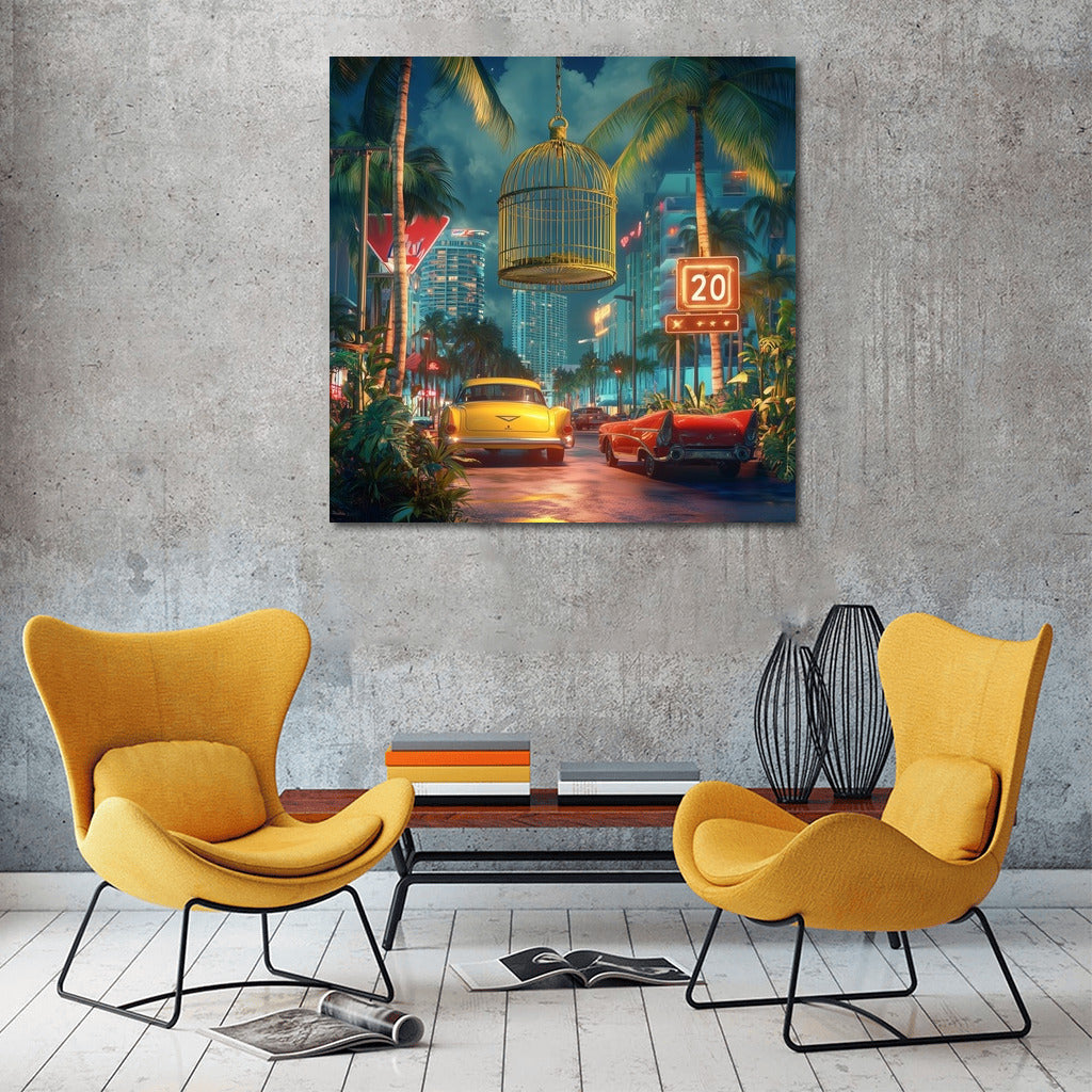 Retro atmosphere of the night city. Bright poster with classic cars and a golden cage in the light of palm trees. Dream wall art! See more from the collection: Mixed Wall Art