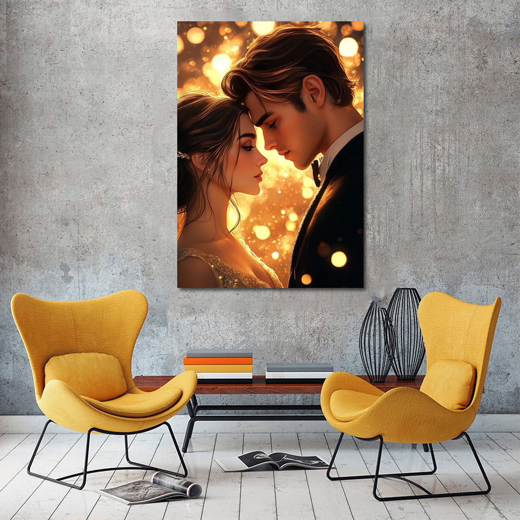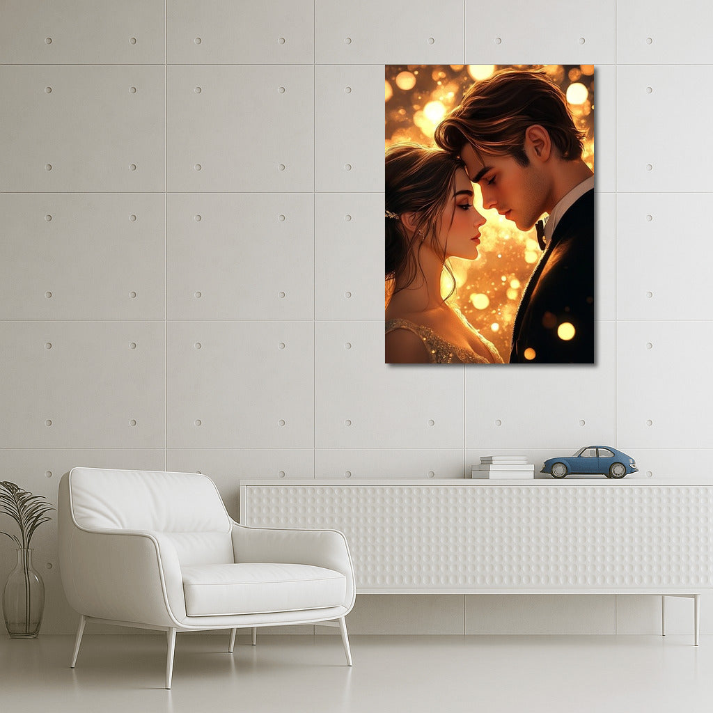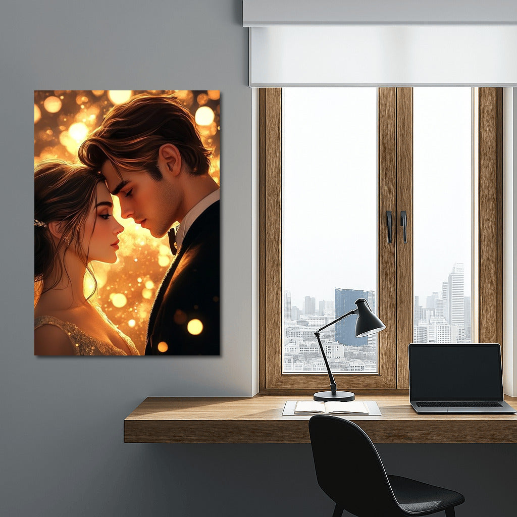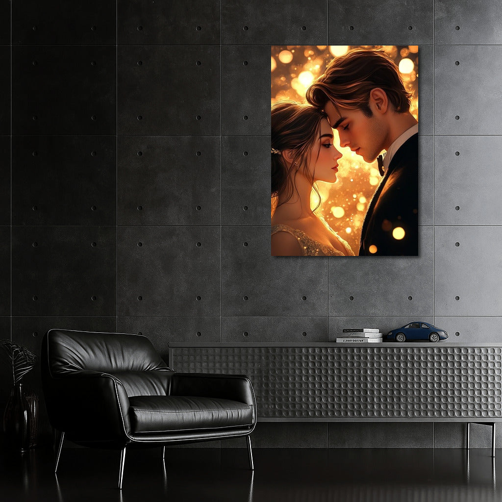 Sparkling tenderness: poster of a couple against a golden light. Wall art that embodies the magic of moments and love. See more from the collection: Love Art