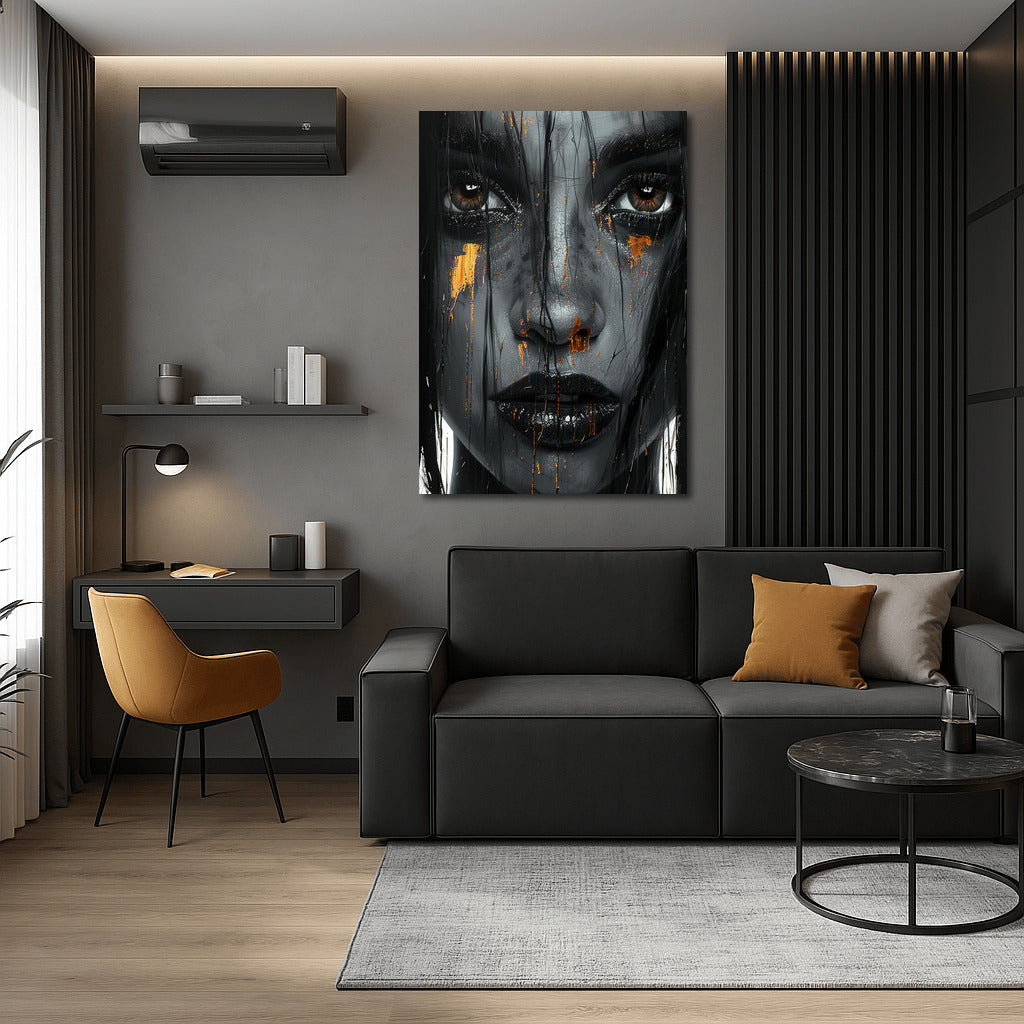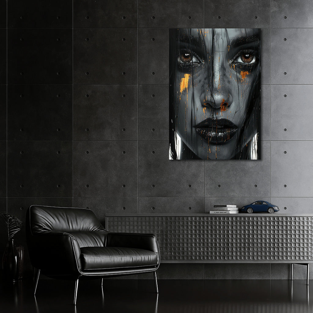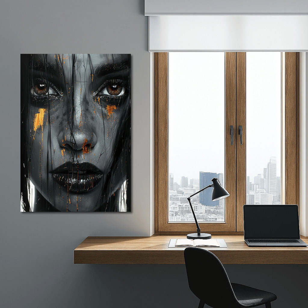 Dive into the depths of emotions with a mysterious poster - a portrait of a dark-skinned girl with accents of golden brushstrokes. Wall art comes to life! See more from the collection: Wall Art with Women