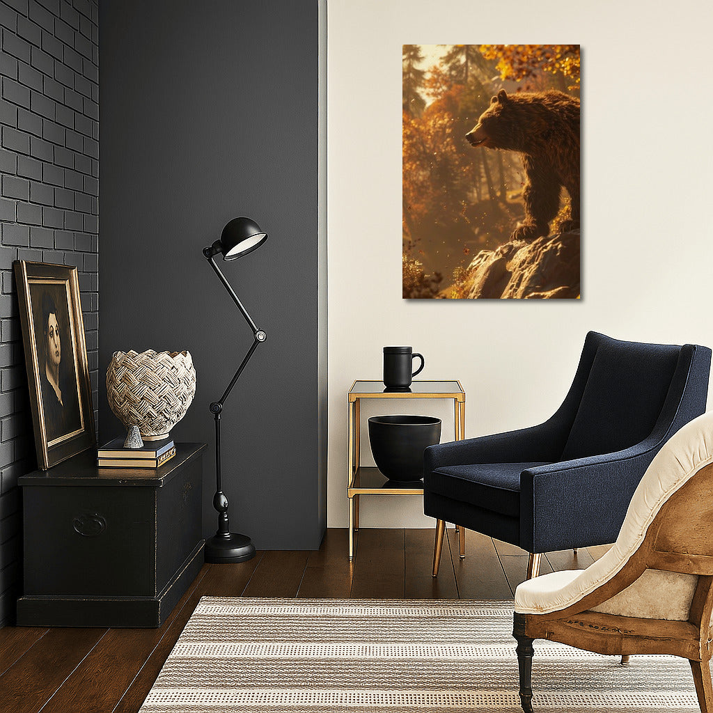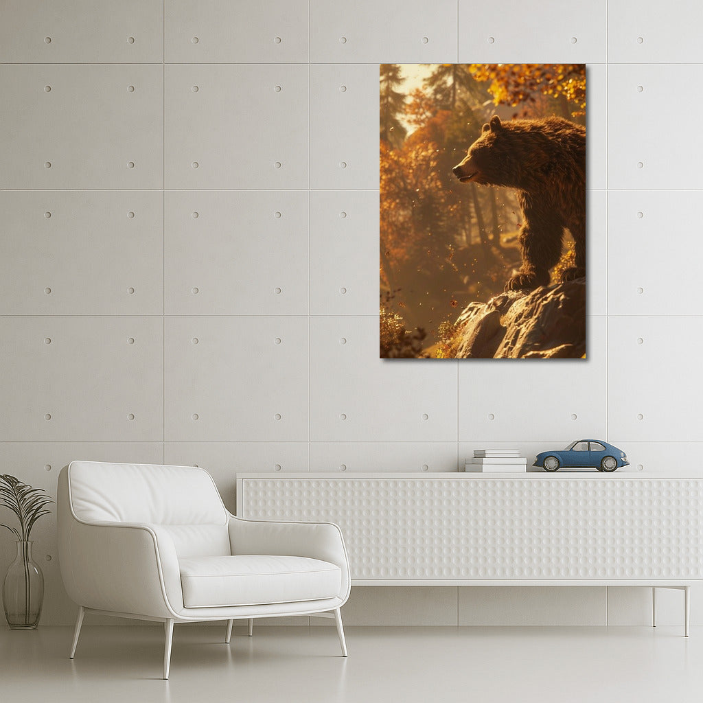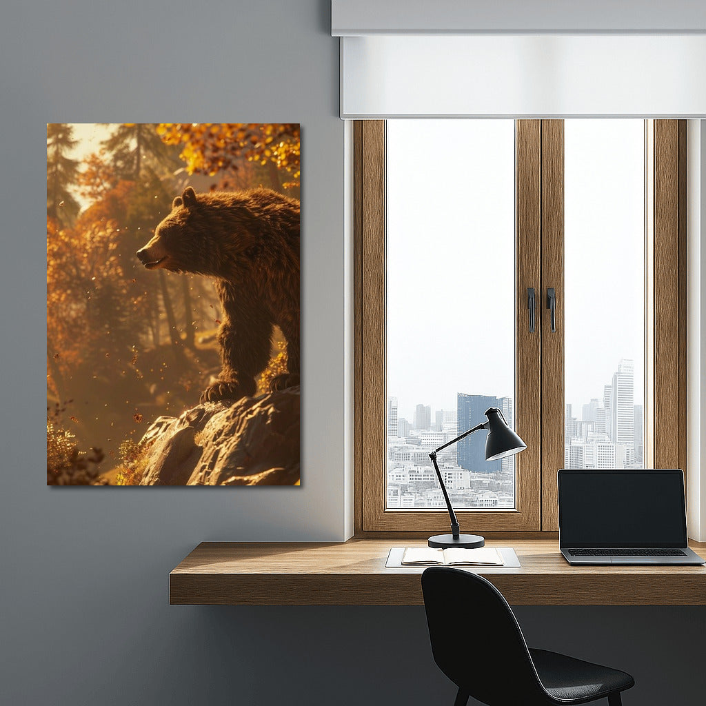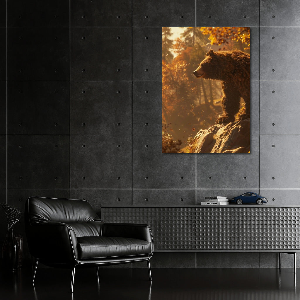 Immerse yourself in the autumn forest with this mesmerizing bear poster with golden trees. Wall art of nature and strength. See more from the collection: Animals Art
