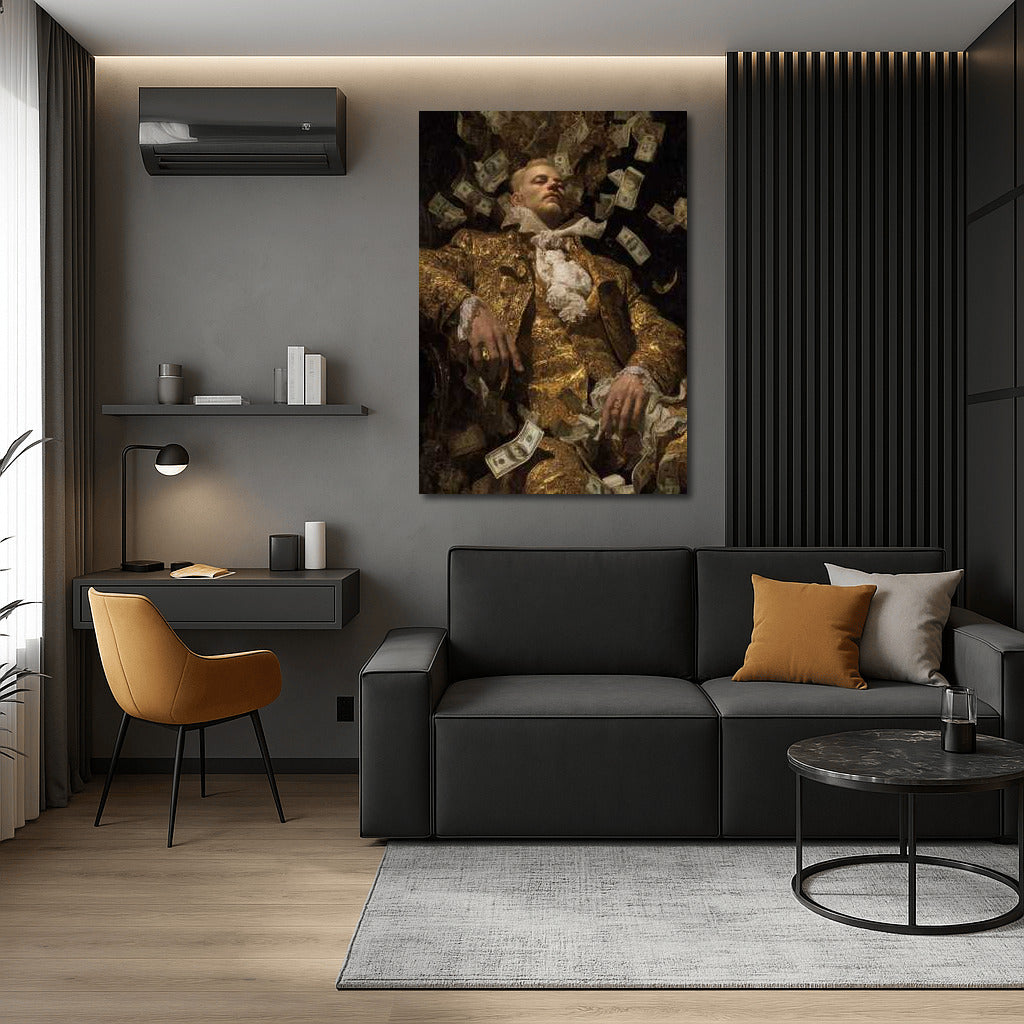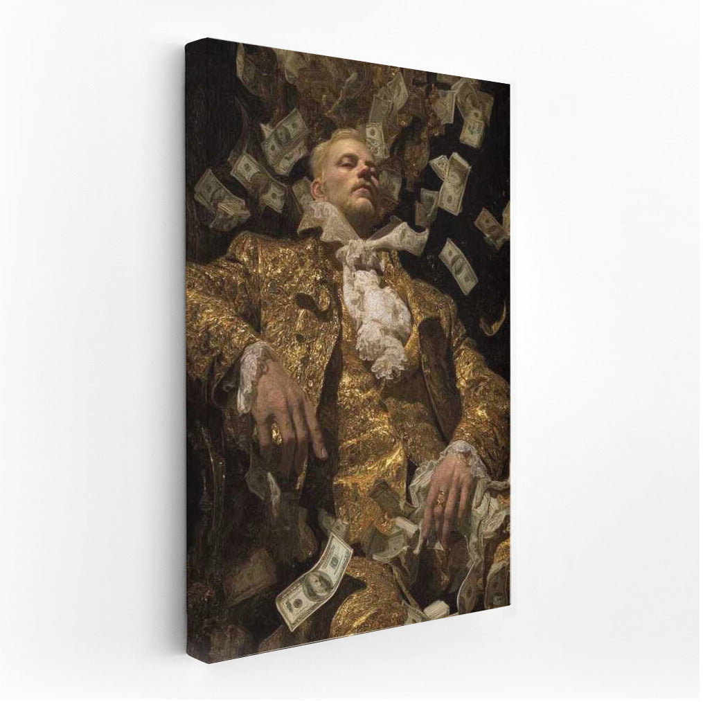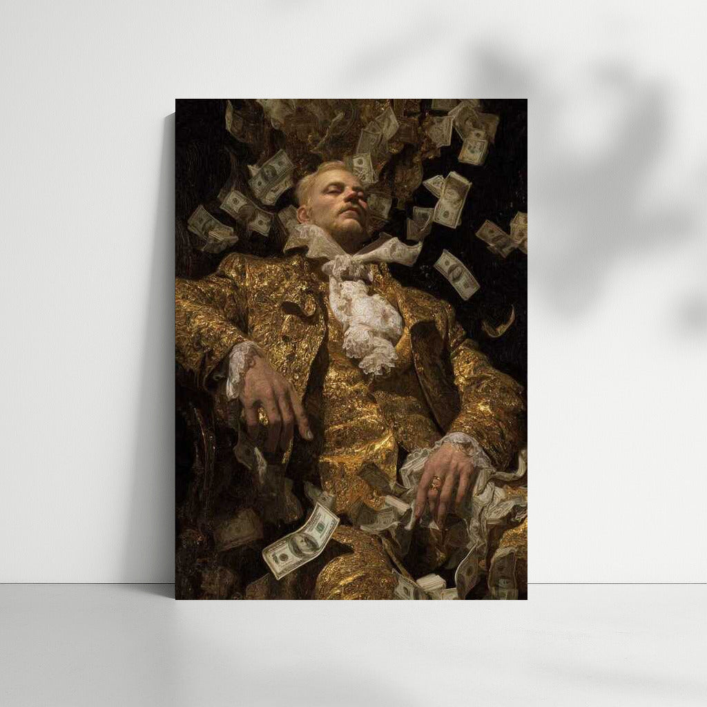 Luxurious wall art: a character surrounded by gold and falling banknotes. Feel the atmosphere of abundance and grandeur. See more from the collection: Money Art