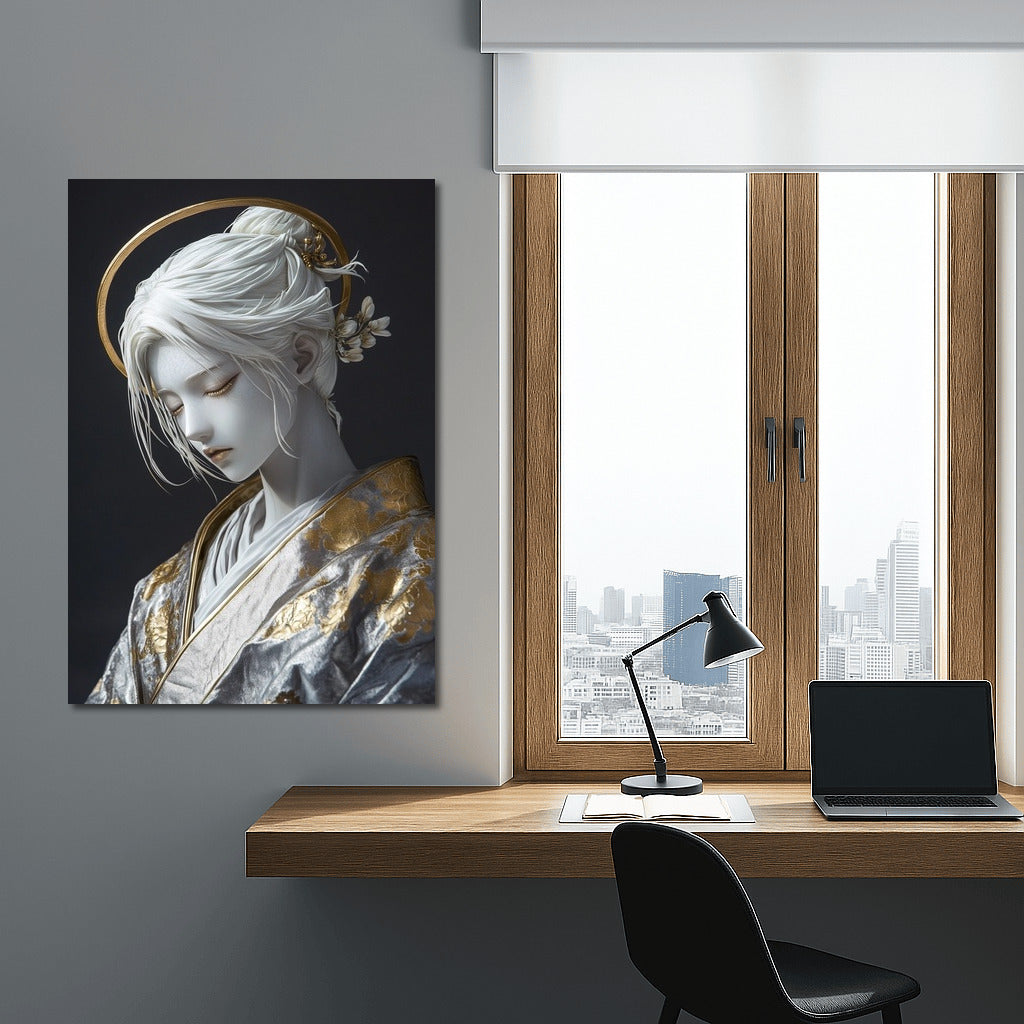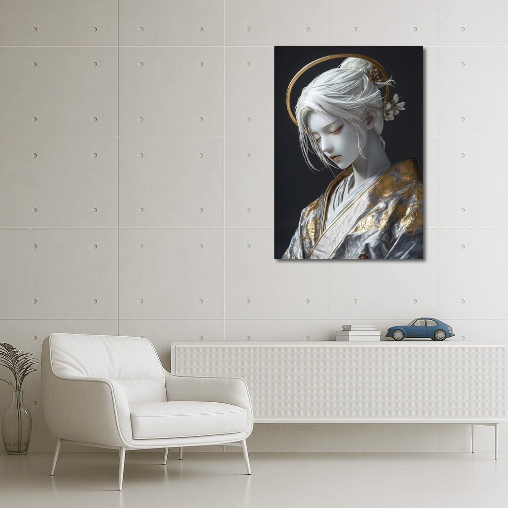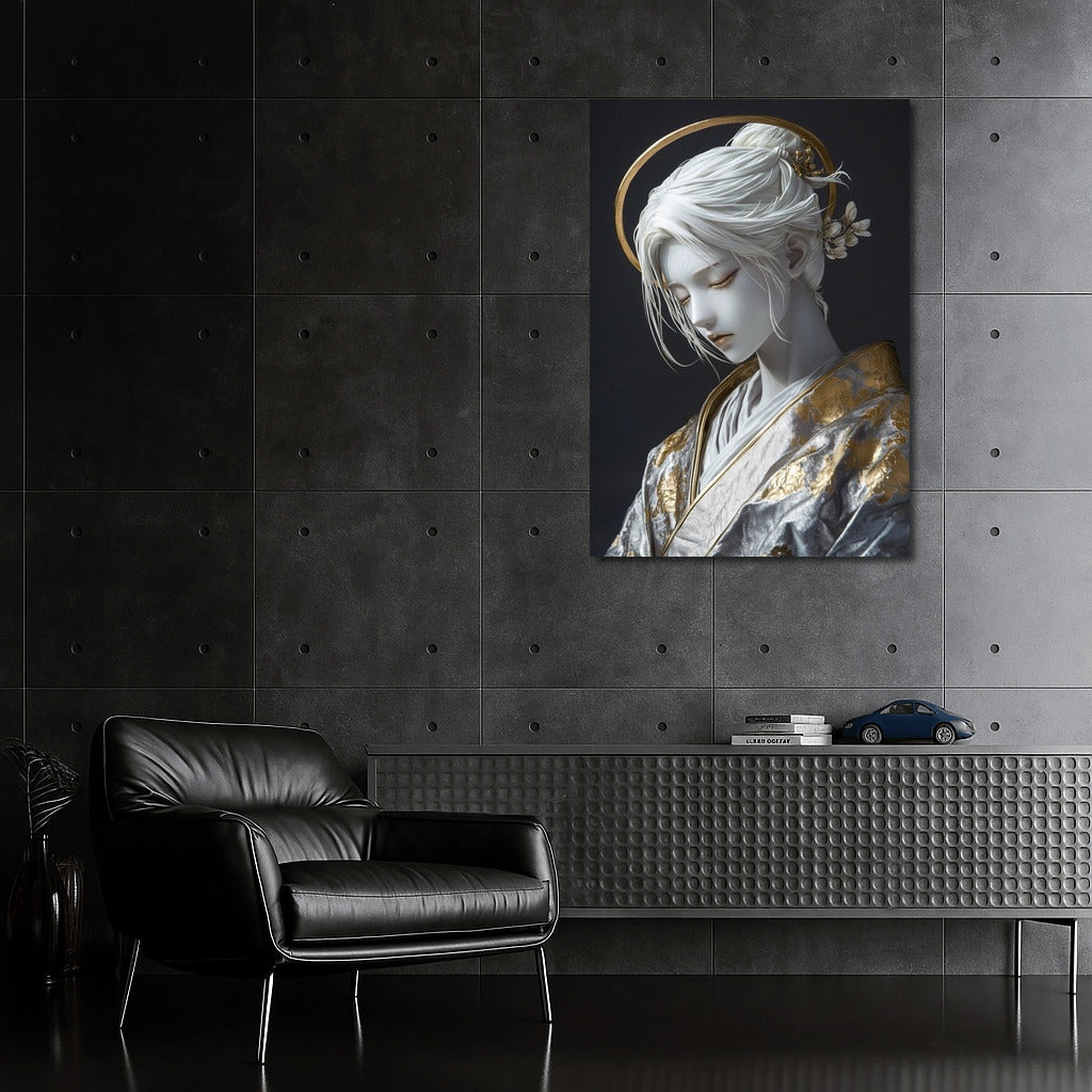 An elegant painting with a mysterious figure in golden patterns. Wall art that will add a sophisticated charm to your interior. See more from the collection: Mixed Wall Art