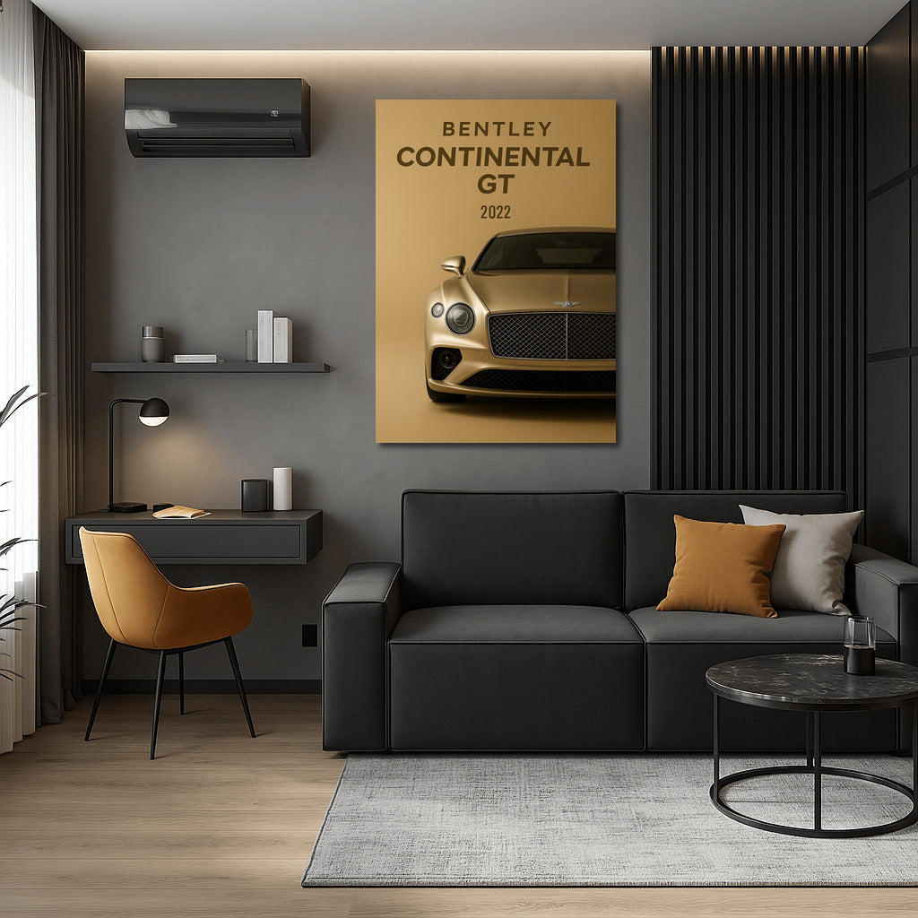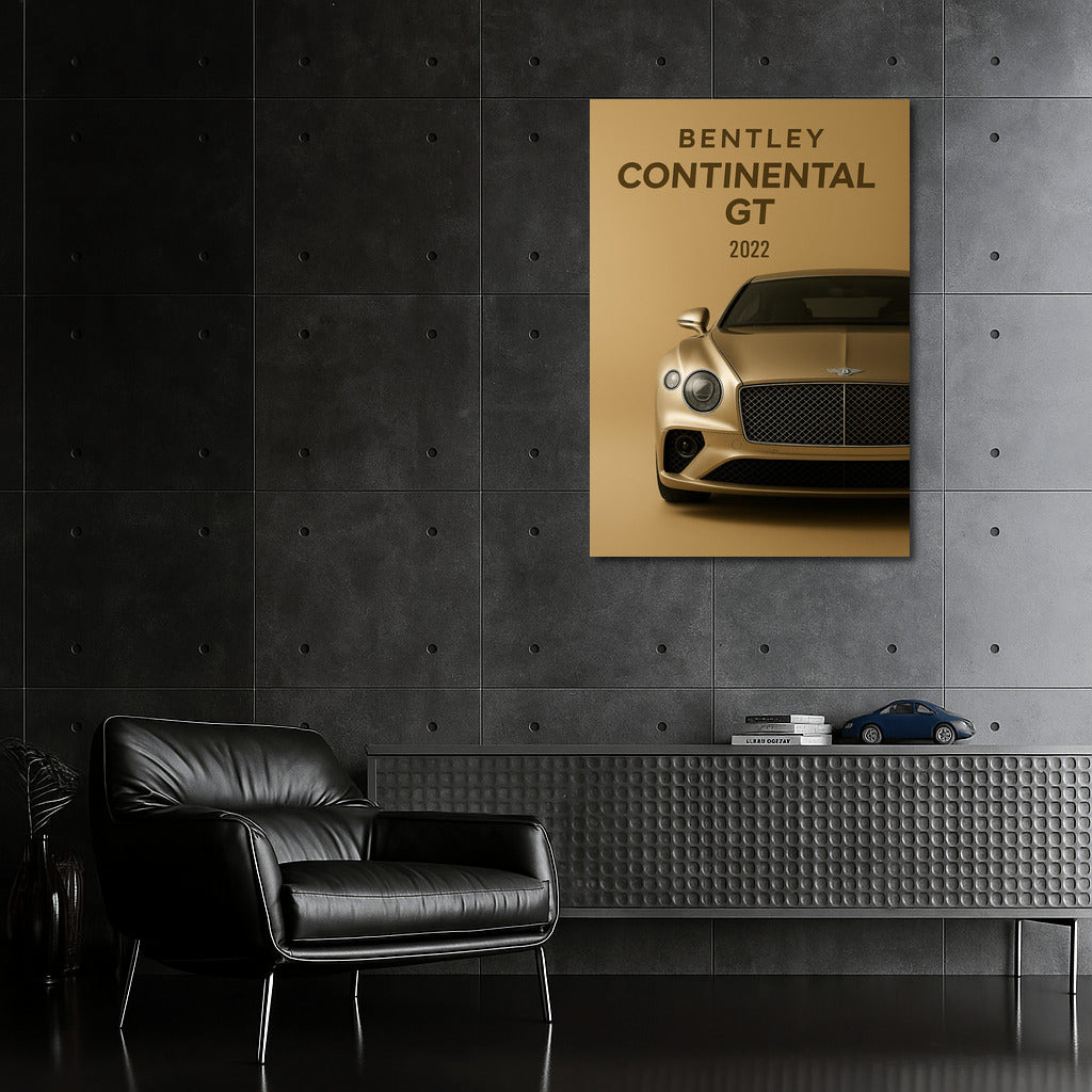 Wall art for speed lovers: Bentley Continental GT 2022 in golden splendor. The perfect accent for your interior. See more from the collection: Bentley Art