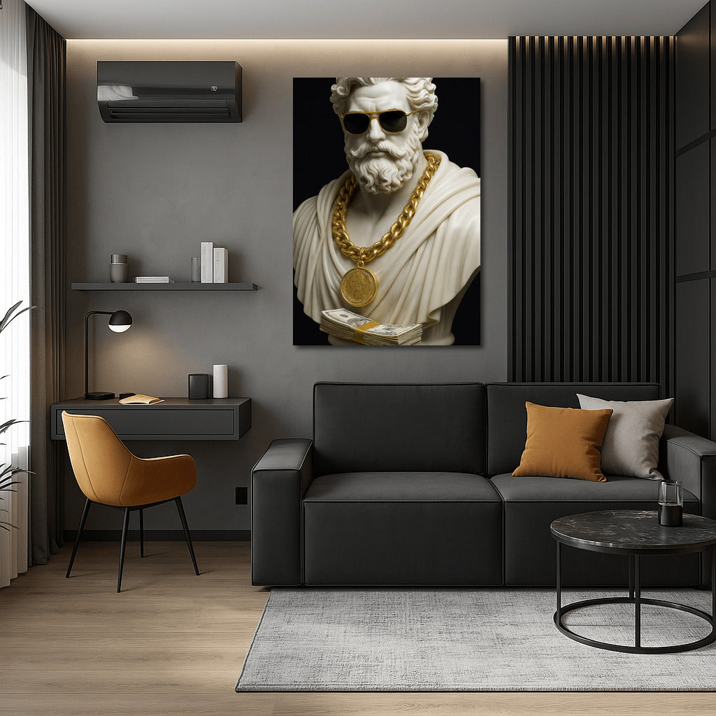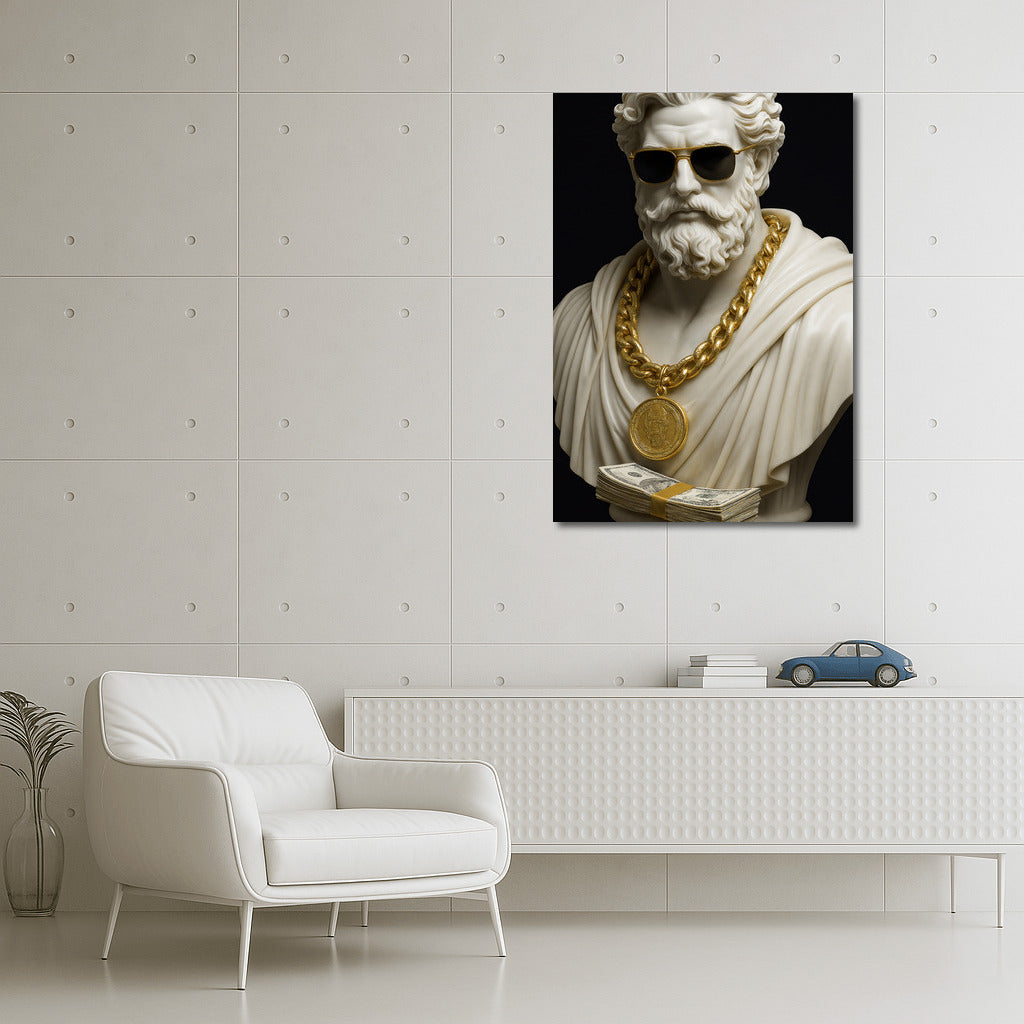 Feel the grandeur with this painting: a statue on trend, a gold-plated chain and the shine of wealth. The perfect wall art for you! See more from the collection: Money Art