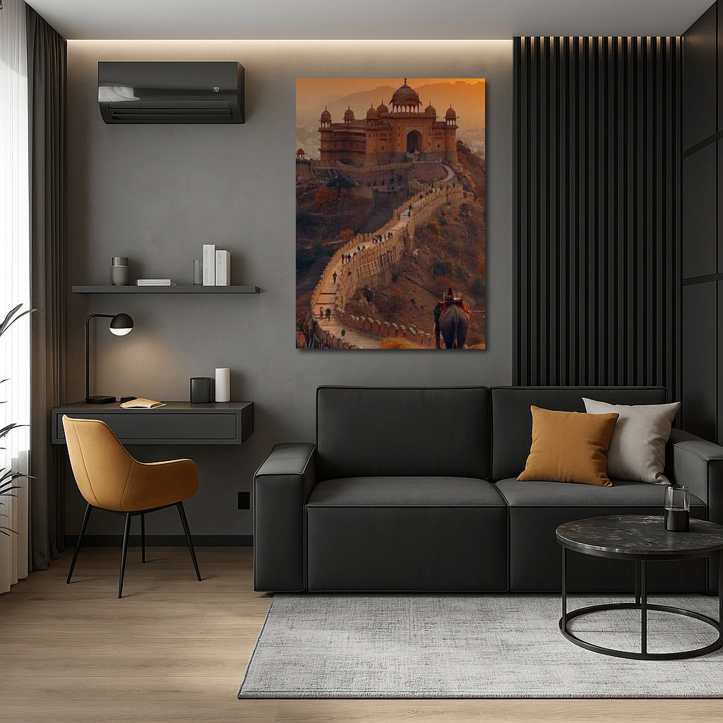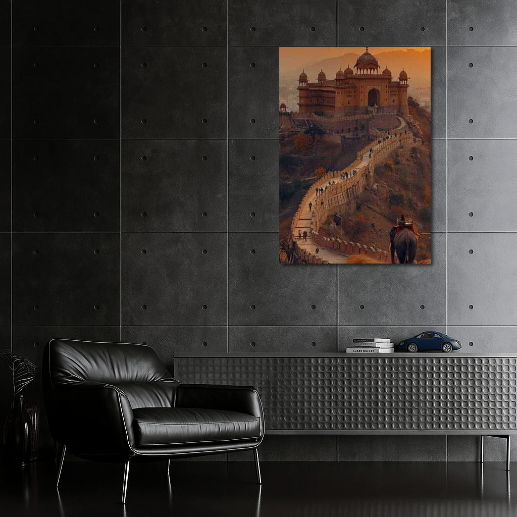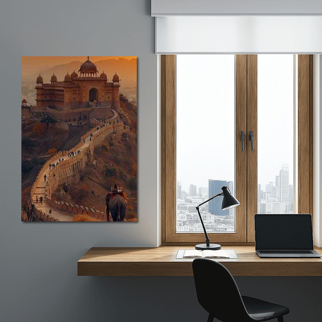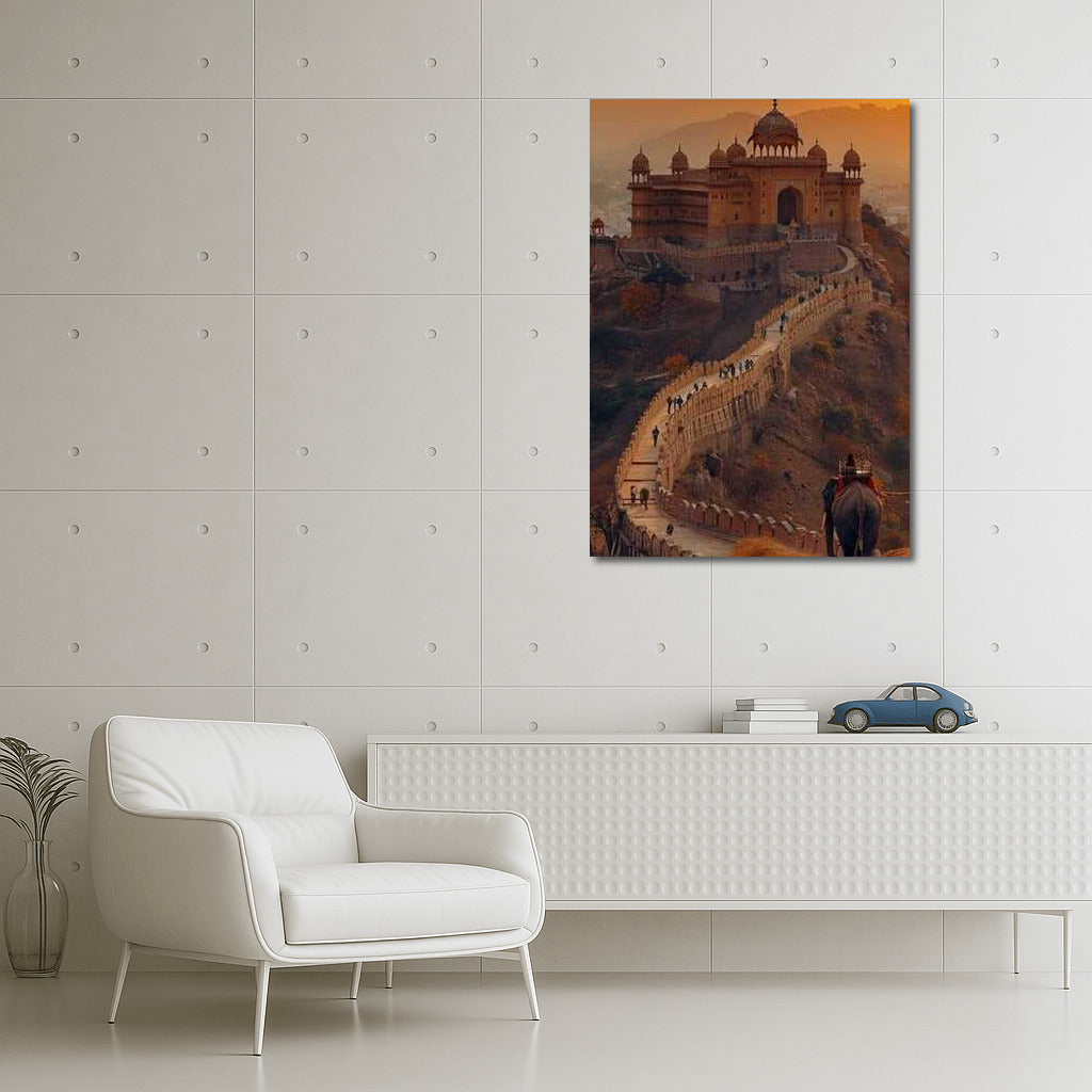 Sunset gold brings ancient fort of India to life, creating magic on the poster. Wall art with a breath of history and mystery. See more from the collection: Country Art