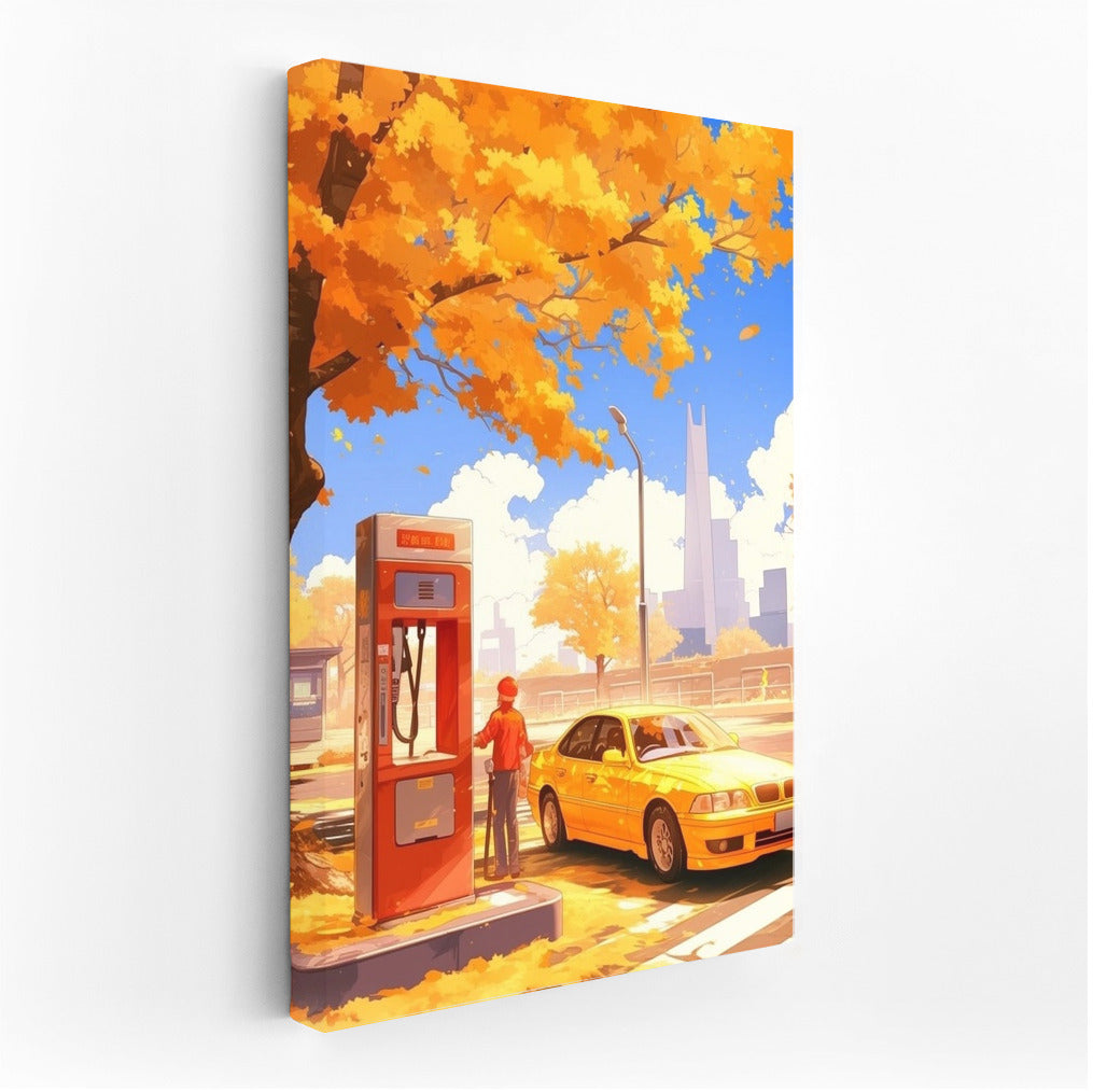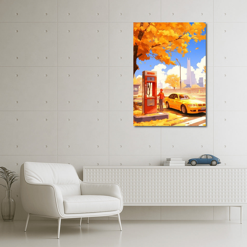 Autumn poster: girl fuels yellow BMW, surroundings sparkle with golden leaves - perfect wall art for a cozy atmosphere. See more from the collection: Anime & Manga genres Art