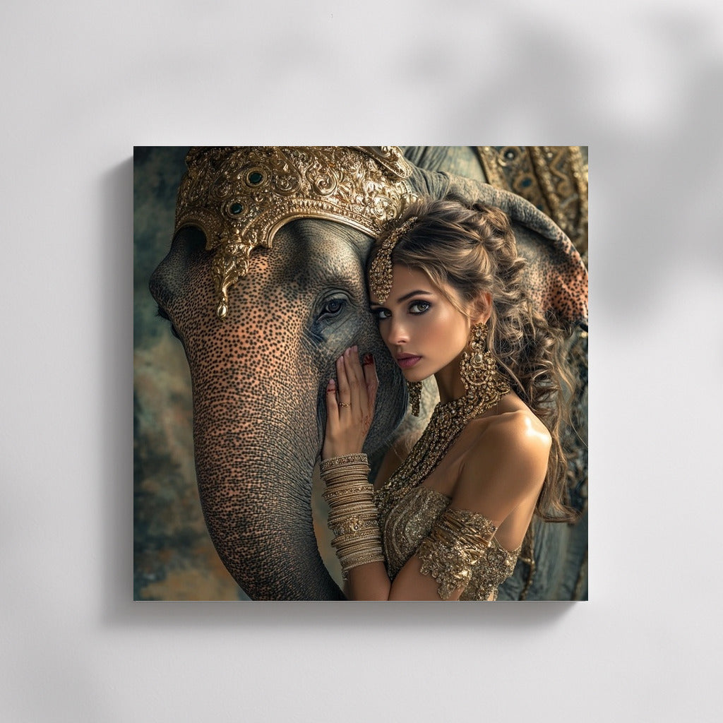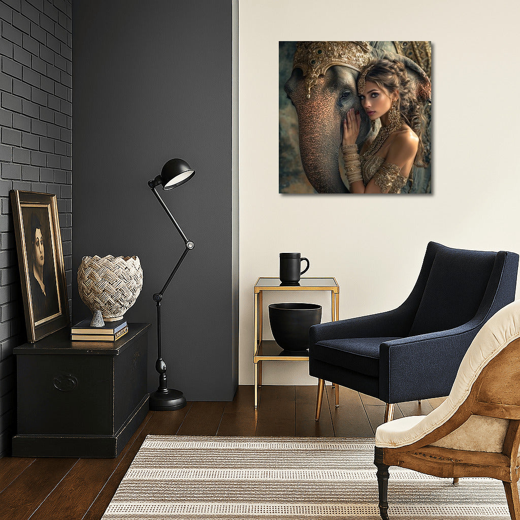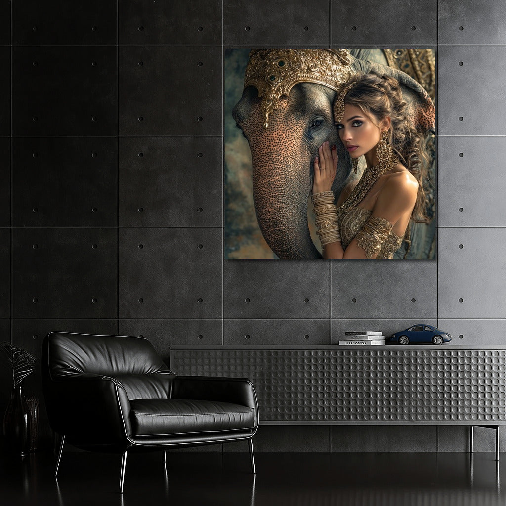 Classic wall art: a graceful connection between a man and a majestic elephant in an elegant, golden palette. Perfect for decor! See more from the collection: Mixed Wall Art
