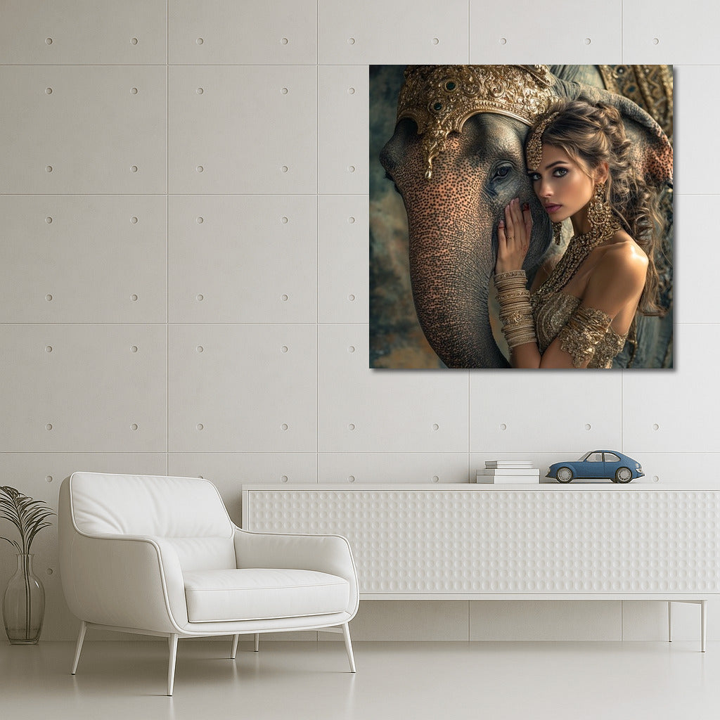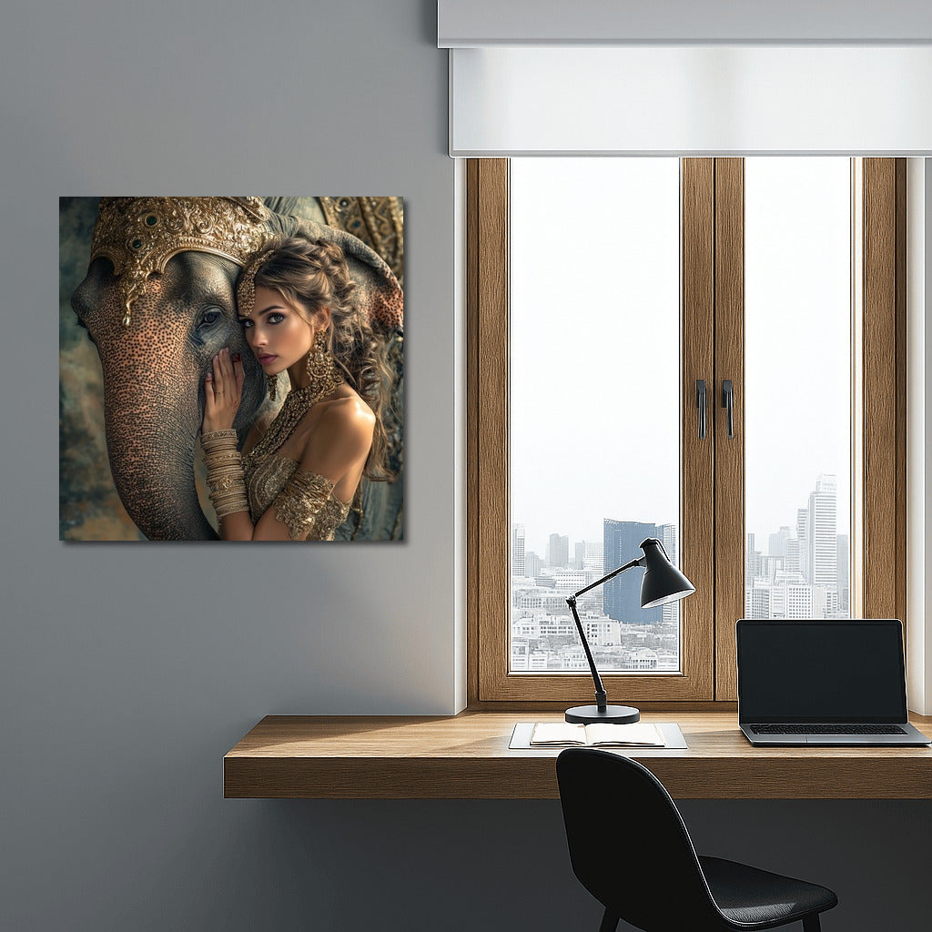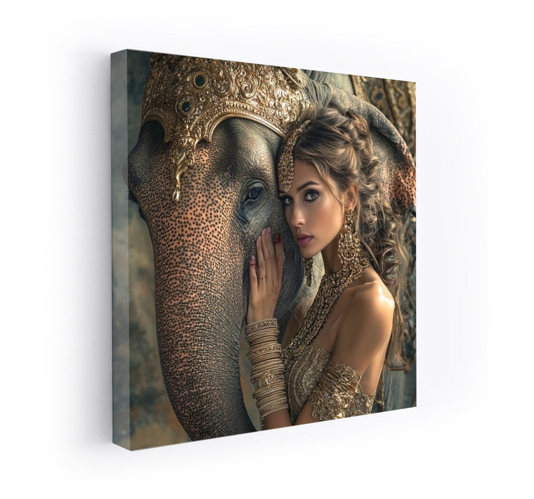 Classic wall art: a graceful connection between a man and a majestic elephant in an elegant, golden palette. Perfect for decor! See more from the collection: Mixed Wall Art