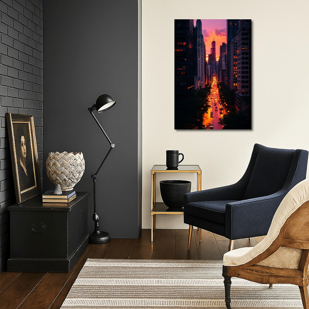 Urban magic: the sunset painted the streets in gold, creating dynamism and charm. The perfect poster for your home! See more from the collection: Cityscapes & Skylines Art