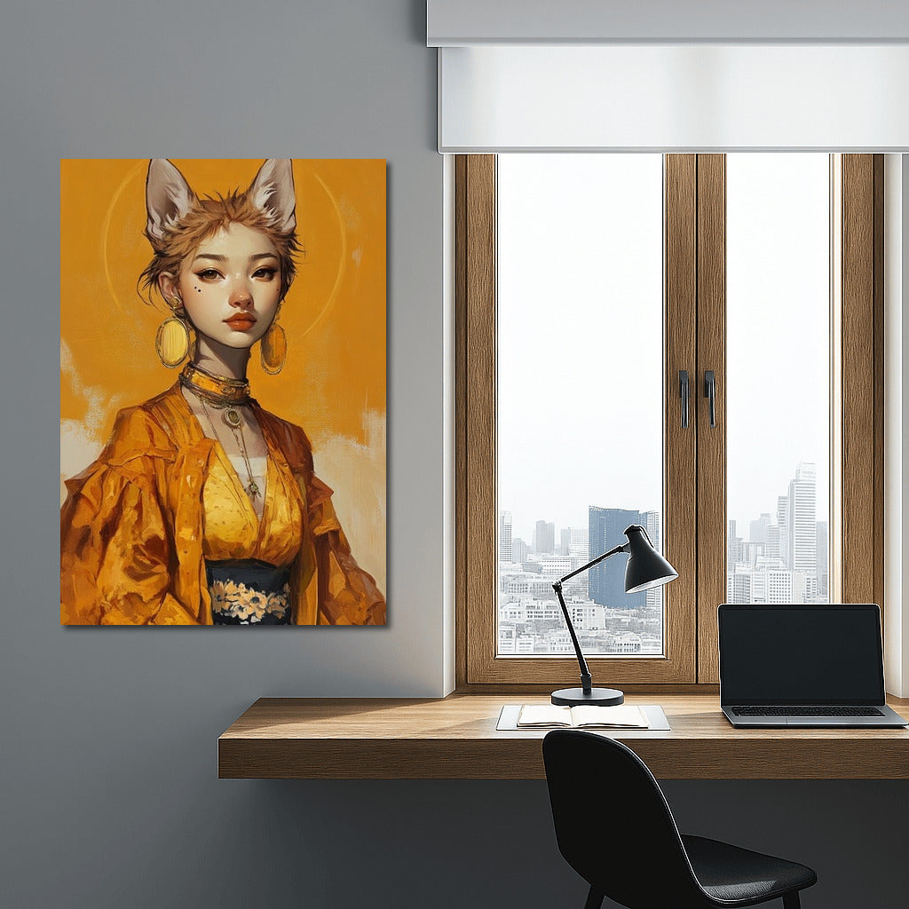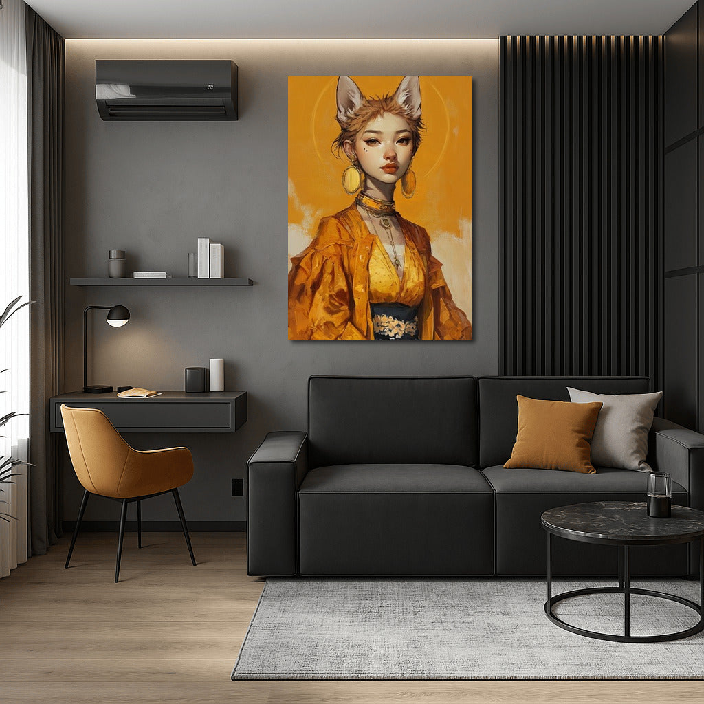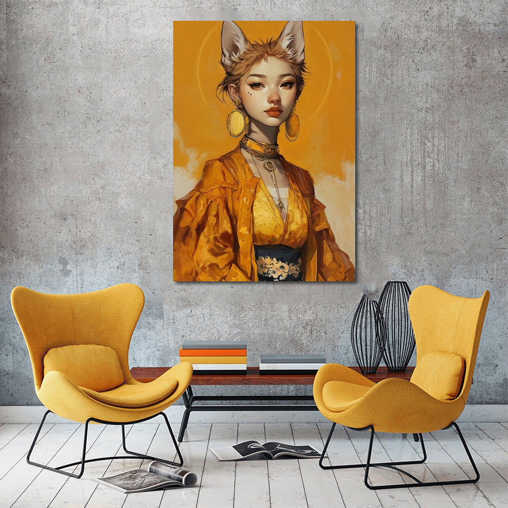 A vibrant poster featuring a mystical figure in gold. Wall art with a fantasy twist that fills the atmosphere with magic. See more from the collection: Mixed Wall Art