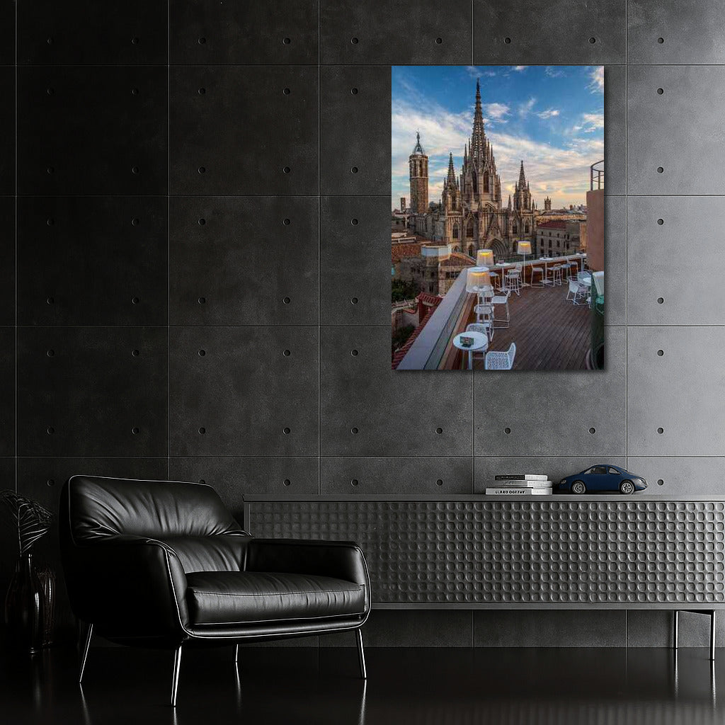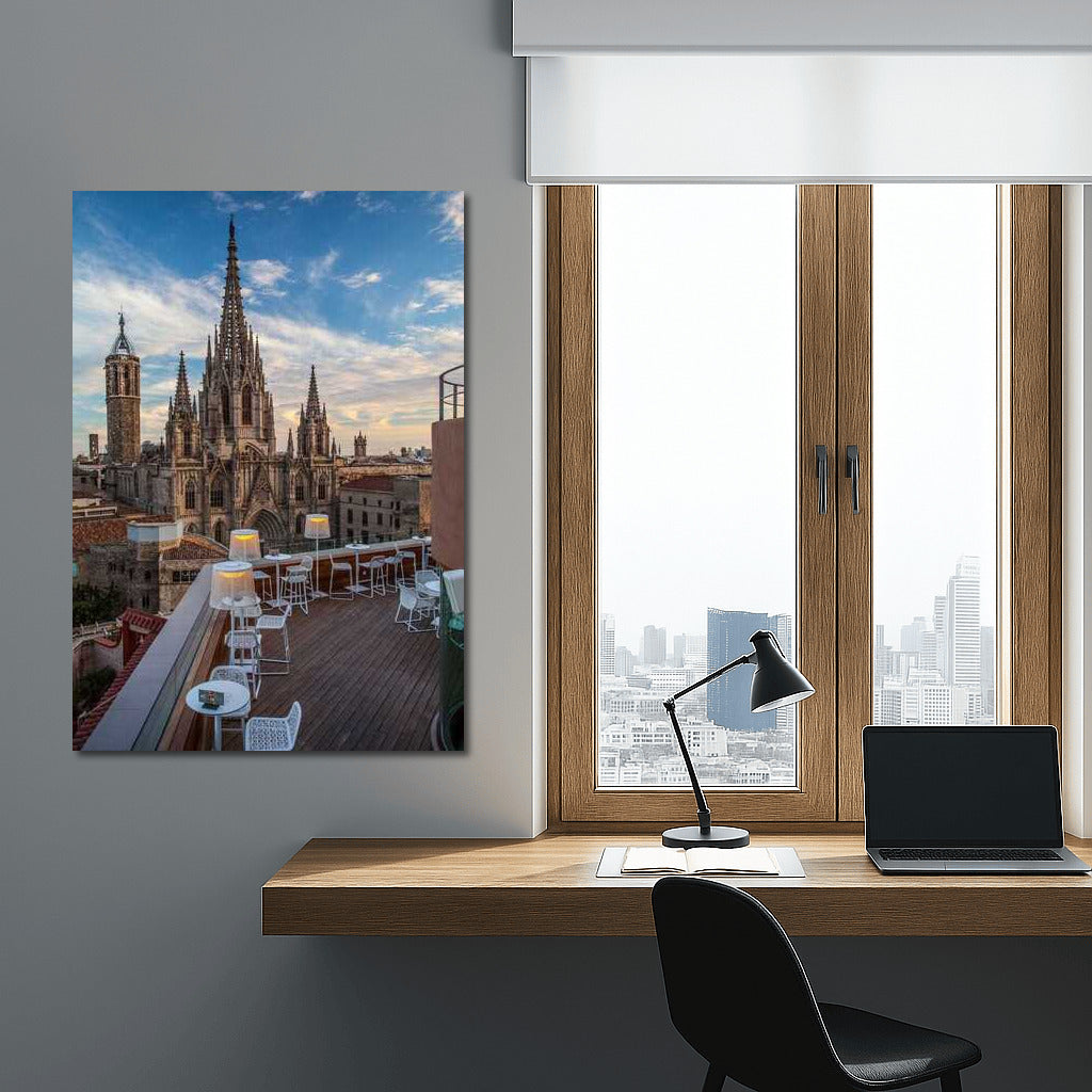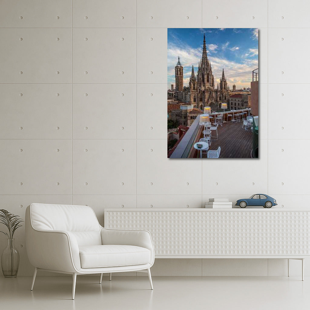 Immerse yourself in the charm of Spain with this painting that captures the grandeur of Gothic architecture and the atmosphere of a cozy terrace evening. See more from the collection: Country Art