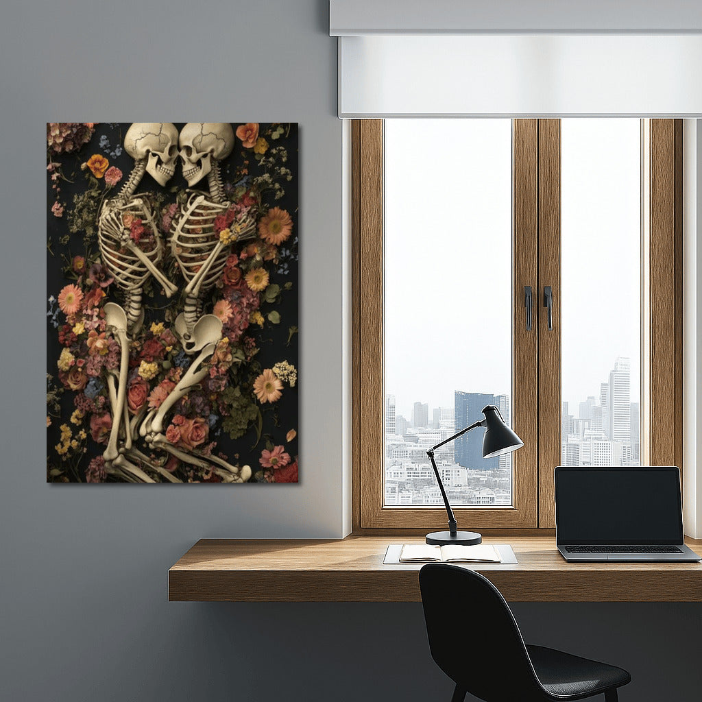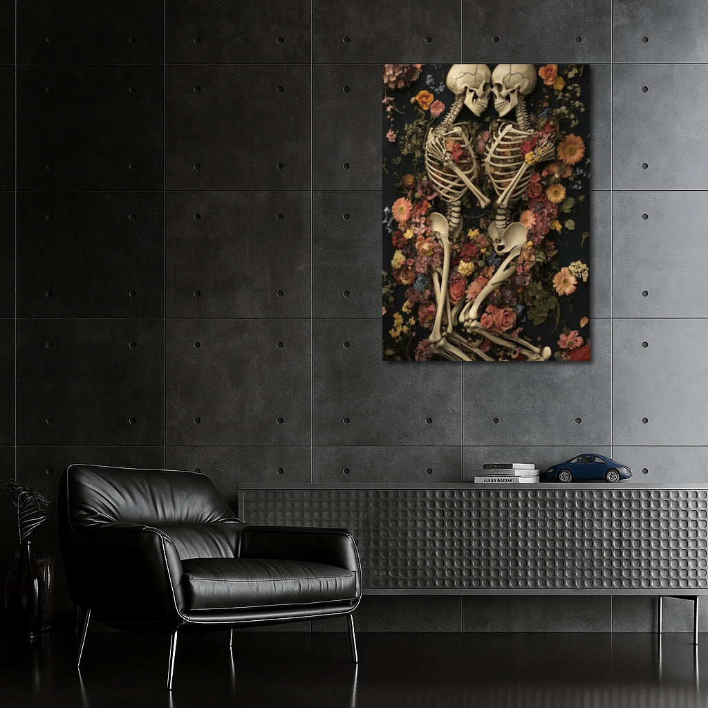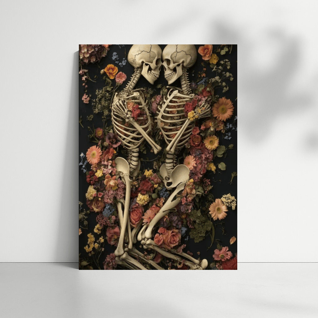 Gothic painting: two skeletons in an embrace among flowers. A poster where the eternal and the fragile intertwine in wall art. See more from the collection: Gothic Art