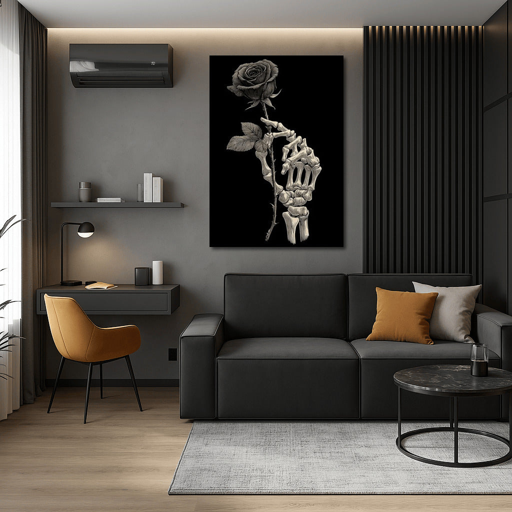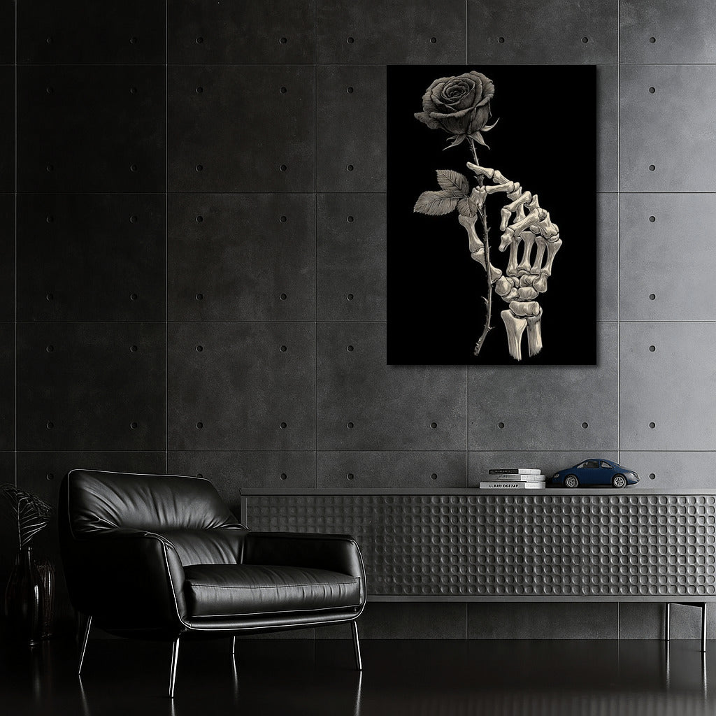 Gothic poster: skeletal hand holding rose, contrasting eternity and transience. Thought-inspiring wall art. See more from the collection: Gothic Art