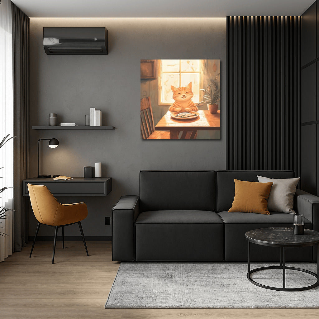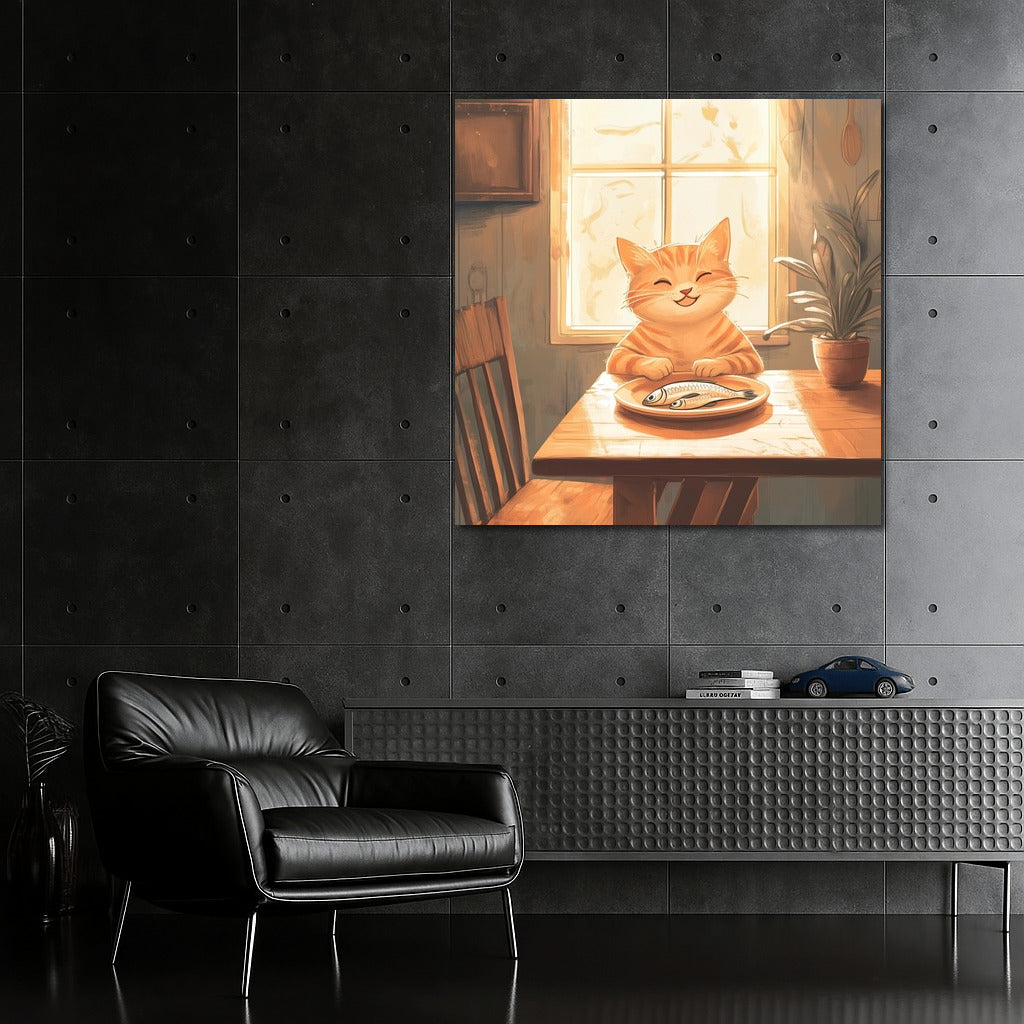 Poster of a contented cat at the table. Create coziness and warmth in your home with this cute wall art. See more from the collection: Animals Art