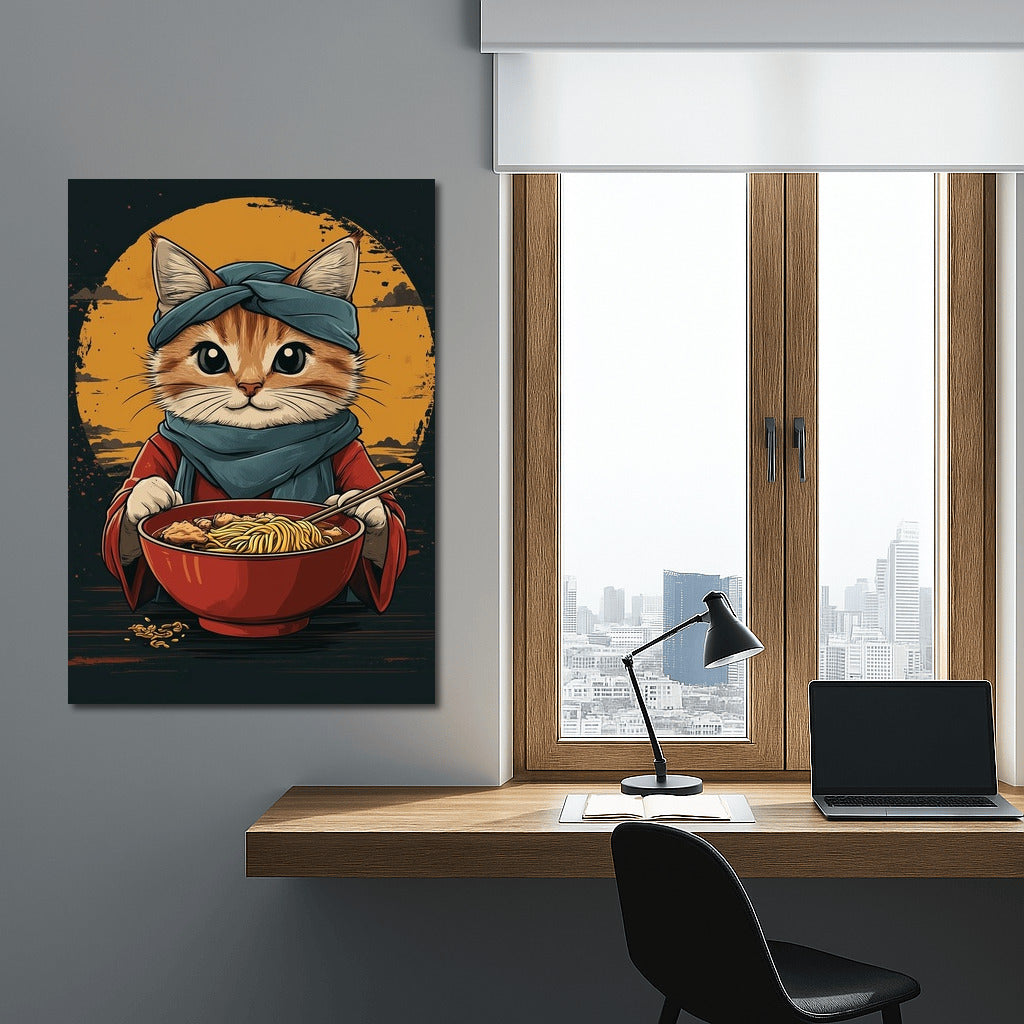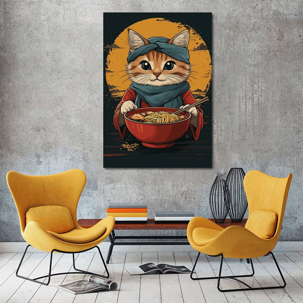 Adorable cat in exotic outfit enjoying noodles. Perfect poster to liven up your wall art! See more from the collection: Animals Art
