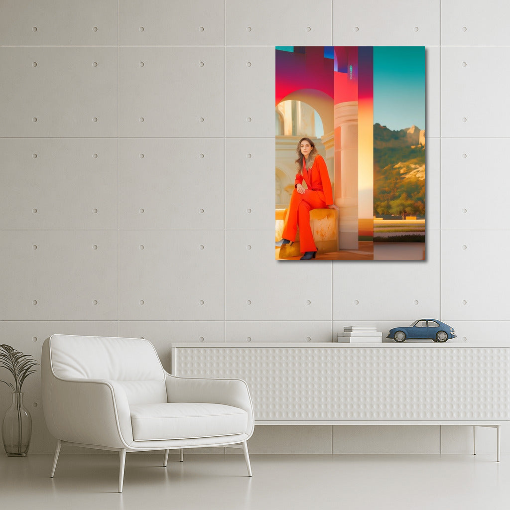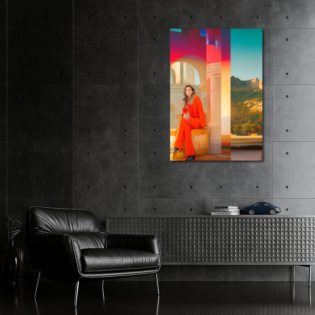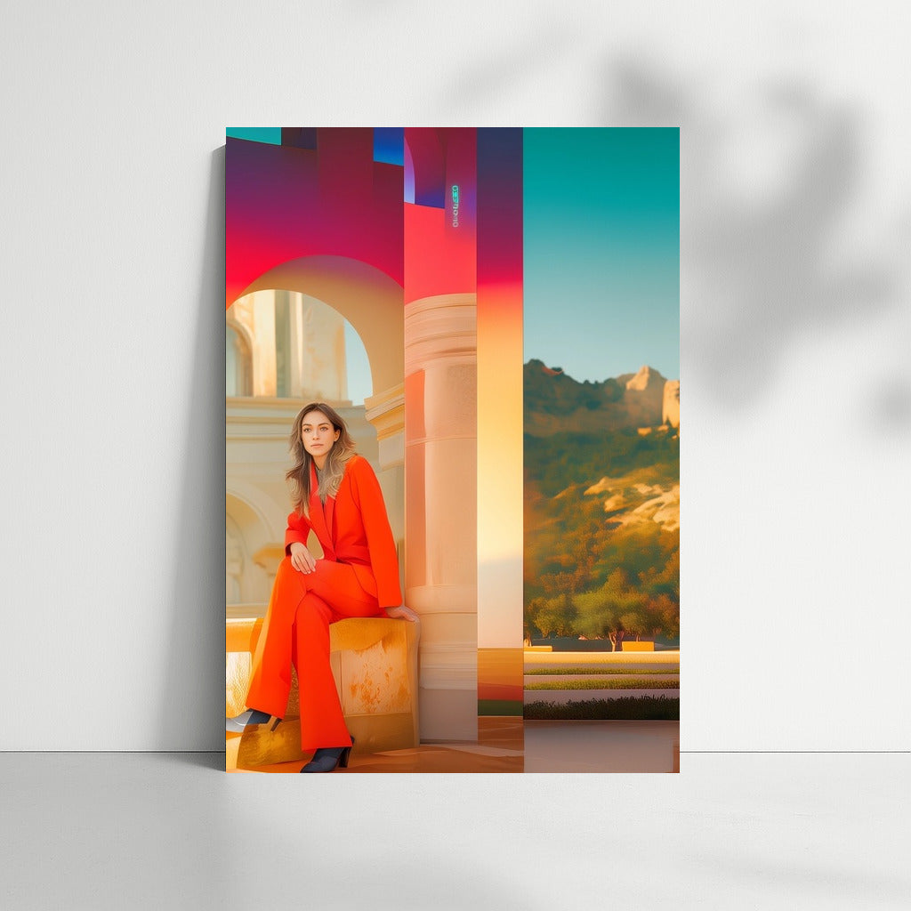 Vibrant wall art: an elegant figure in red against a backdrop of arches and a landscape. The perfect poster for inspiration! See more from the collection: Mixed Wall Art