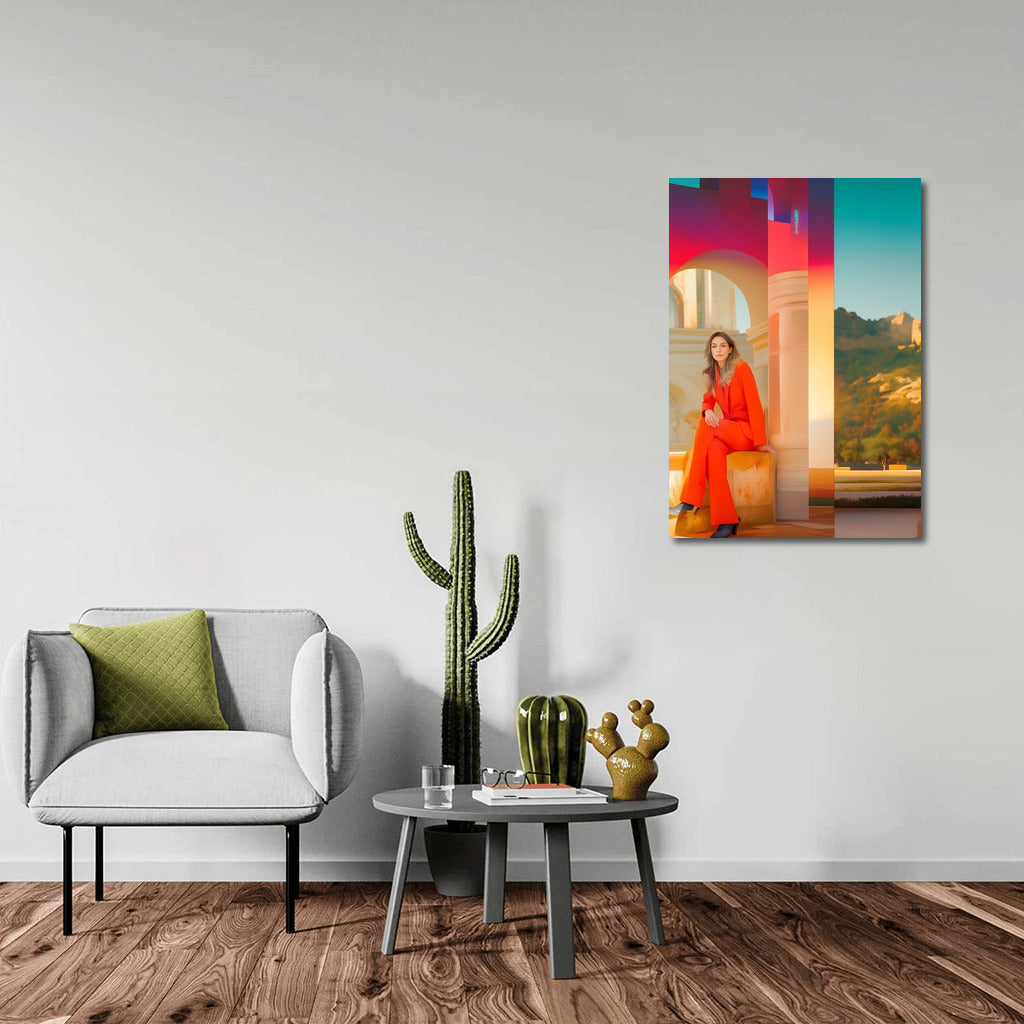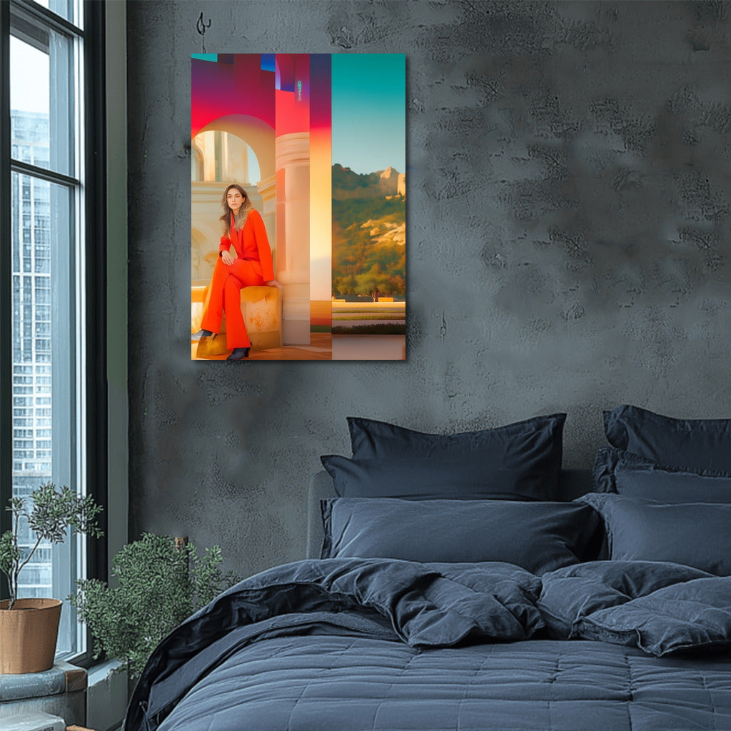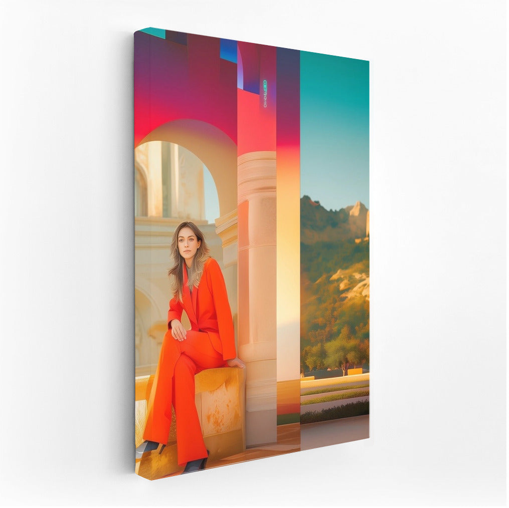 Vibrant wall art: an elegant figure in red against a backdrop of arches and a landscape. The perfect poster for inspiration! See more from the collection: Mixed Wall Art