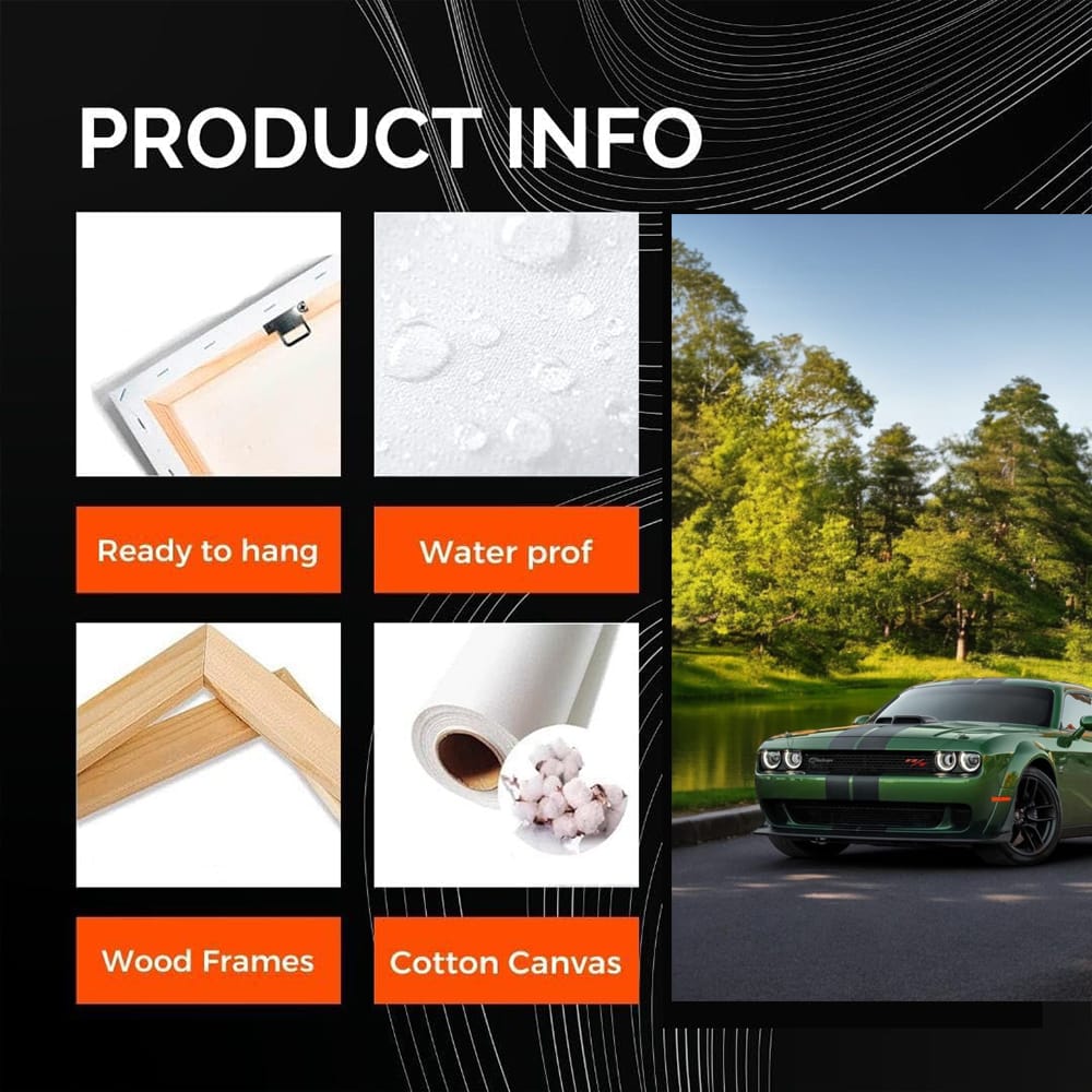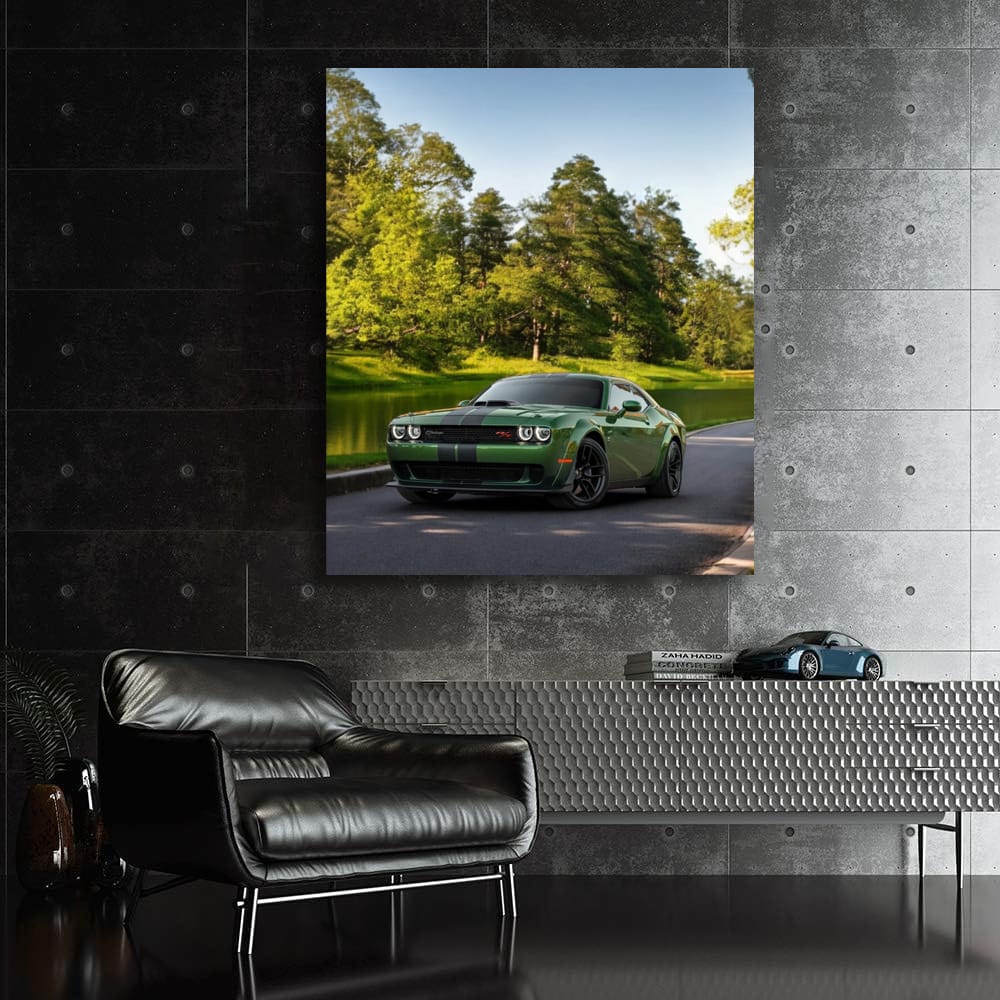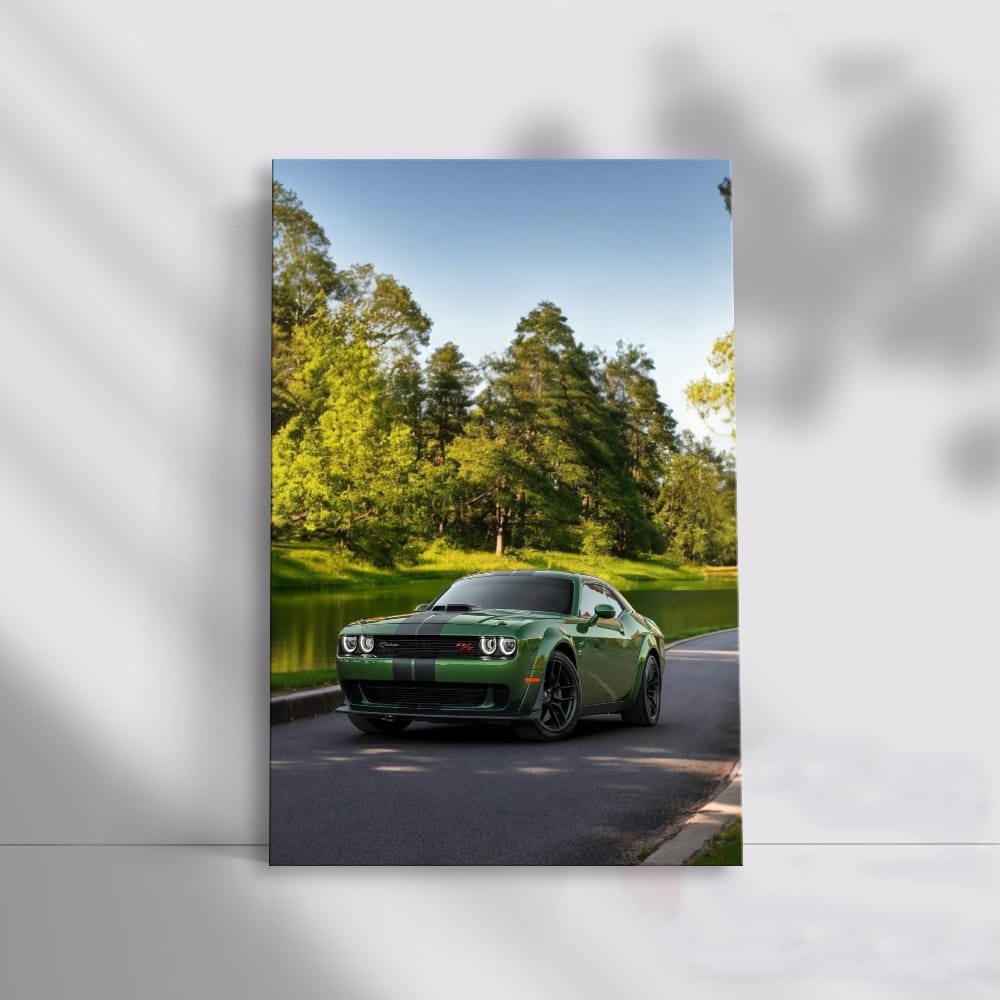 painting this: a poster of a green Dodge Challenger in a park - now that's a brutal painting! This is not just wall art, this is a masterpiece for true car fans. This car seems to scream: "I'm here to dominate!" A real beast on the wall. See more from the collection: Dodge Art