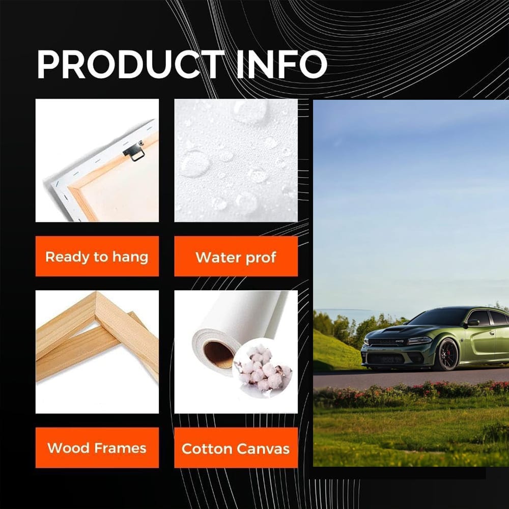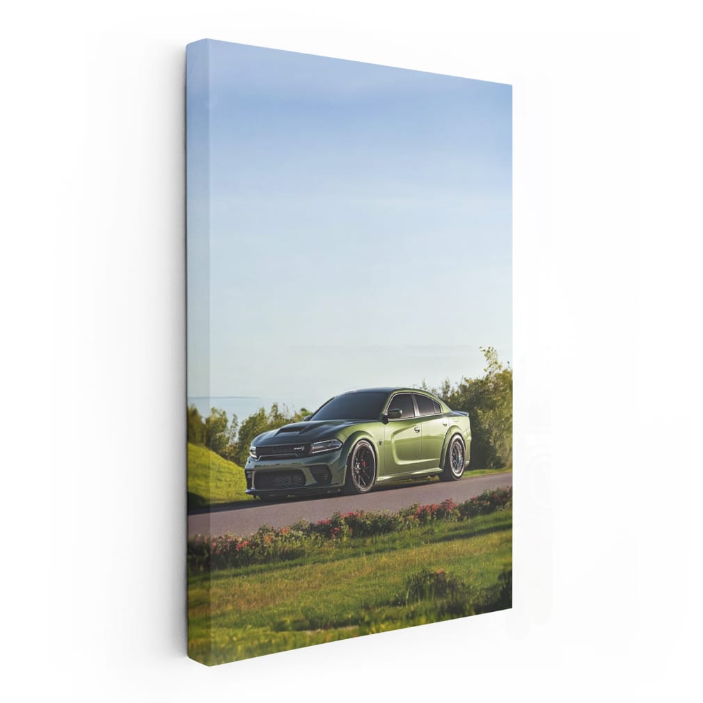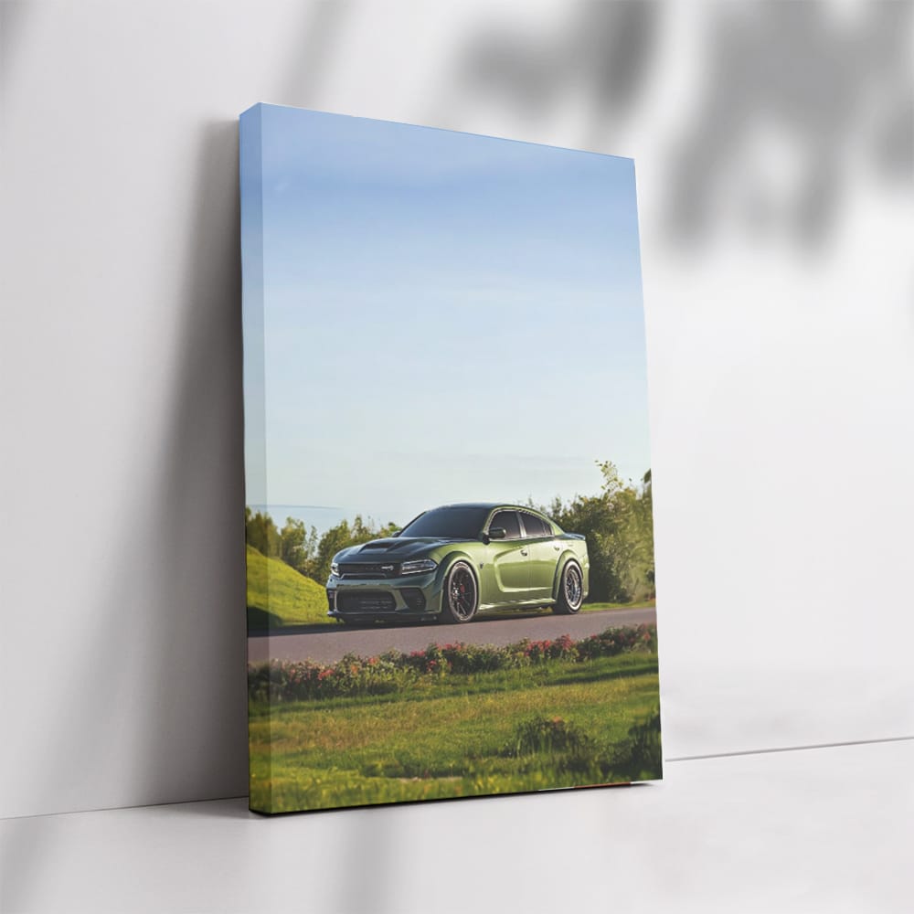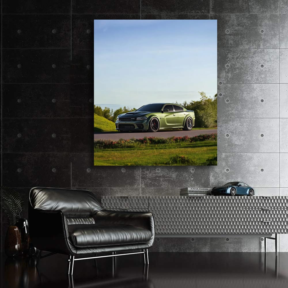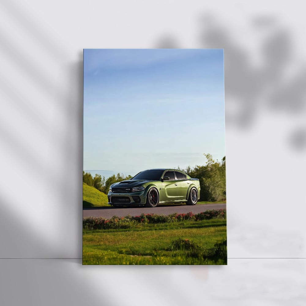 This poster is like the roar of a V8 engine in your room. The painting "Dodge in the greenery of the park" is wall art for those who see art in gasoline. Each brushstroke is like a sharp turn at maximum speed, makes you feel the speed and power under the hood. See more from the collection: Dodge Art