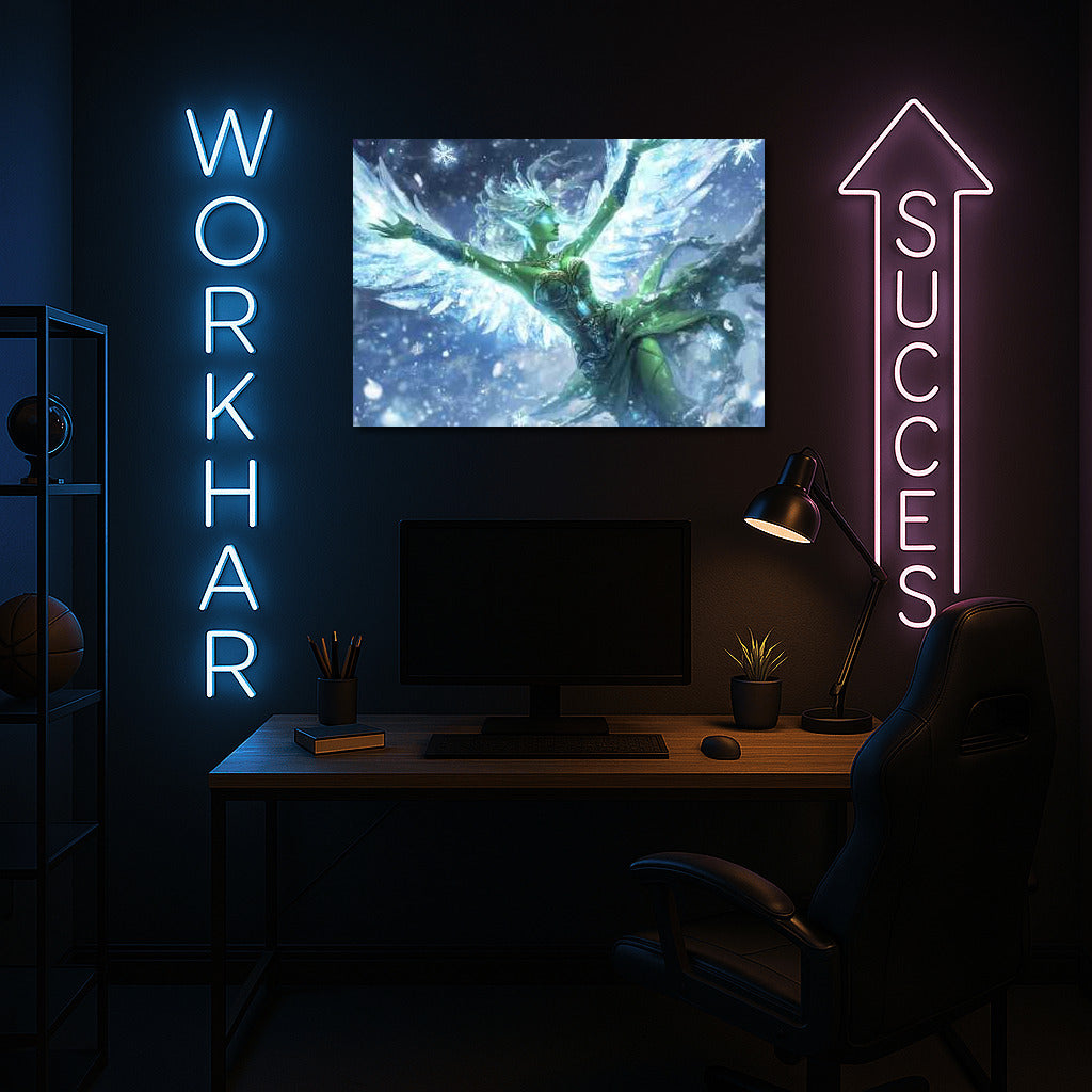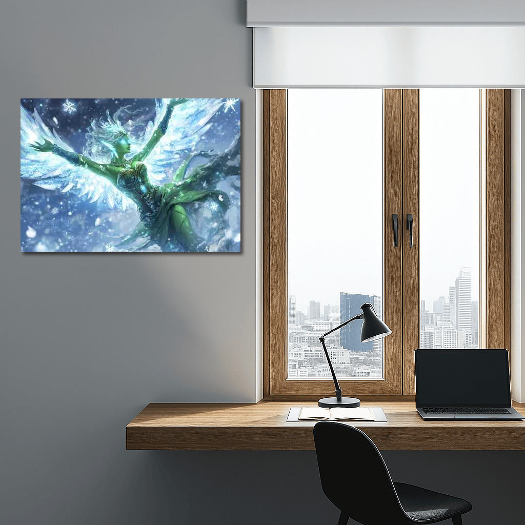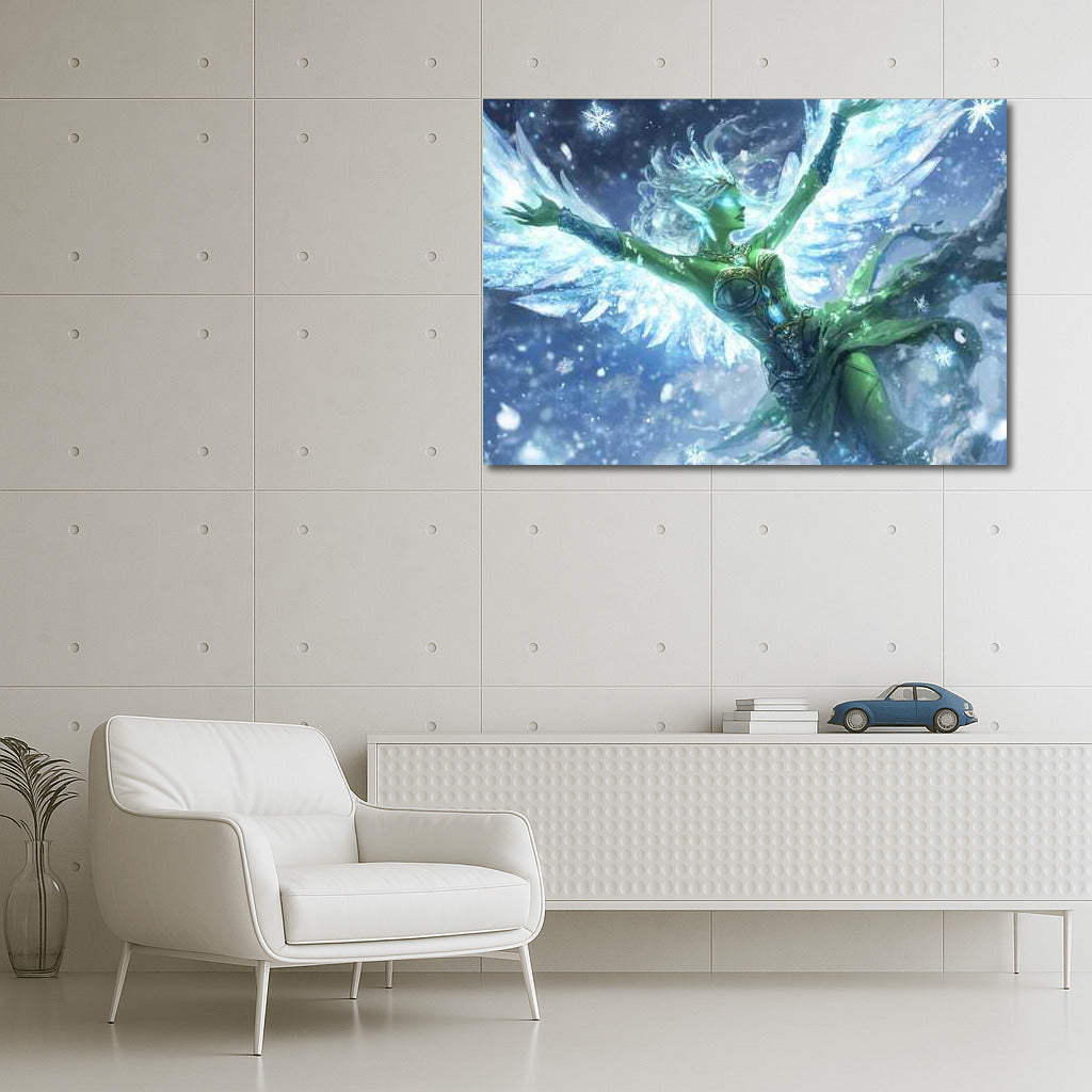 Dive into a fantasy world with a poster where a beautiful entity with green skin and wings fills the space with magic and light. See more from the collection: Fantasy Art