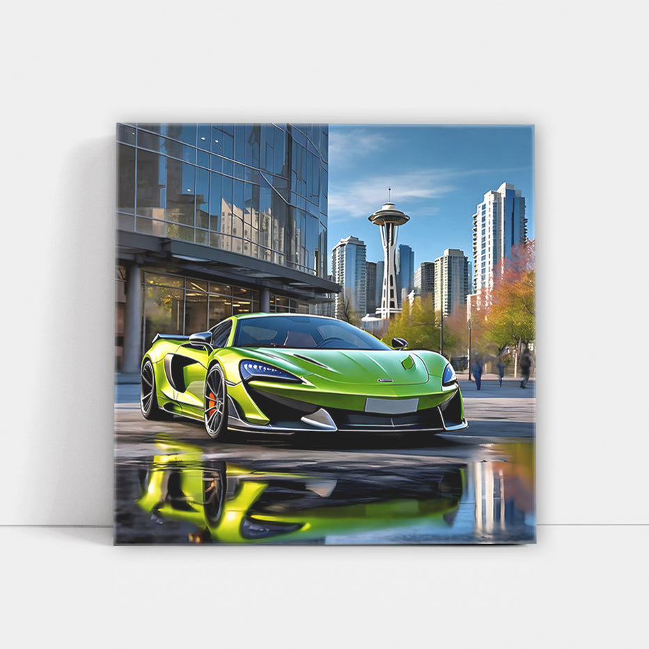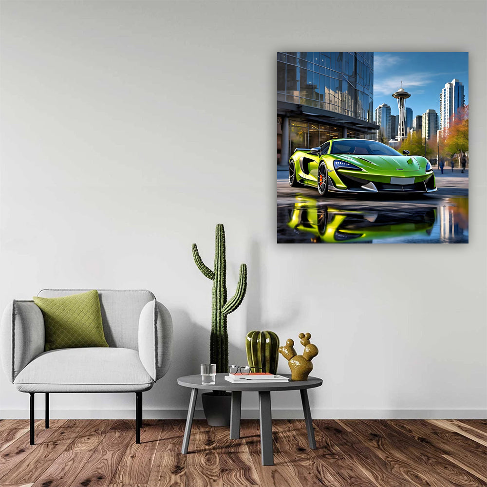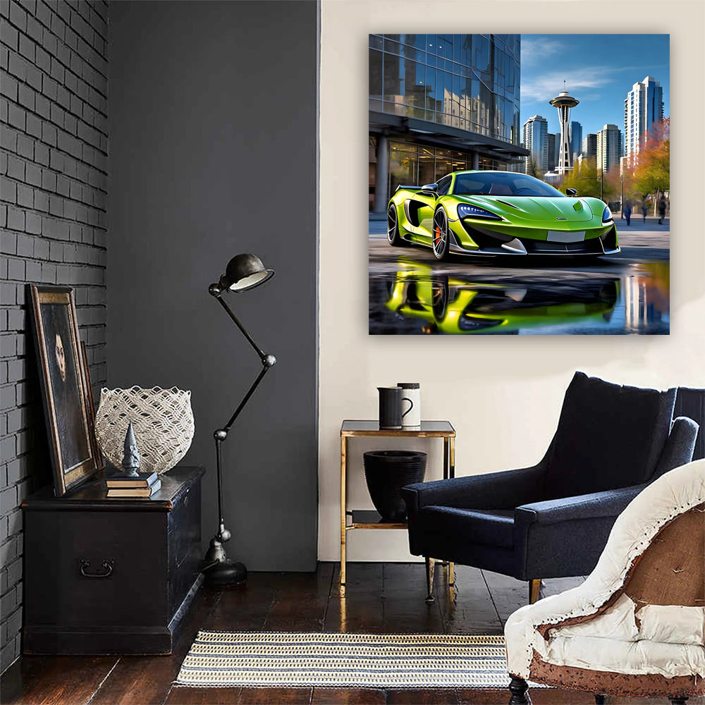 This painting is pure adrenaline on the wall. McLaren 600LT in green, like a wild animal ready to pounce. In Seattle, it looks especially bold. Wall art for those who appreciate speed and power. A poster that will make your heart beat faster. See more from the collection: McLaren Art