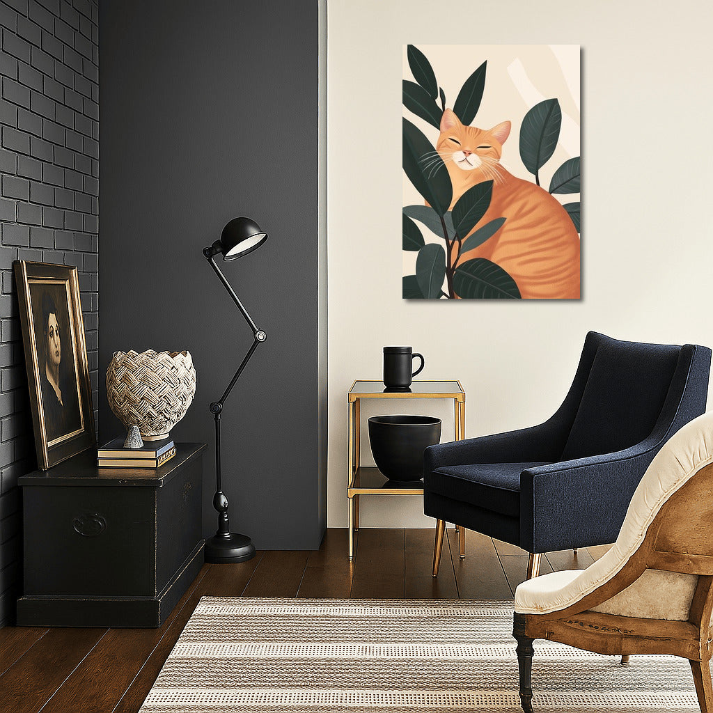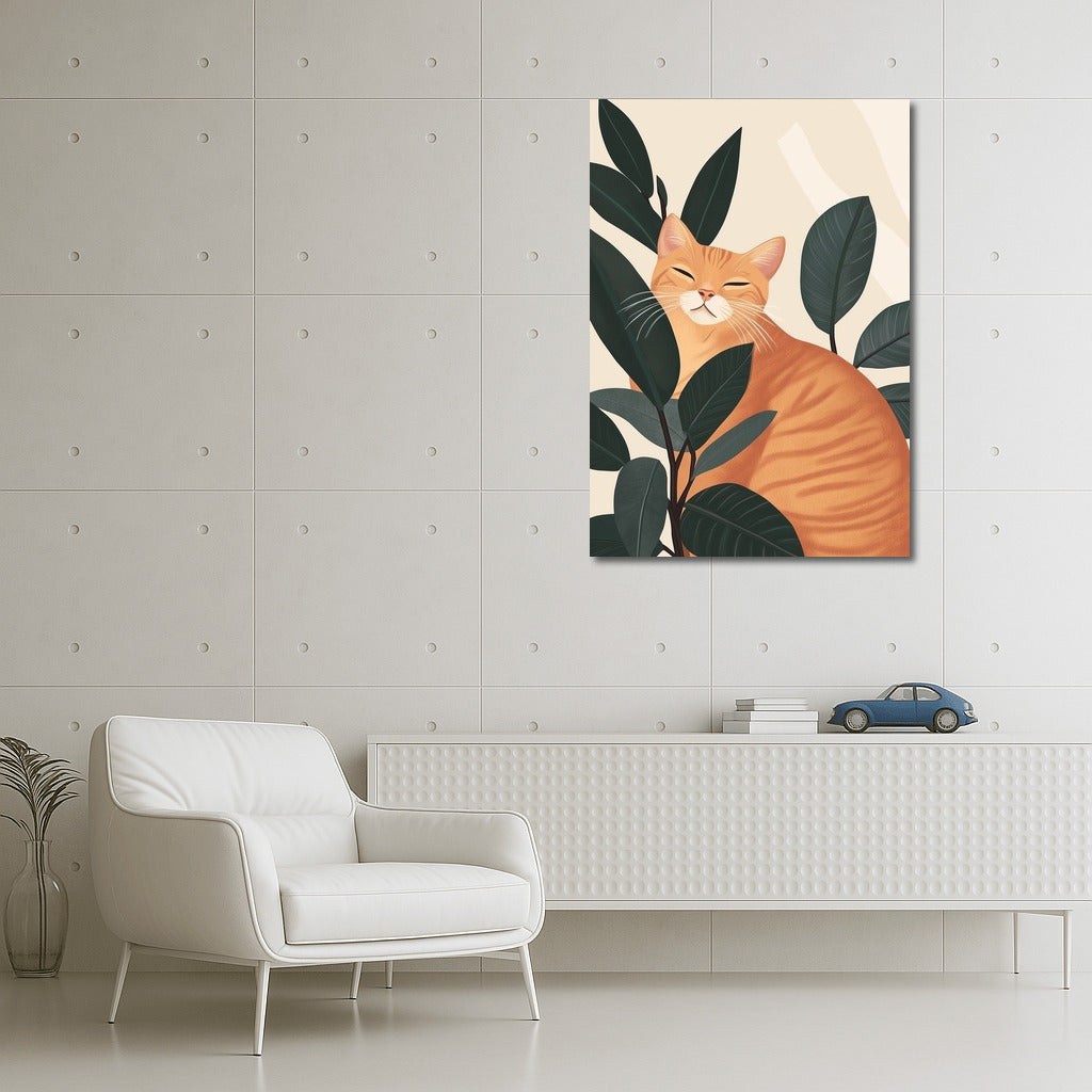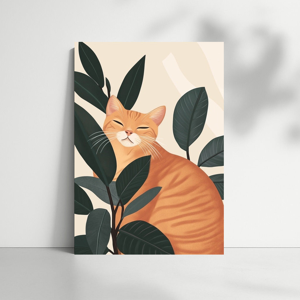 A cozy poster of a contented cat among greenery. Add playful wall art to your interior to create a warm atmosphere. See more from the collection: Animals Art
