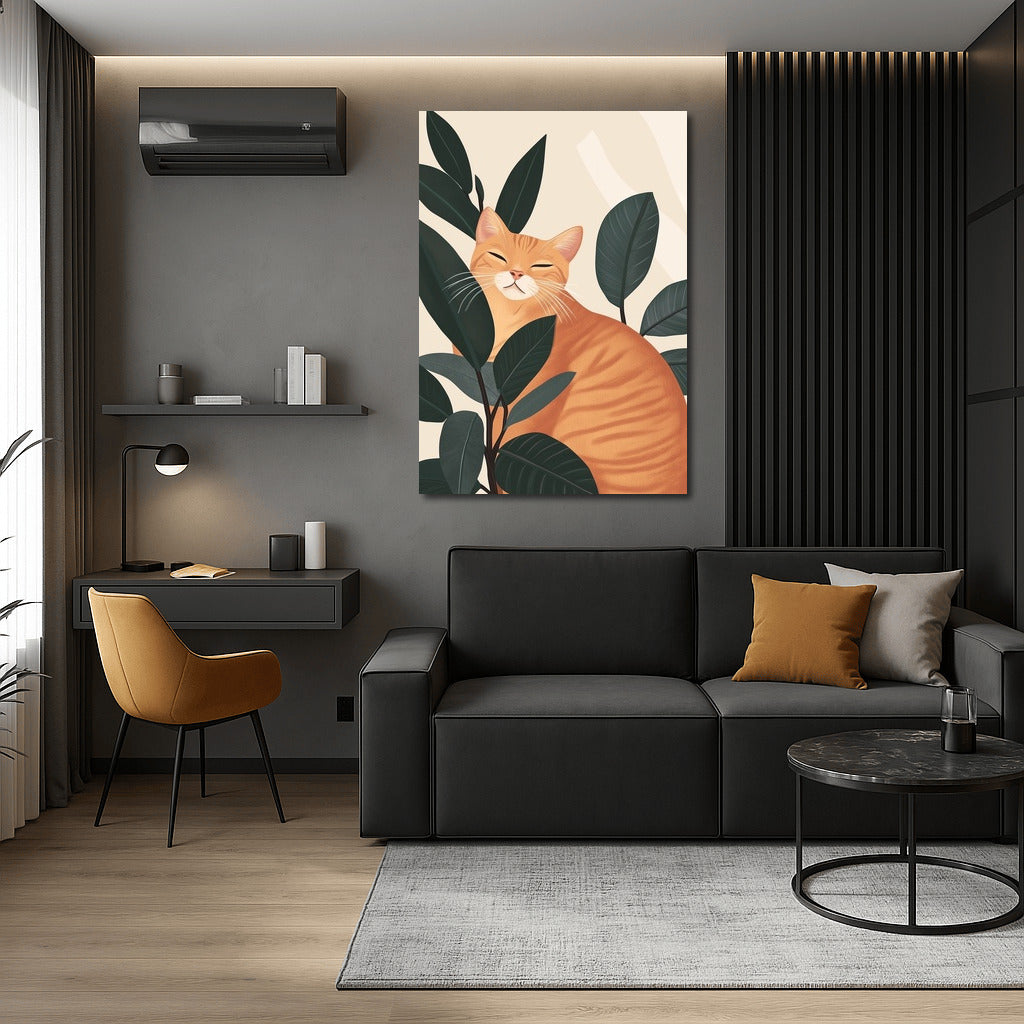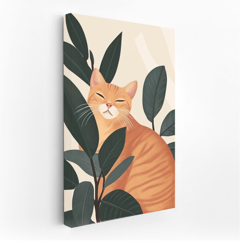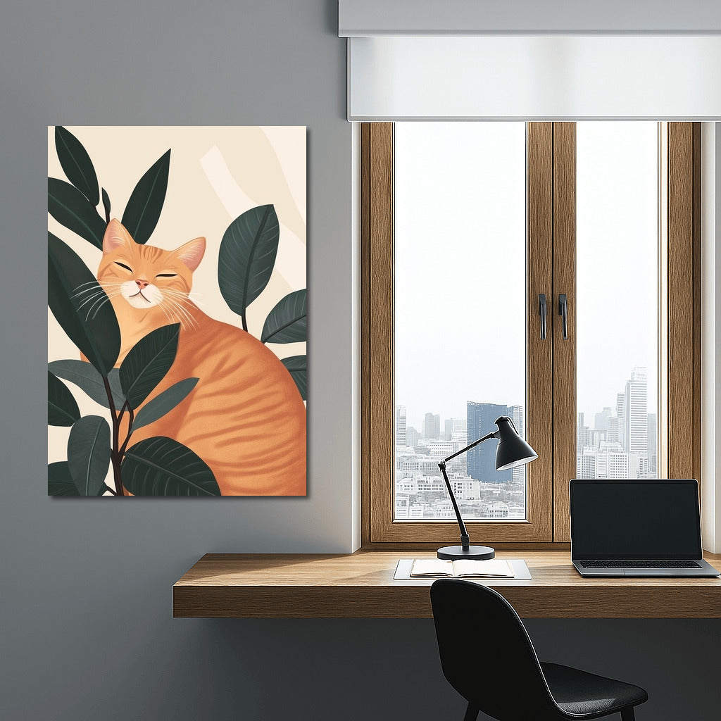 A cozy poster of a contented cat among greenery. Add playful wall art to your interior to create a warm atmosphere. See more from the collection: Animals Art