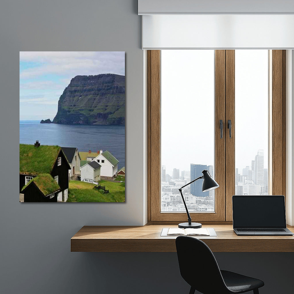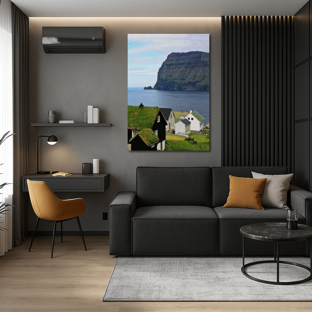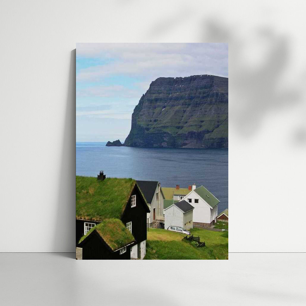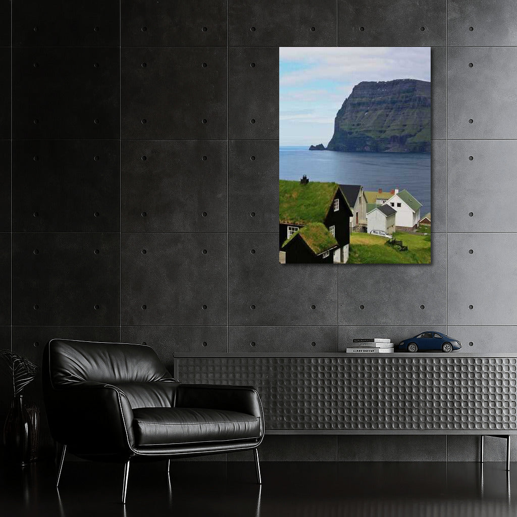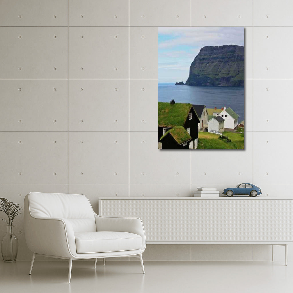 A breathtaking Danish landscape with green roofs at the foot of cliffs is a poster that embodies the harmony of nature and art. See more from the collection: Country Art