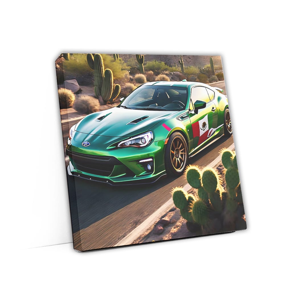 What a poster! The painting shows a Subaru BRZ and a Toyota 86 in a poisonous green paint job with a Mexican flag. Wall art for real car enthusiasts who appreciate style and power. This art is not just a decoration, but a symbol of a daring drive! See more from the collection: Subaru Art