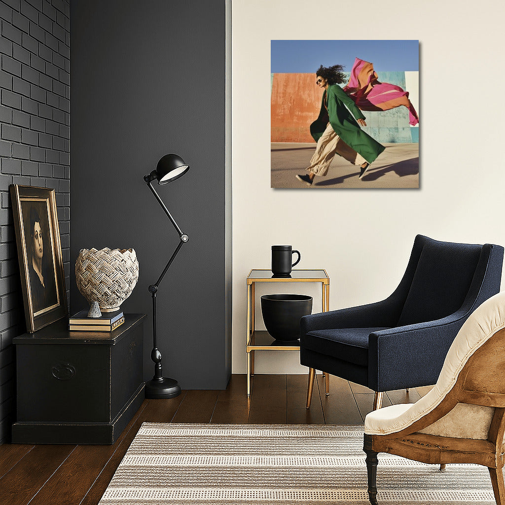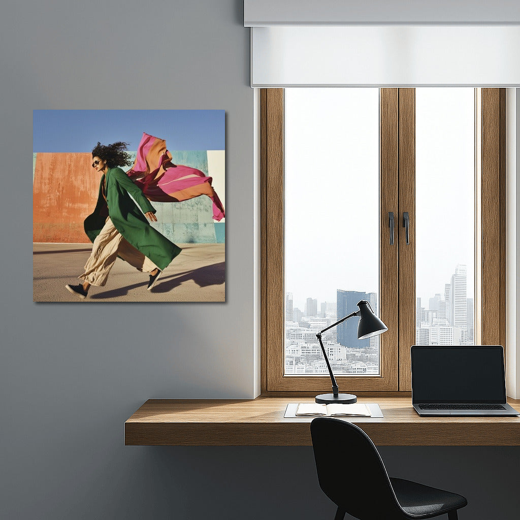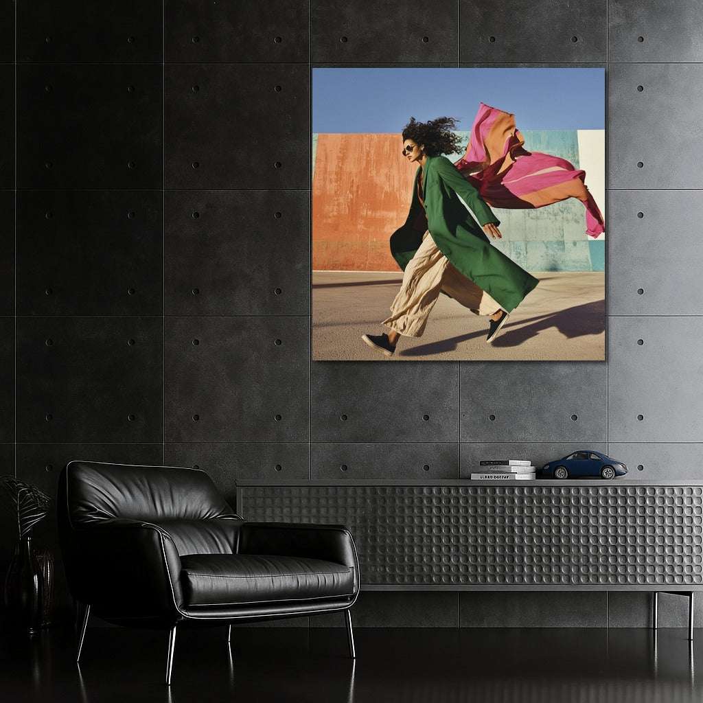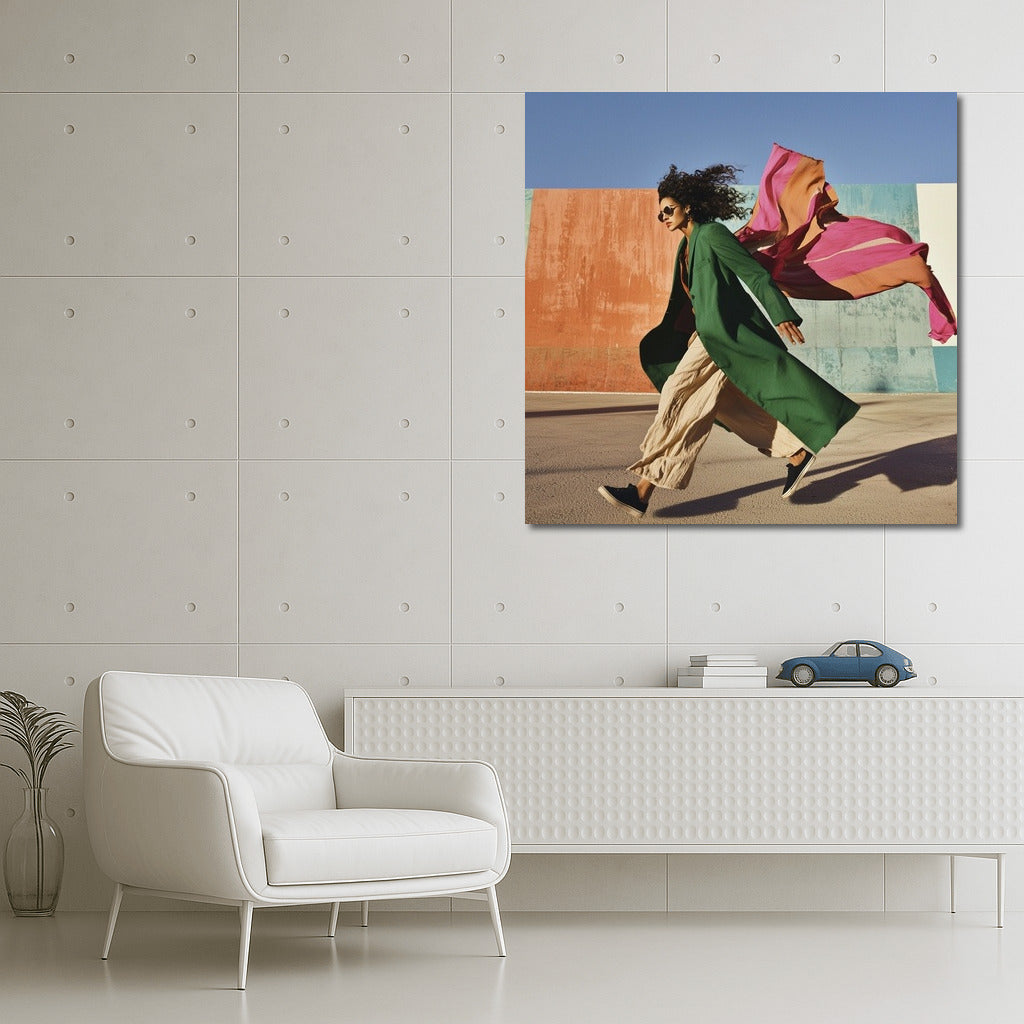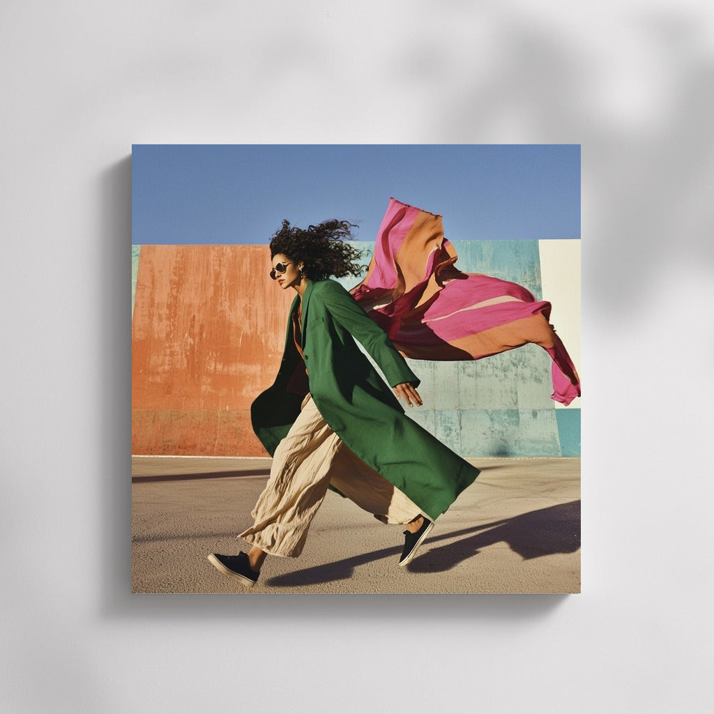 A vibrant poster featuring a dynamic figure in a green coat and fluttering scarf against a backdrop of colorful walls - contemporary wall art. See more from the collection: Fashion Art
