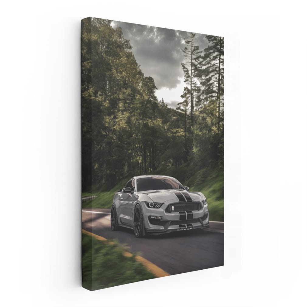 This poster is just fire! A gray Mustang speeds through the forest, leaving behind only a trail of adrenaline. Wall art worthy of any man cave. A painting that will make the heart of every car fan beat faster. Total thrill! See more from the collection: Ford Art