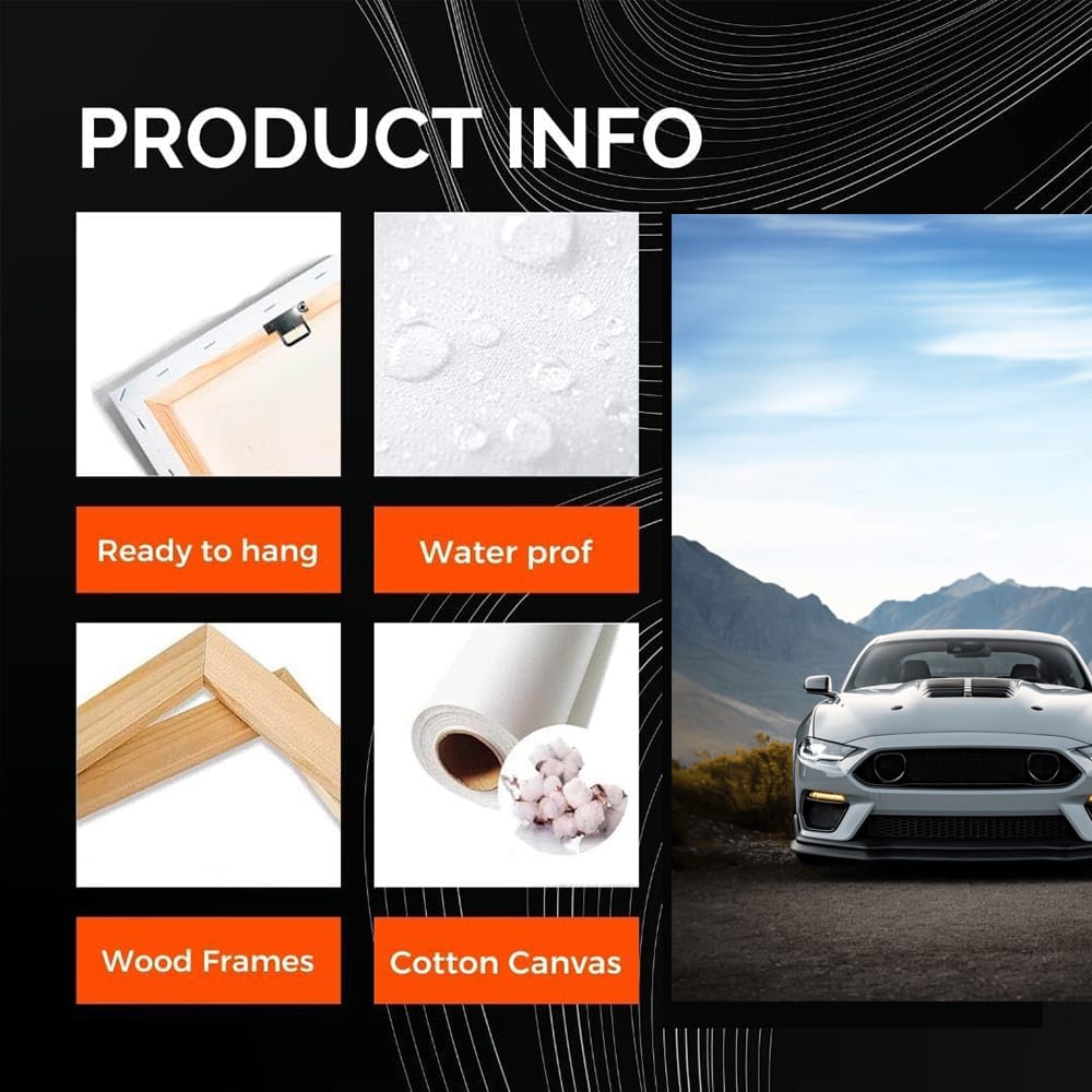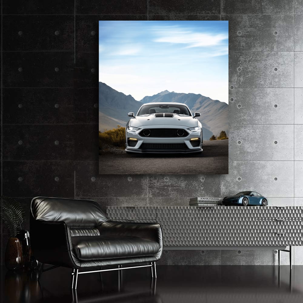 This wall art is a blast! A poster of a grey Mustang racing through the mountains like a wild animal, it gets your adrenaline pumping and makes you want to step on the gas. A painting that makes a car fan's heart beat faster. A perfect thing for the garage! See more from the collection: Ford Art