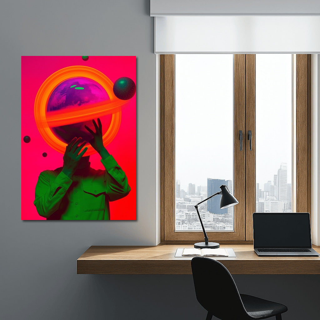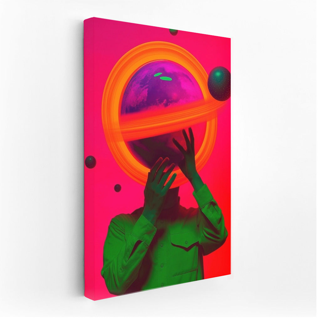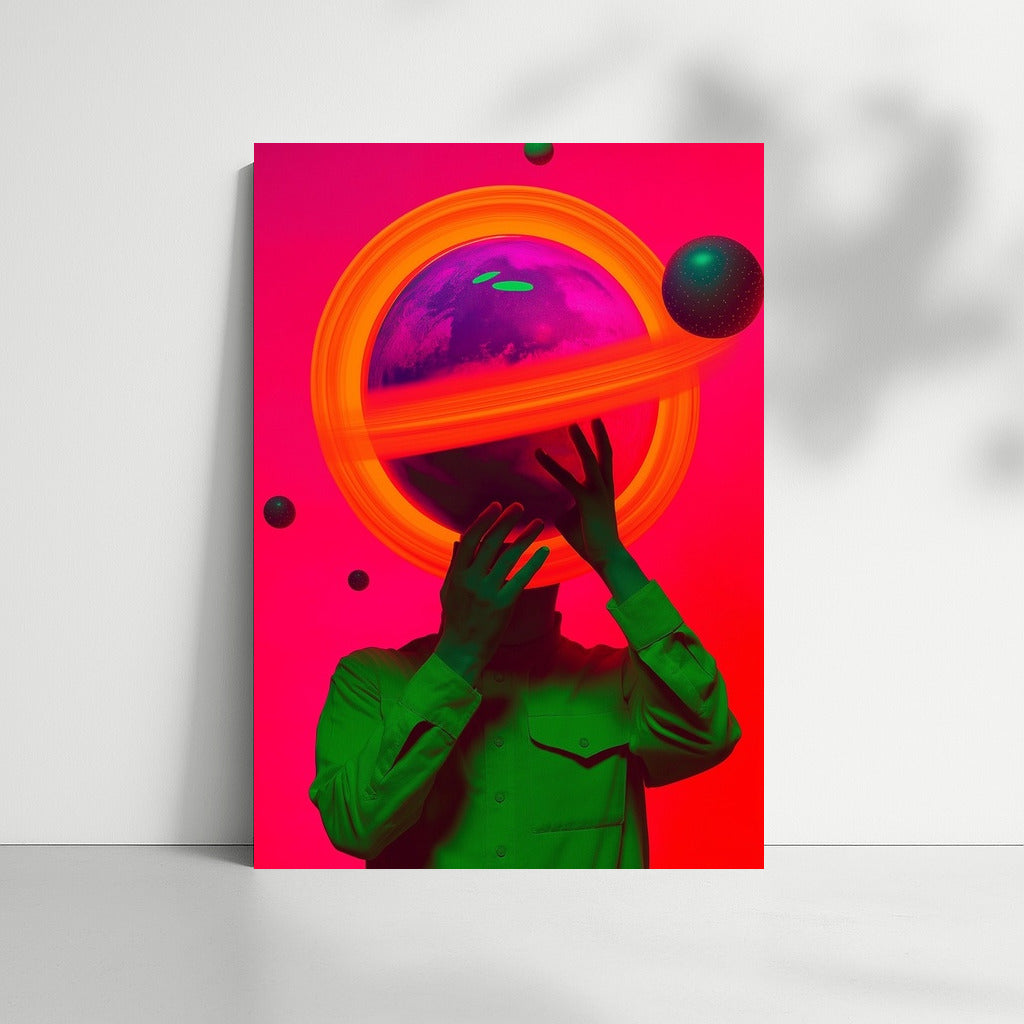 Dive into a space dream with our vibrant poster: a mysterious figure surrounded by planets. Perfect wall art! See more from the collection: Neon Art