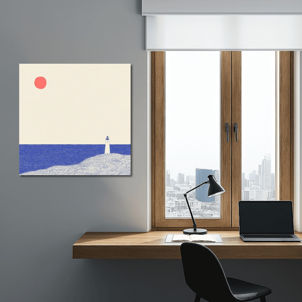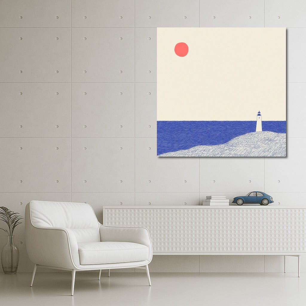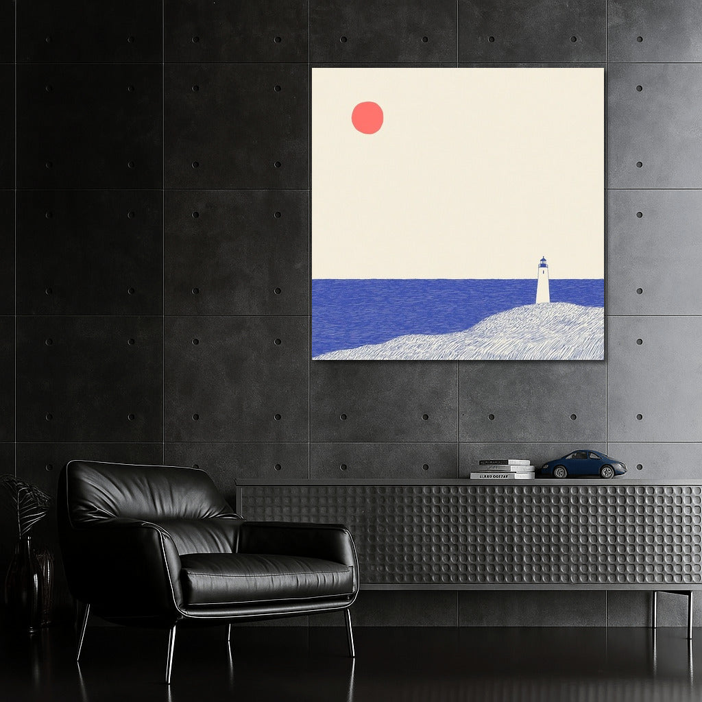Embrace minimalism: a poster with a lonely lighthouse and a bright sun. Perfect wall art for contemplation and coziness. See more from the collection: Mixed Wall Art