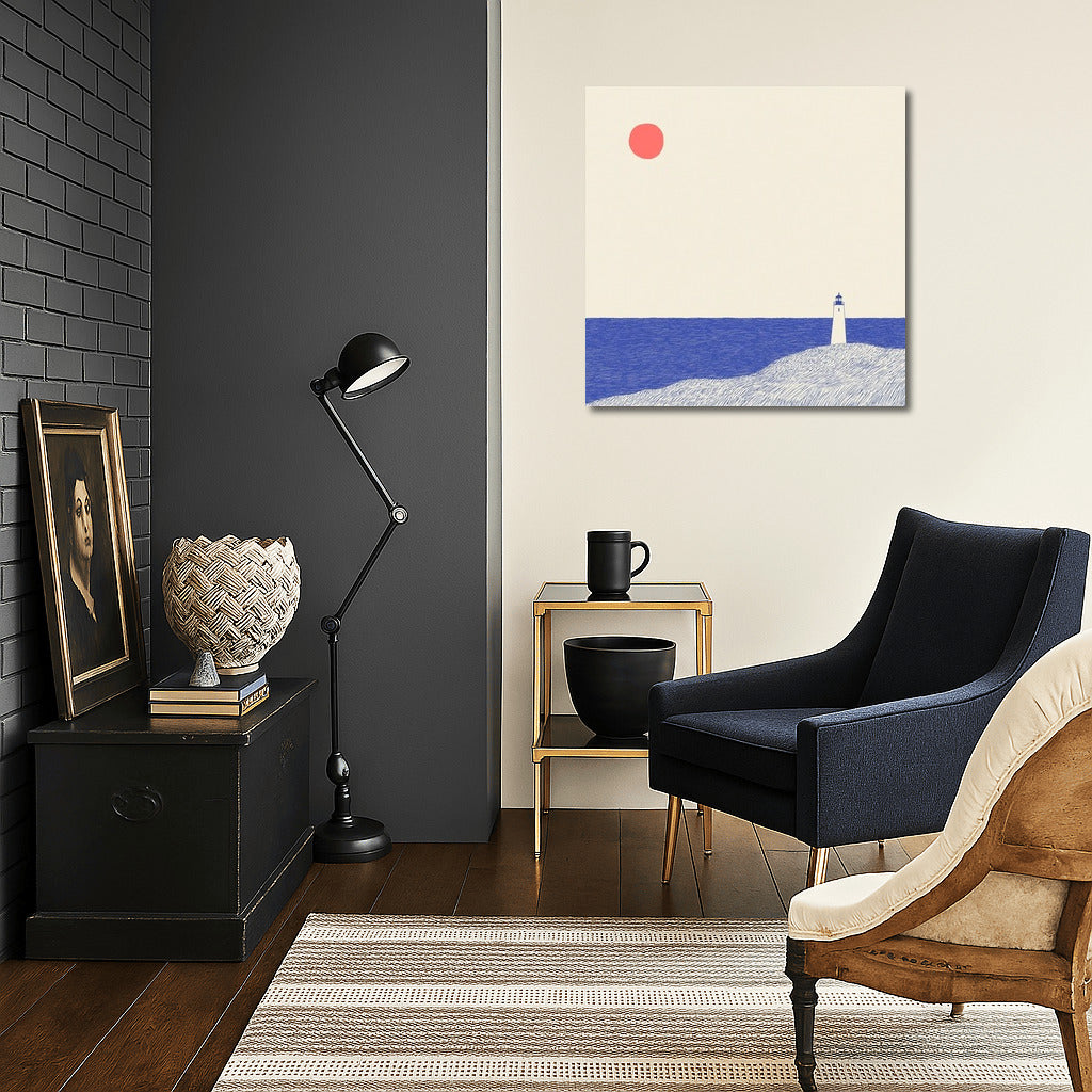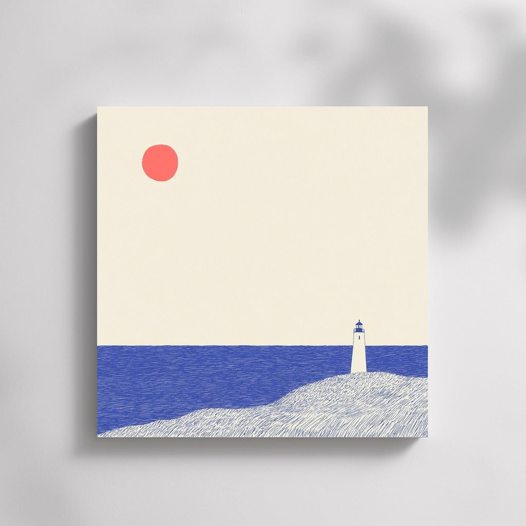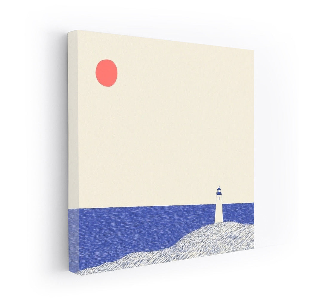Embrace minimalism: a poster with a lonely lighthouse and a bright sun. Perfect wall art for contemplation and coziness. See more from the collection: Mixed Wall Art