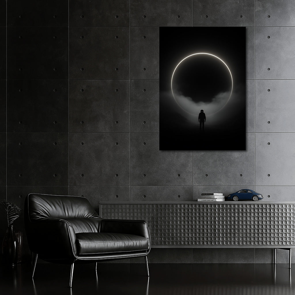Mystery and Mysticism: A poster with a lonely figure in front of a glowing circle. Discover new horizons of wall art in your home. See more from the collection: Mixed Wall Art