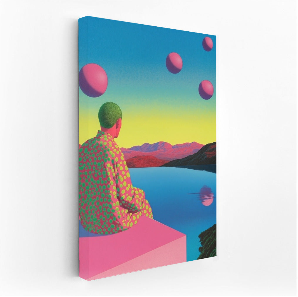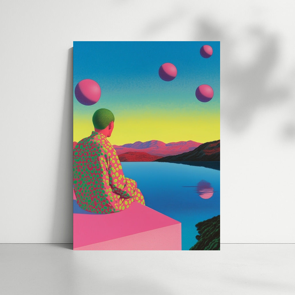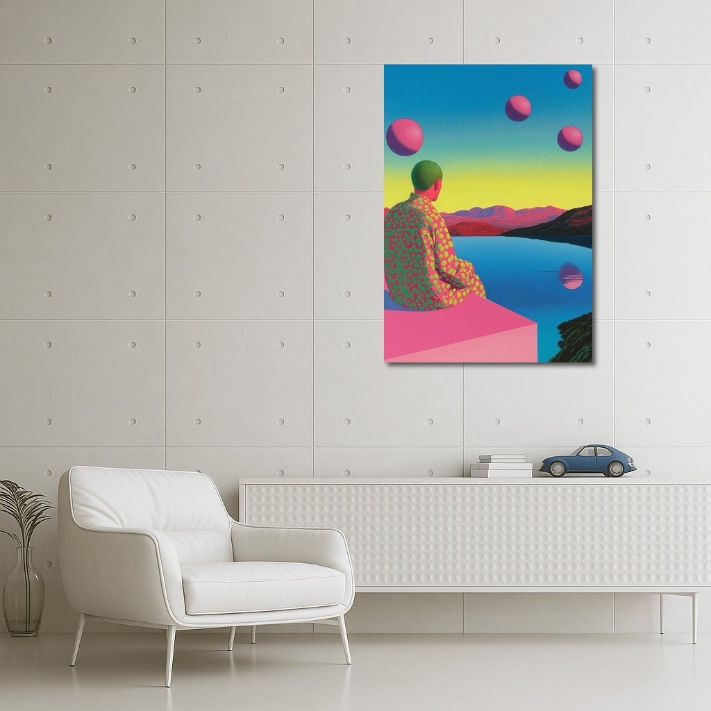 Abstract poster: man on the edge of fantasy. Bright colors and flying spheres create magical wall art. See more from the collection: Pop Art