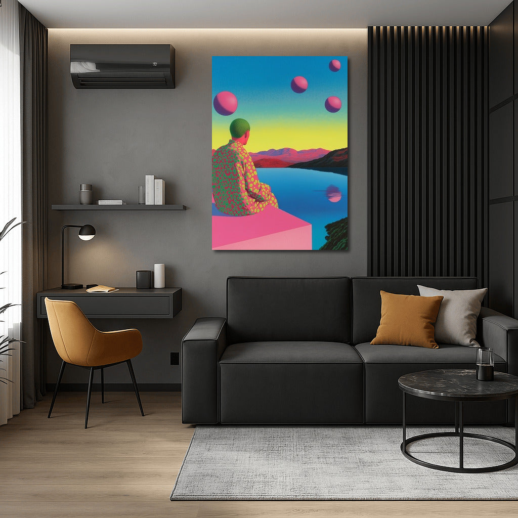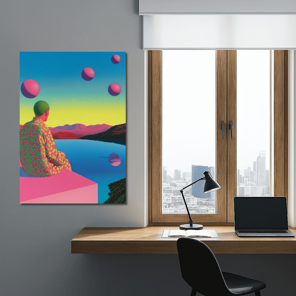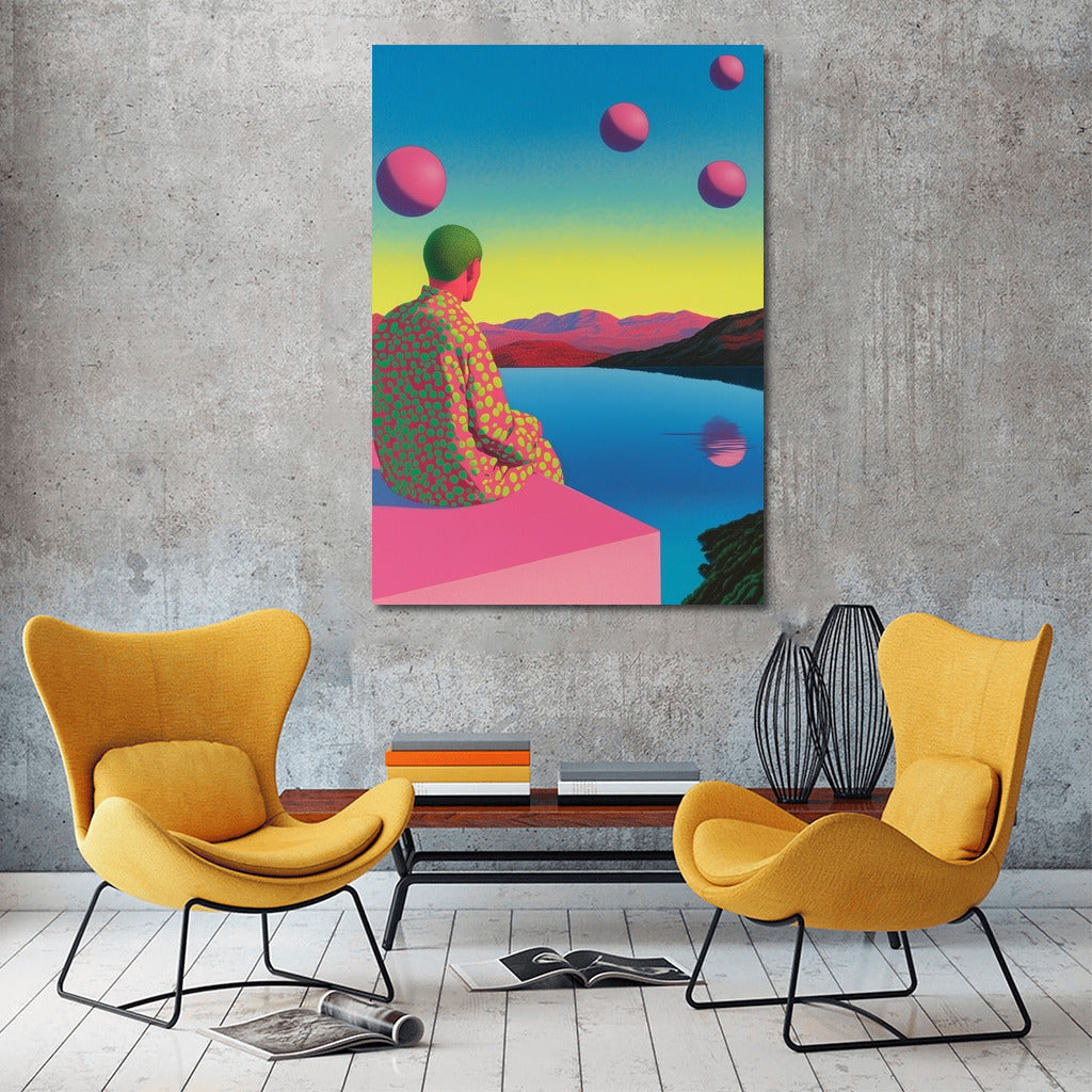Abstract poster: man on the edge of fantasy. Bright colors and flying spheres create magical wall art. See more from the collection: Pop Art