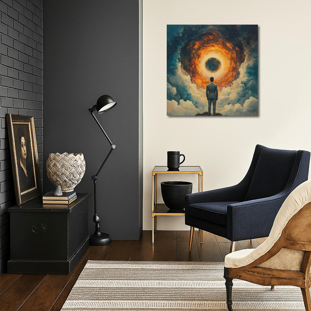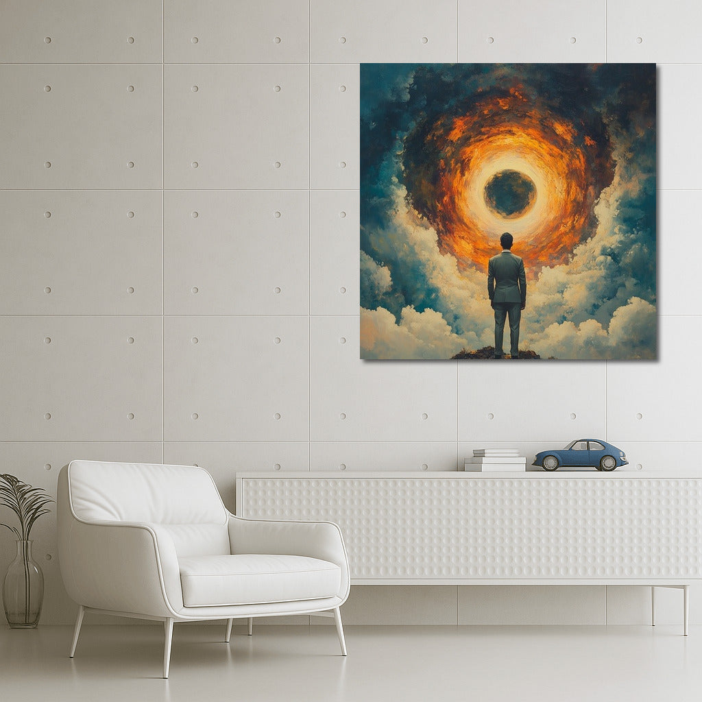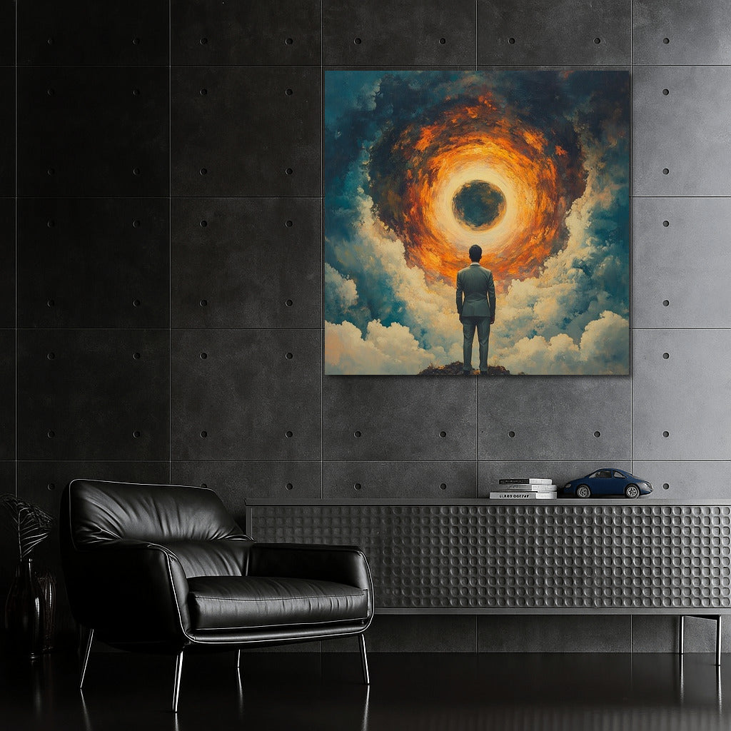 Mysterious painting: figure in front of a flaming horizon. Dive into this amazing world of wall art and fantasy. See more from the collection: Mixed Wall Art