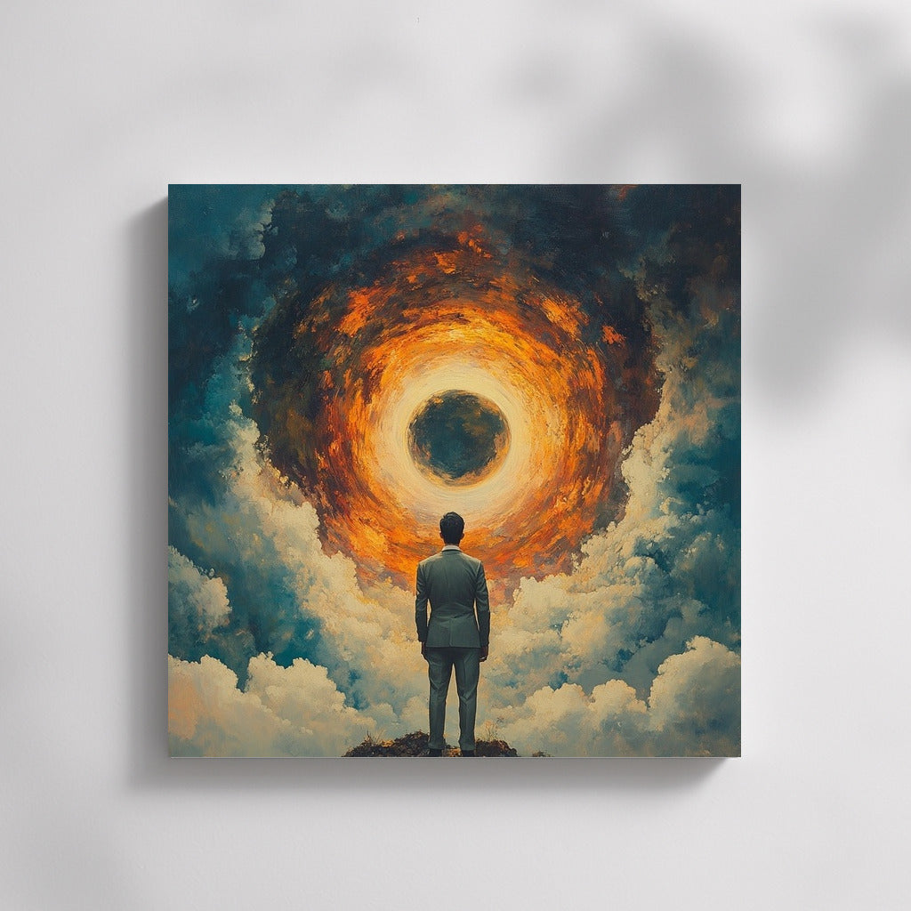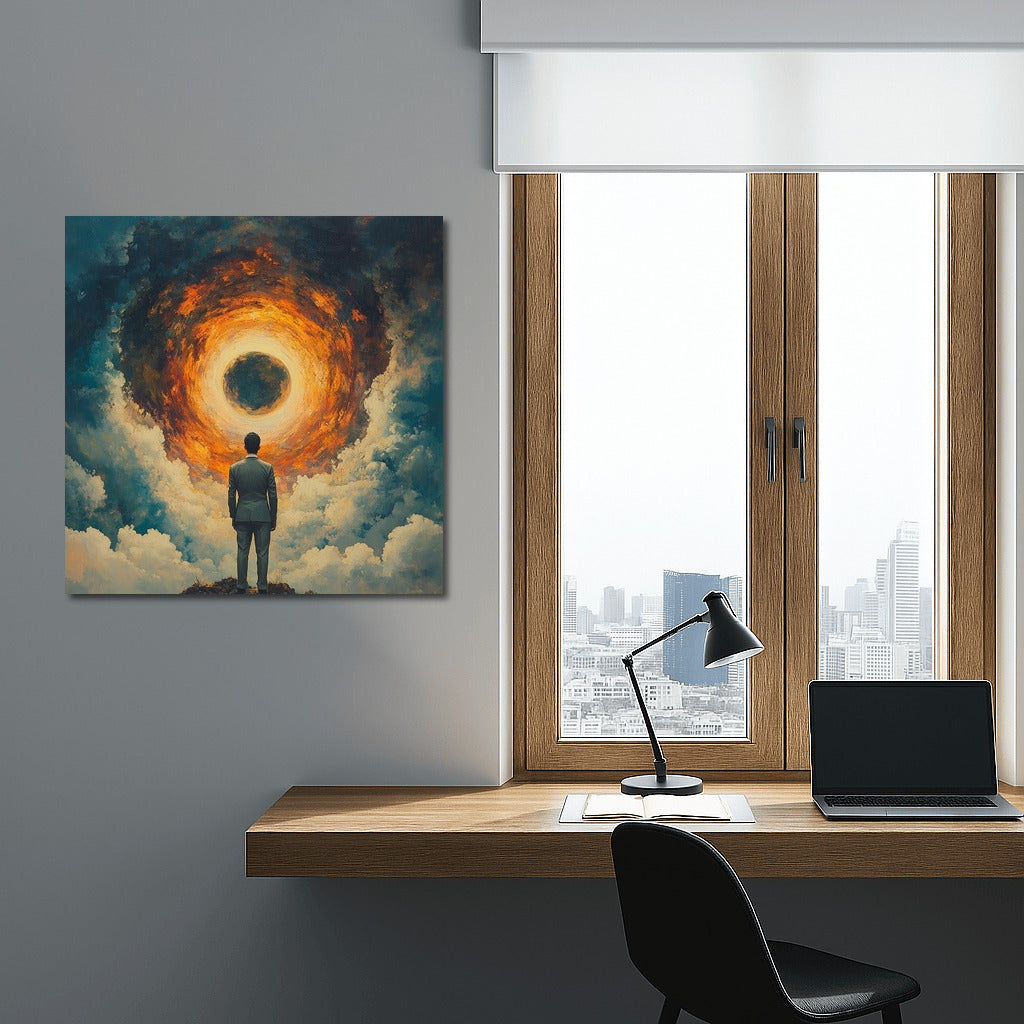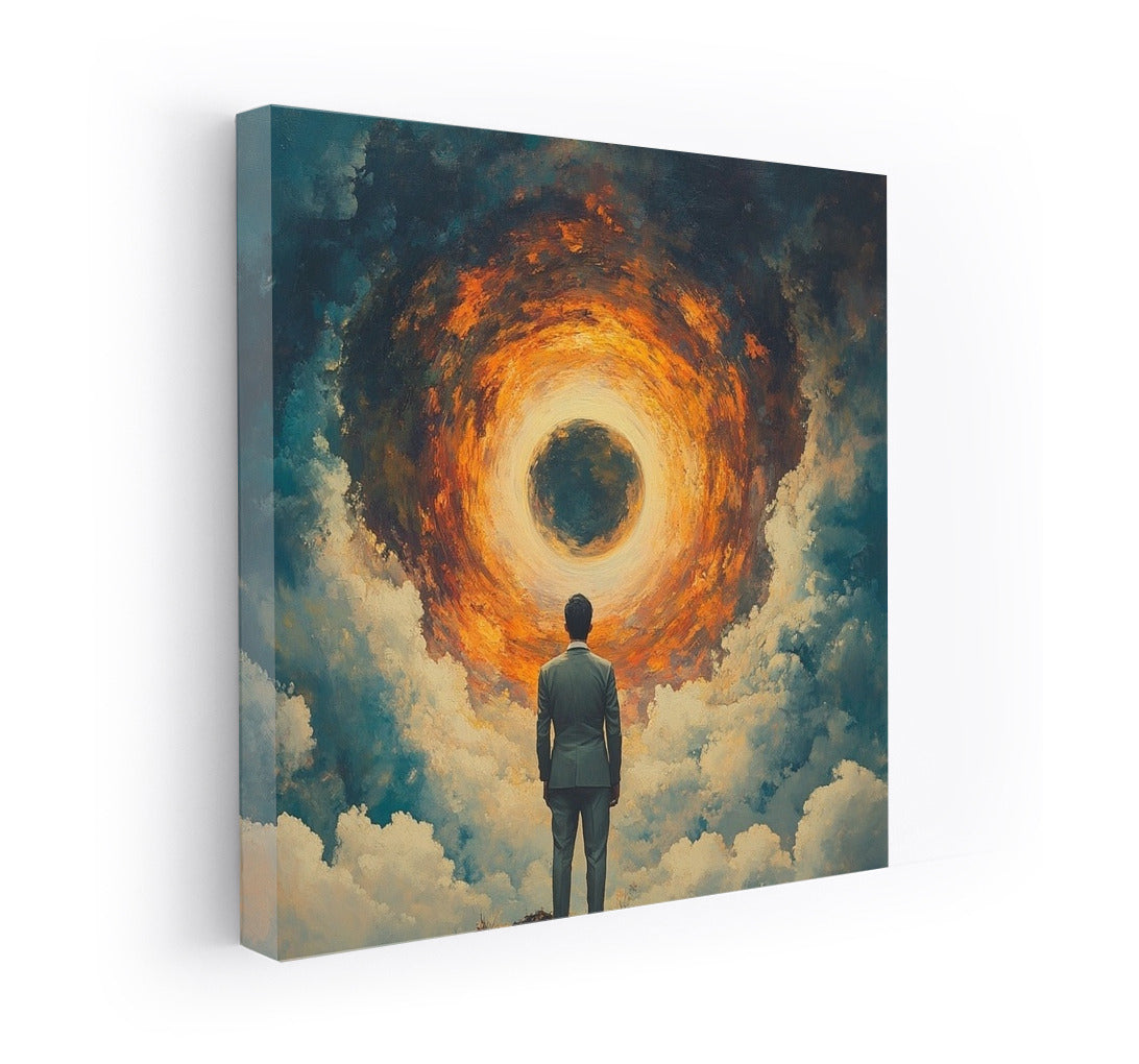 Mysterious painting: figure in front of a flaming horizon. Dive into this amazing world of wall art and fantasy. See more from the collection: Mixed Wall Art